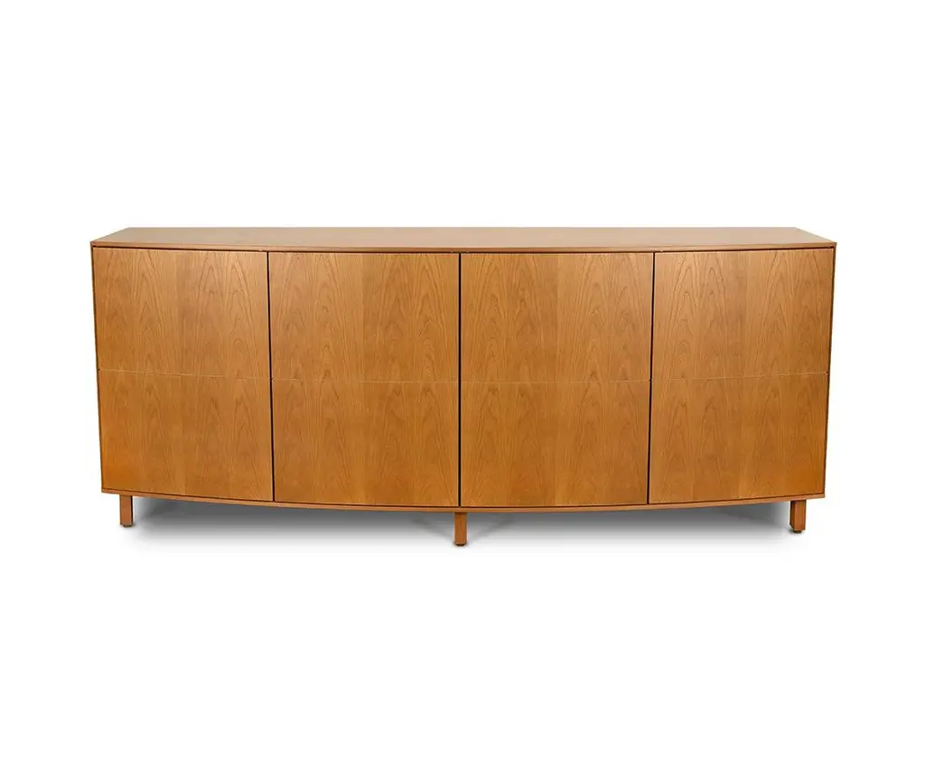 A beautifully curved shape gives the Viborg Sideboard a serene, modern aesthetic that will look elegant in any setting. The uniquely designed front features four doors that appear as eight, highlighting the craftsmanship and natural grain of the veneer. Inside, shelves and two soft-close drawers provide plenty of storage options, while the slim, trapeze-shaped legs in solid wood complete the streamlined silhouette while adding stability.
