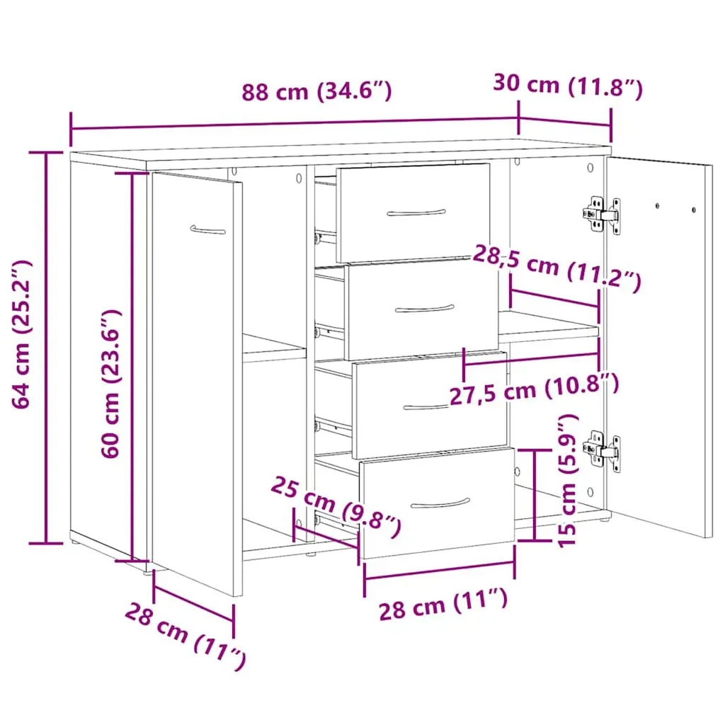 Featuring minimalist charm, this sideboard will satisfy your various requirements and be an ideal complement to your room.Stable and durable material: Engineered wood is a durable and stable material with a smooth surface that is warping, and splitting, making it a reliable choice for a variety of projects.Ample storage space: Equipped with 4 drawers and 2 doors, the side cabinet provides ample storage space to keep your various items well-organised and within reach.Displaying function: The sturdy tabletop is ideal for displaying decorative objects, photo frames, or potted plants.Easy to maintain: The storage cabinet is easy to clean with a damp cloth and requires less maintenance.Warning:To prevent it from tipping over, this product must be used with the provided wall attachment device.