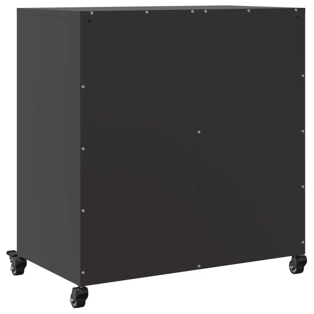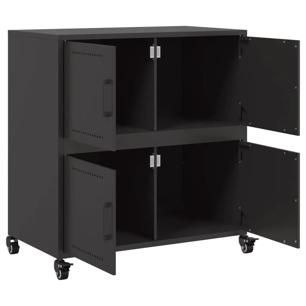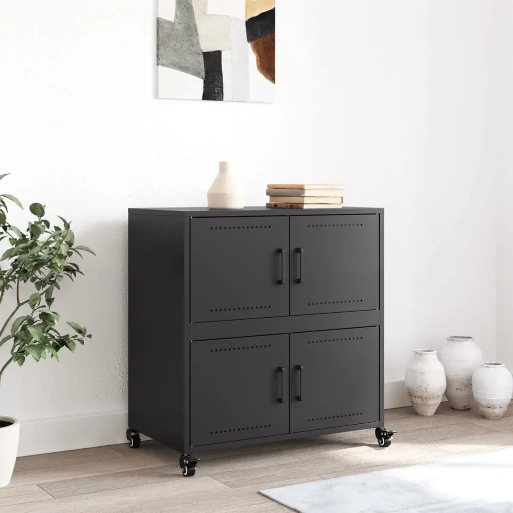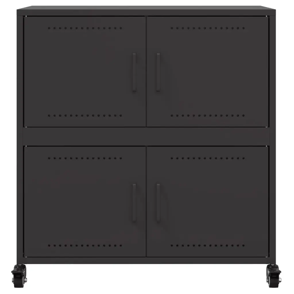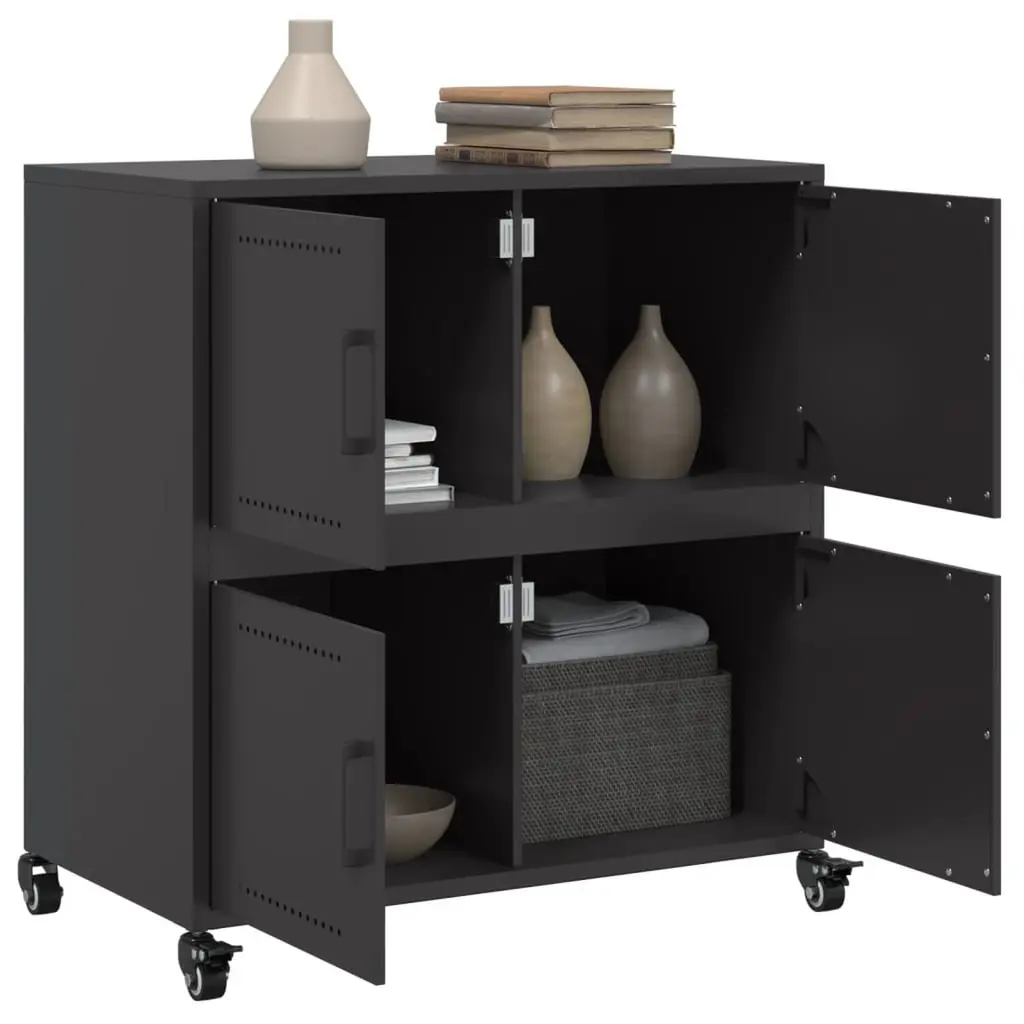 This modern black steel sideboard mixes function with style, making it perfect for contemporary living spaces. Its sleek look not only boosts your room's vibe but also keeps your stuff organized and easy to grab. Ample Storage: With loads of space for books and magazines, this sideboard keeps your essentials sorted and easy to reach. The four doors make it super easy to store various items, perfect for any room.Modern Design: The minimalist style of this sideboard fits in beautifully with various decor styles, mixing functionality with good looks. Its sleek black powder-coated finish adds a touch of sophistication to any space.Portable: With four wheels, this sideboard lets you move it around easily, perfect for those who love to switch up their space.Durability: Made from cold-rolled steel, this sideboard promises to hold up well over time. The powder-coated finish not only protects it from scratches but also keeps it looking shiny and new.Easy Maintenance: Keeping this sideboard clean is a breeze with just a damp cloth, so you can enjoy its beauty without much hassle.