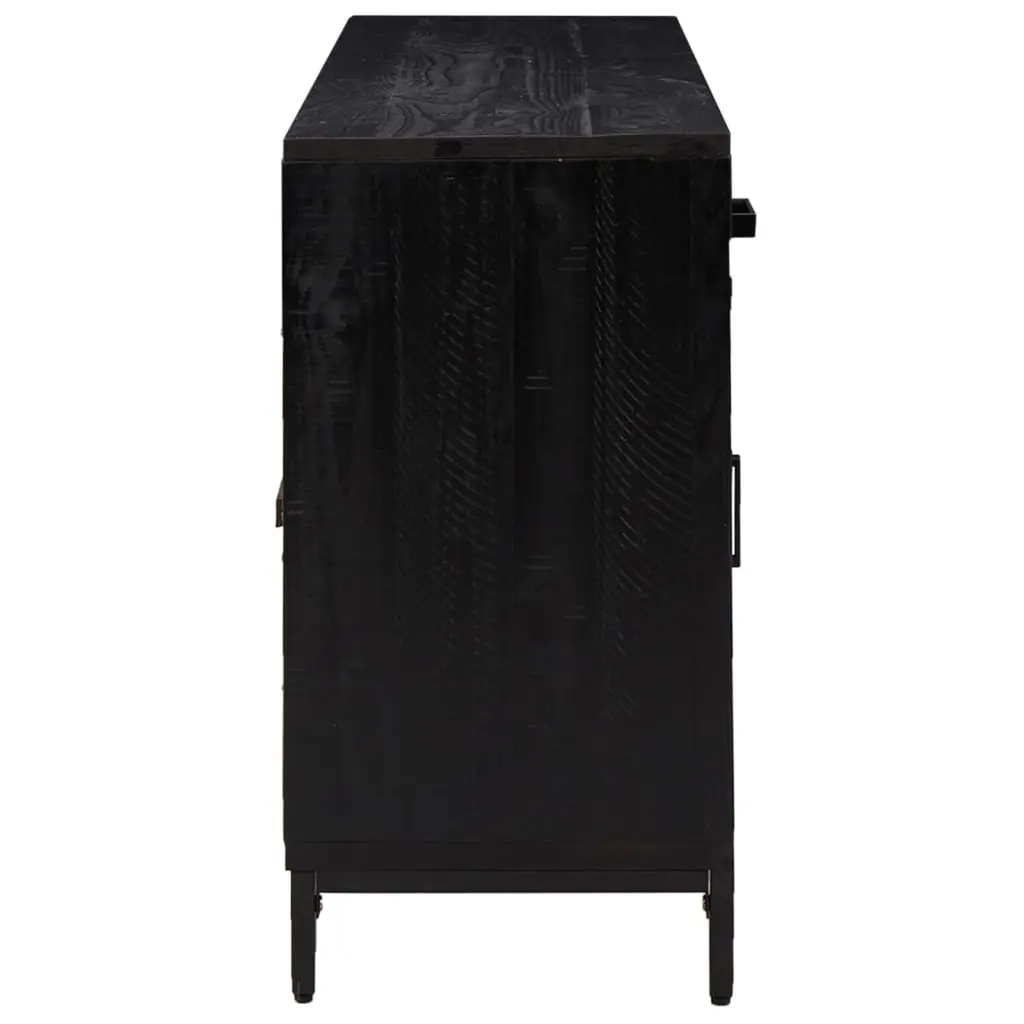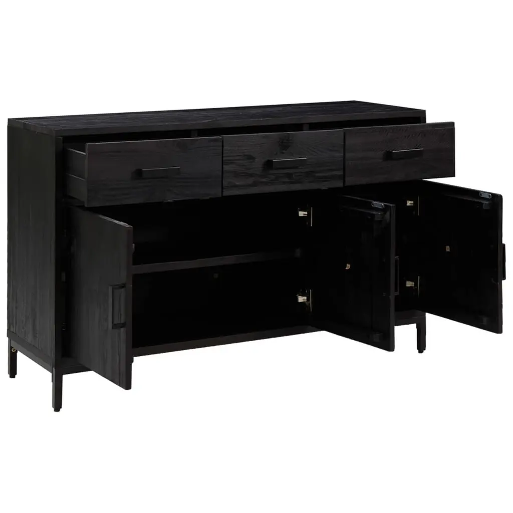 This Vintage Black Solid Pinewood Sideboard adds a classy touch to any living room while also providing practical storage. With its vintage look and solid build, it fits perfectly into both modern and traditional homes, giving your space versatility and character. Wood Construction: Made from solid pinewood, ensuring lasting durability and stability, this sideboard boasts a timeless aesthetic.Spacious Storage: The sideboard includes three spacious drawers and four board shelves, providing ample organization for various living room essentials.Hinge Door Design: With standard hinged doors, accessing your stored items is a breeze while keeping a tidy look.Vintage Finish: The distressed finish adds character, bringing a sense of history and charm to any home decor.Easy Maintenance: Smooth surface makes it easy to clean and care for, protecting against wear and tear over time.
