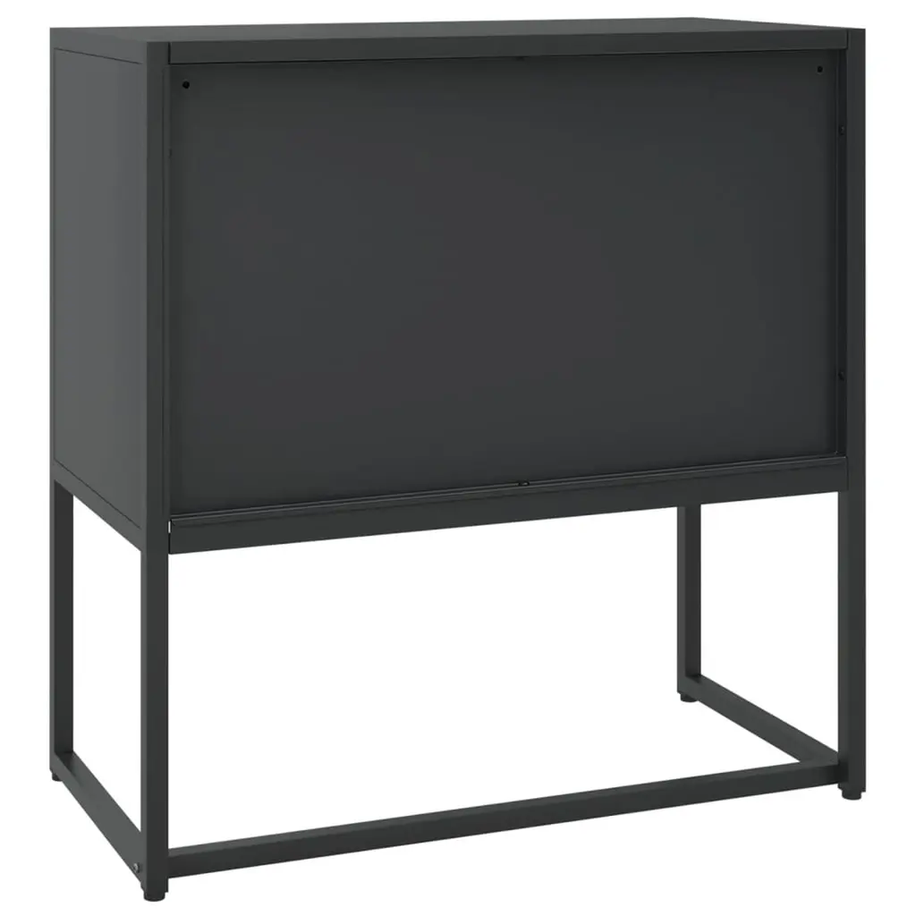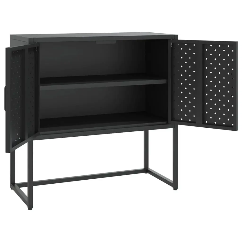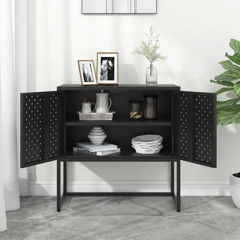 This Modern Black Steel Sideboard is a smart solution for your storage needs and will jazz up your home's look. Its stylish design and sturdy build make it a great fit for dining rooms, living rooms, or anywhere else you need extra storage – a perfect blend of function and flair. Sturdy Construction: Made from high-quality steel, this sideboard is built to last, perfect for everyday use. Its robust frame handles weight and wear, so you can store your valuables without worry. Generous Storage Space: Plenty of storage with two solid doors and one metal shelf. Ideal for organizing dishes, serving ware, or decorative items, keeping your home neat. Contemporary Appeal: The simple design and matte black finish create a sophisticated feel, a versatile addition to your style. It elevates any dining or living space. Easy to Clean: With a smooth metal surface, maintenance is a piece of cake—just wipe with a damp cloth to keep it looking sharp. Perfect Dimensions: At 29.5 in long, 13.8 in wide, and 29.5 in high, this sideboard is practical for both snug and spacious areas. Its size is perfect for various rooms without crowding them.