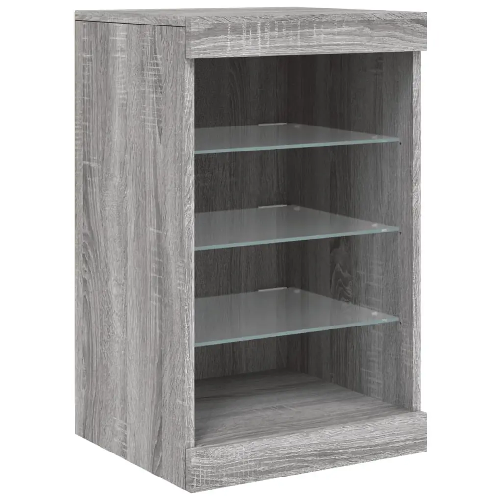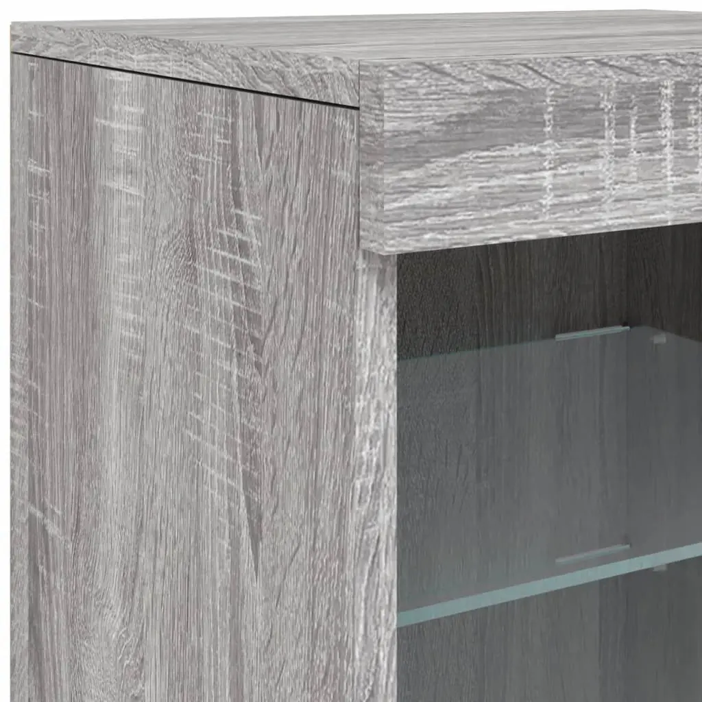 This modern grey sonoma sideboard is all about style and practicality, perfect for today’s living spaces. Made from top-notch engineered wood and decked out with dynamic LED lights, it makes any room look better while giving you the storage you need for your display items and everyday essentials. This sideboard offers heaps of storage with three built-in shelves for nicely displaying your treasured items and decor. Its design makes the most of your space, giving you a practical solution without losing style.The built-in LED lights change the feel of your living area with adjustable settings using a remote. This not only adds functionality but lets you set the right atmosphere for any occasion.Its modern look fits various decorating styles, making it easily blend in with your home. This adaptability means it's a great fit for any space, including as a chic kitchen cabinet.Made from sturdy engineered wood, the sideboard features a smooth texture and a matte finish that elevates its appeal while ensuring durability. The sleek color adds elegance, making it a striking feature of your home.With dimensions of 16.1 in. long, 14.6 in. wide, and 26.4 in. tall, this sideboard is perfect for smaller spaces. You can enjoy all its benefits without overcrowding your room's layout. The product comes with a USB connector, but you won't find the certified 5V USB power source in the box.