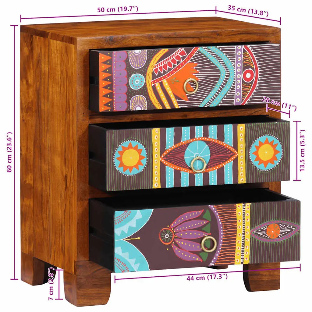 This sideboard is a showstopper for any room, cleverly mixing function with style. Its lively multicolored look and intricate hand-painted designs add a touch of bohemian elegance to your home, making it a stylish pick for your dining area, bedroom, or hallway. Ample Storage: The sideboard has three spacious drawers that make it easy to grab what you need. Stow away dining gear, linens, or other necessities, and keep things stylishly sorted.Artistic Design: With its striking, hand-painted multicolored finish, this sideboard isn't just a pretty face; it reflects a lively lifestyle. Its unique patterns are sure to spark conversations and give your space a stylish boost.Durability: Built from solid acacia wood, this piece is ready for everyday use without losing its charm. Its strong build promises it’ll last, making it a solid addition to your home.Versatile Use: This sideboard fits in anywhere—from a decorative piece in your lounge to practical storage in the bedroom. Its smart design means it blends in with all sorts of decor.Traditional Handles: Stylish ring pulls make the drawers easy to open and close, mixing functionality with flair. This detail adds charm without skimping on practicality.