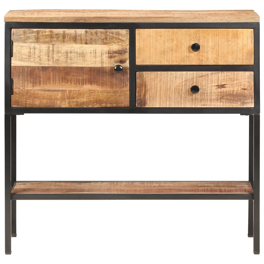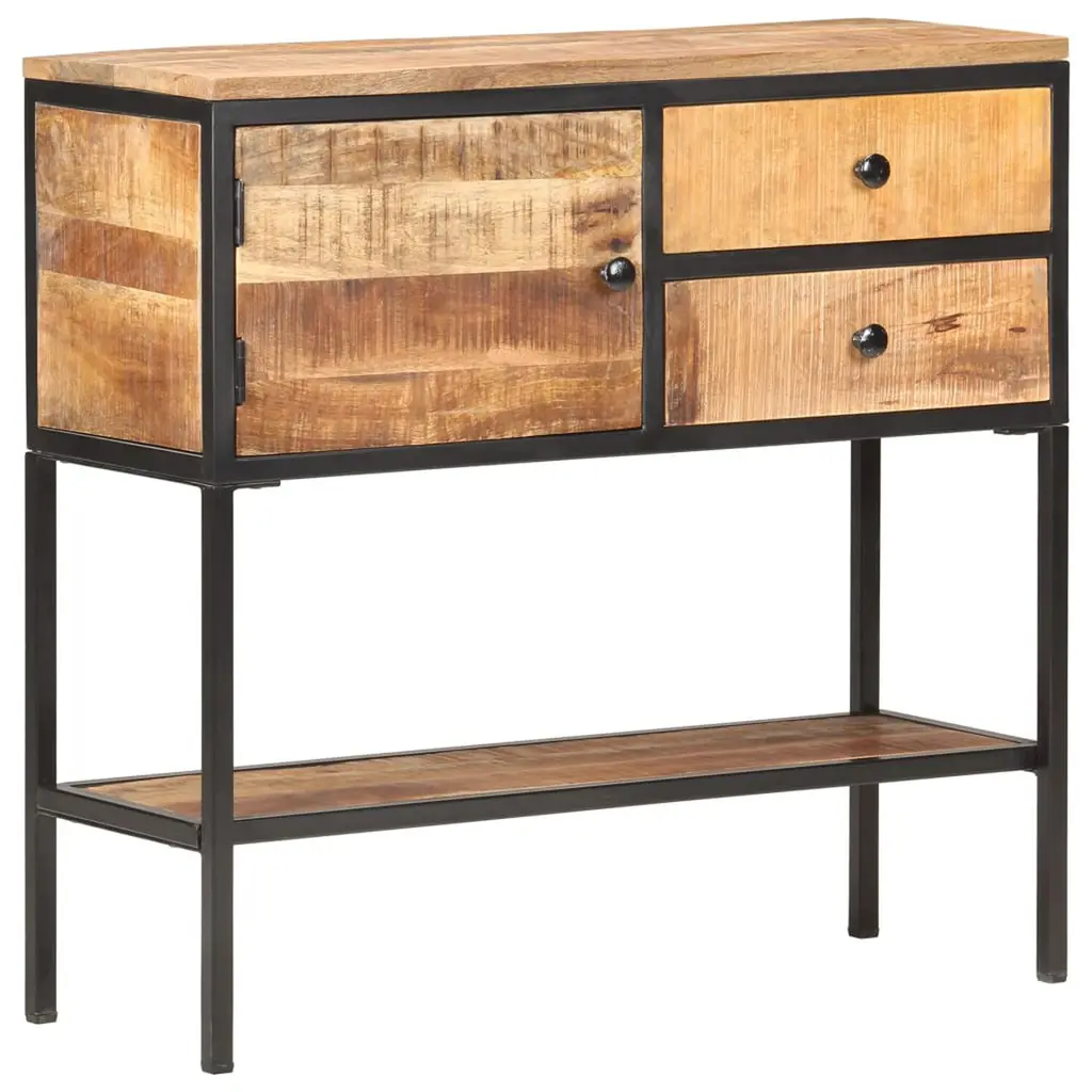 This industrial sideboard is made from rough mango wood, giving it a unique charm that lifts any space. Its striking design and rustic finish add warmth and character, making it a great fit for modern homes or cozy environments. Unique Design: The rough mango wood brings a natural charm, making each sideboard one-of-a-kind, with rich grain patterns that ensure no two pieces are alike.Ample Storage: With two spacious drawers and generous shelving, this sideboard offers great storage options. It’s perfect for keeping your living area tidy while displaying your treasured decor.Sturdy Framework: Built with a strong black iron frame, this sideboard promises stability and durability for everyday use.Versatile Use: Use it as a buffet for serving guests or as a plant stand. It’s also fab for hallways, adding organization and style.Easy Maintenance: Just a quick wipe with a damp cloth keeps it looking great. Best to avoid harsh chemicals for longevity.