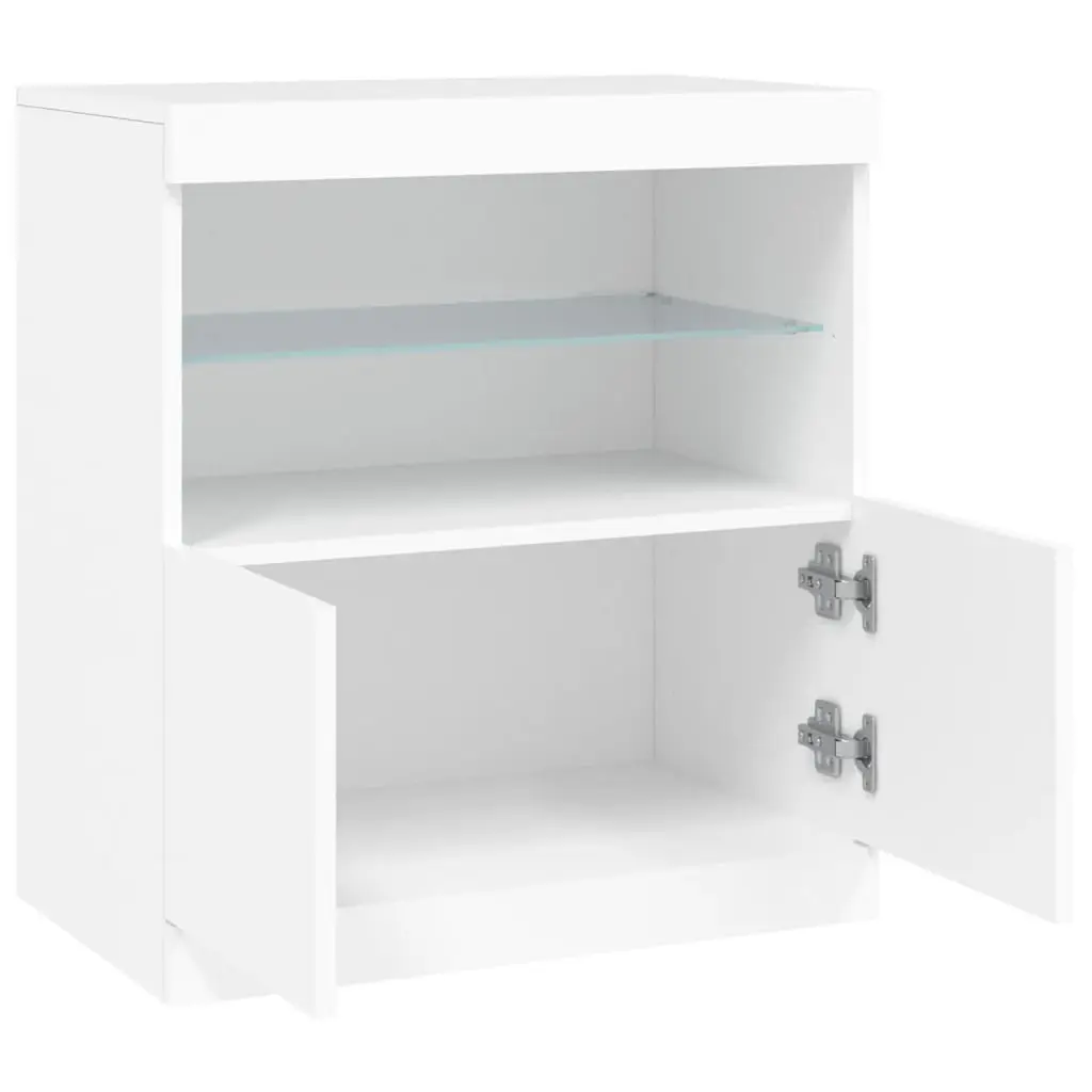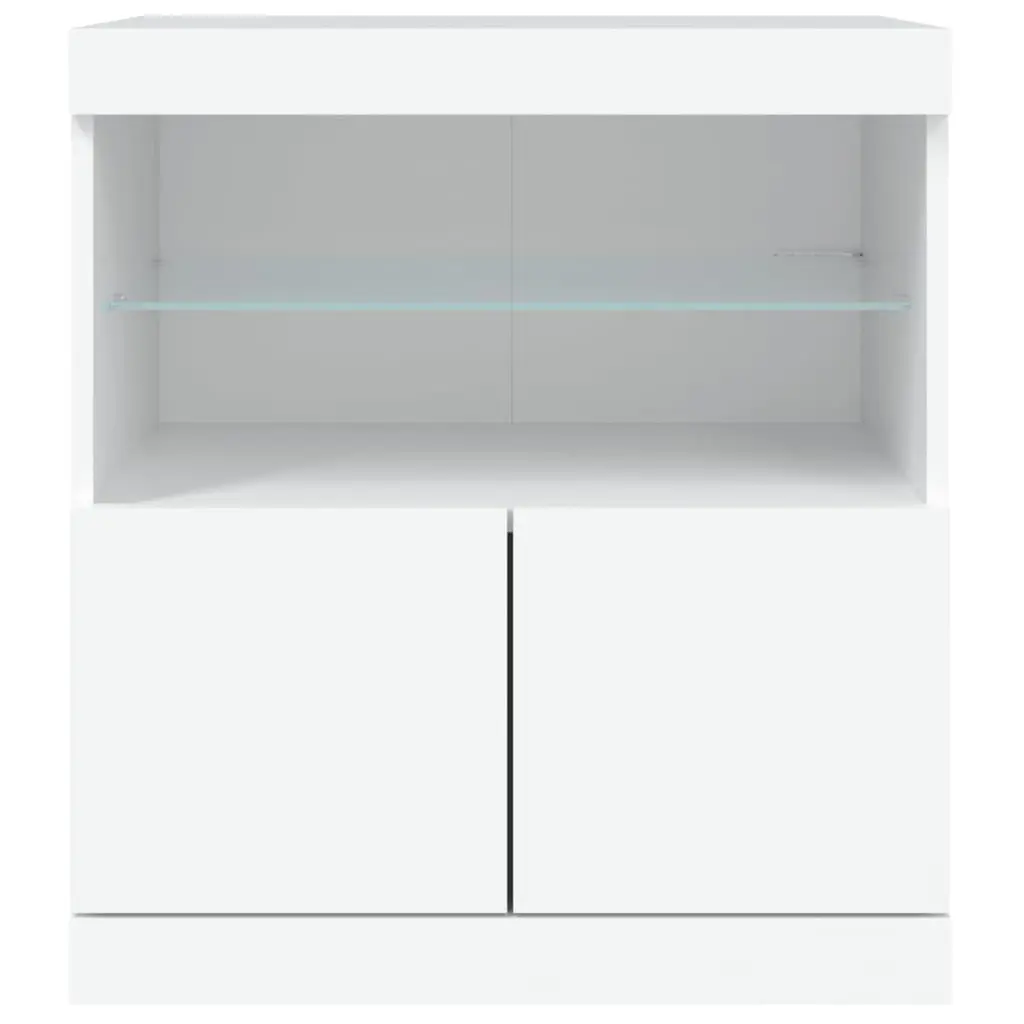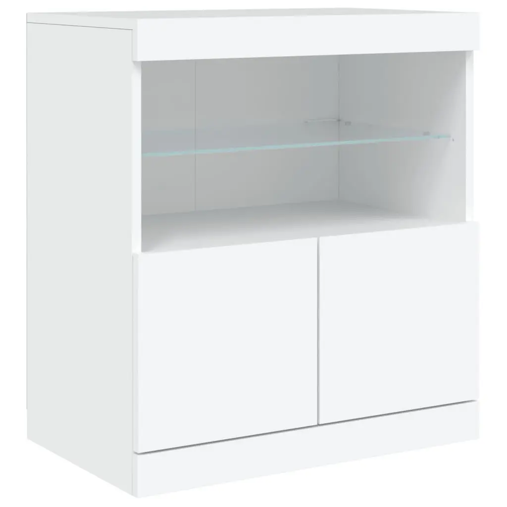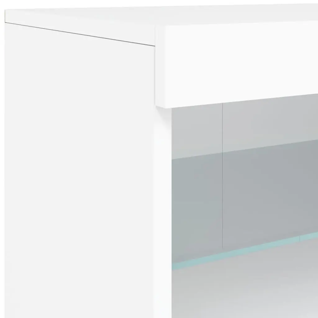 This modern sideboard is a classy storage option that’ll spruce up any room. Made from engineered wood with a pristine white finish, it’s sleek and fits right in with contemporary styles. The dynamic RGB LED lighting is perfect for showing off your decor or storing everyday stuff, making it both a practical and stylish choice for your hallway, dining room, or living area. Built-In RGB Lighting: Light up your space with LED lights you can control remotely, letting you change patterns and colors to create a nice vibe.Ample Storage Space: With two roomy compartments, it’s perfect for tidying up stuff like magazines, books, or remotes, keeping your space neat.Stylish Design: Its modern look, with clean lines and minimal fuss, works with all kinds of decor styles, adding a touch of sophistication.Quality Material: Made from engineered wood and glass, this sideboard is durable and moisture-resistant, ensuring it lasts and is easy to keep clean.Versatile Use: Great for serving food at gatherings as a buffet or used as a display unit, this sideboard is just as functional as it is trendy. The product comes with a USB connector, but you won't find the certified 5V USB power source in the box.