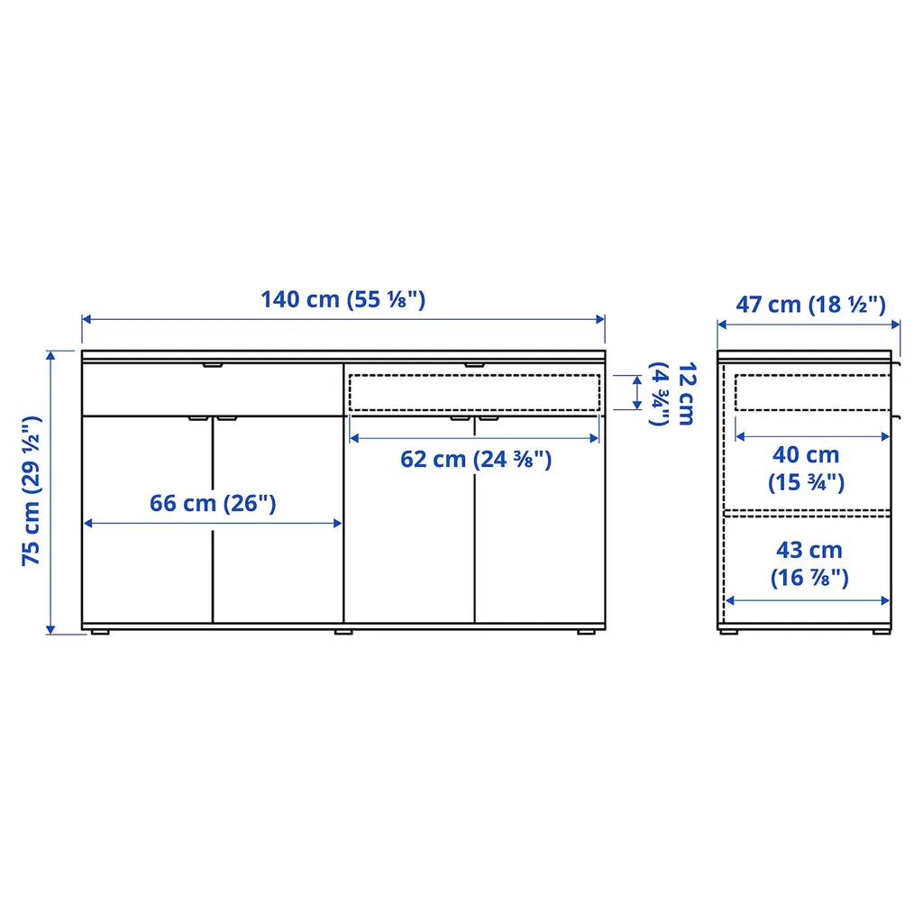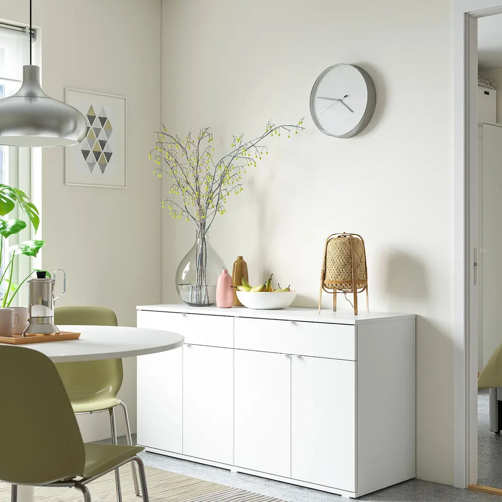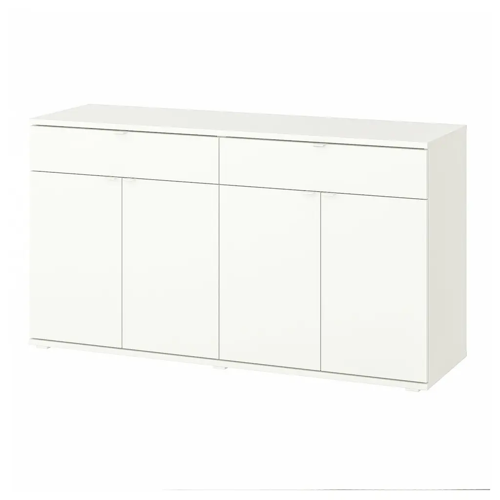 VIHALS Sideboard - white 55 1/8x18 1/2x29 1/2 ". Use throughout the home, as a standalone or with other VIHALS furniture. The 14.5 inch depth means that the sideboard easily fits even in tight spaces, such as a hallway or smaller dining area. 1 adjustable shelf behind each door. Handles included.