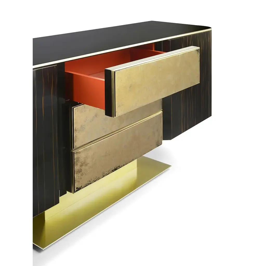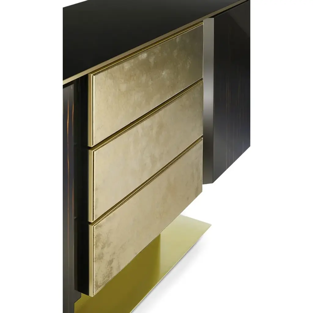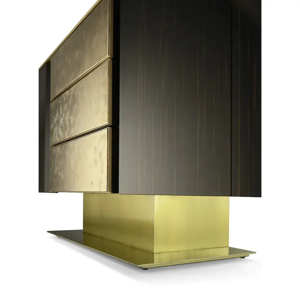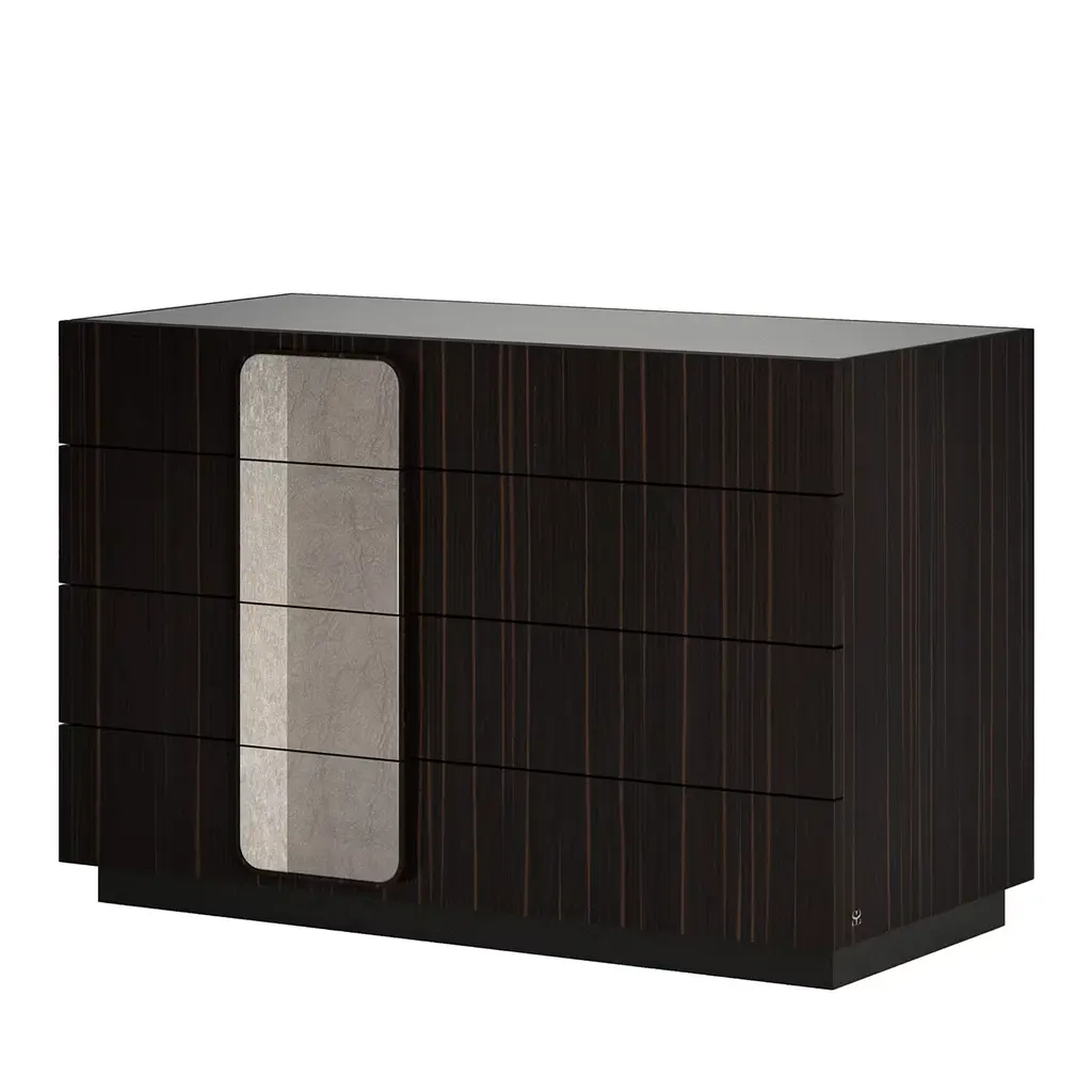 Two doors sideboard and three drawers with ceramic tiles and metal base. Lacquered interior with extra clear glass shelves. Available in different veneers and glazes combinations.Net Weight Kg150MaterialsWood/Glass/Ceramic/MetalPicture finish02728G N1 M2 EBANO BLACK LUCIDO+CERAMICA RAY PLATINUMThe Vincent line includes furniture that testify the highest quality standard of Marioni production. Every single detail is perfectly designed and reflects the commitment and professionalism of our masters. Furniture with finishes of great value in precious veneers and glossy lacquers. The handles can be customized with several ceramic finishes.