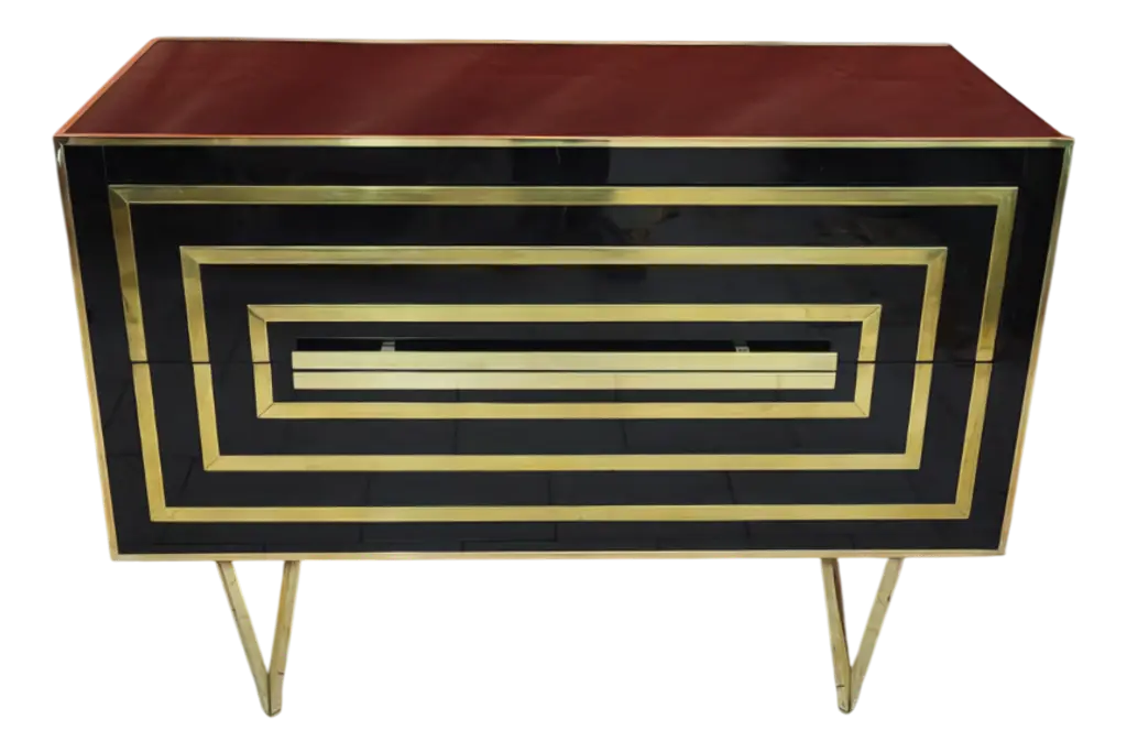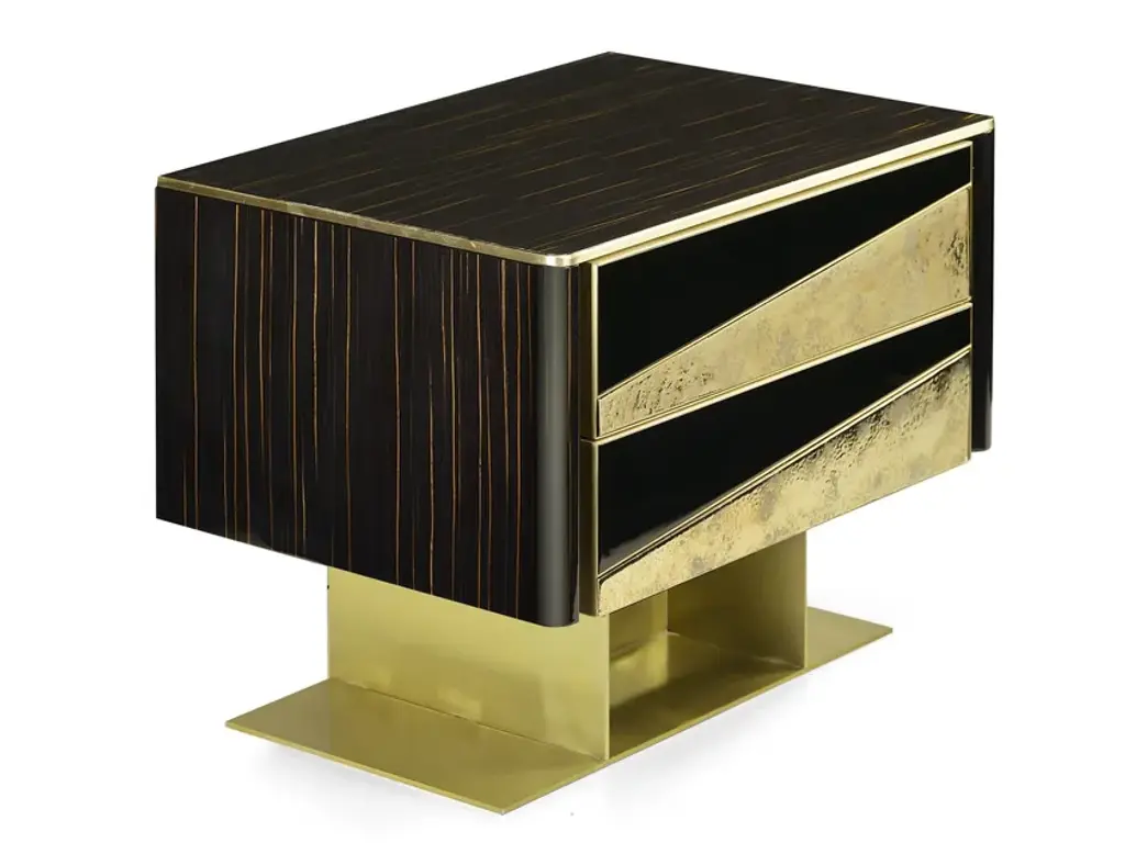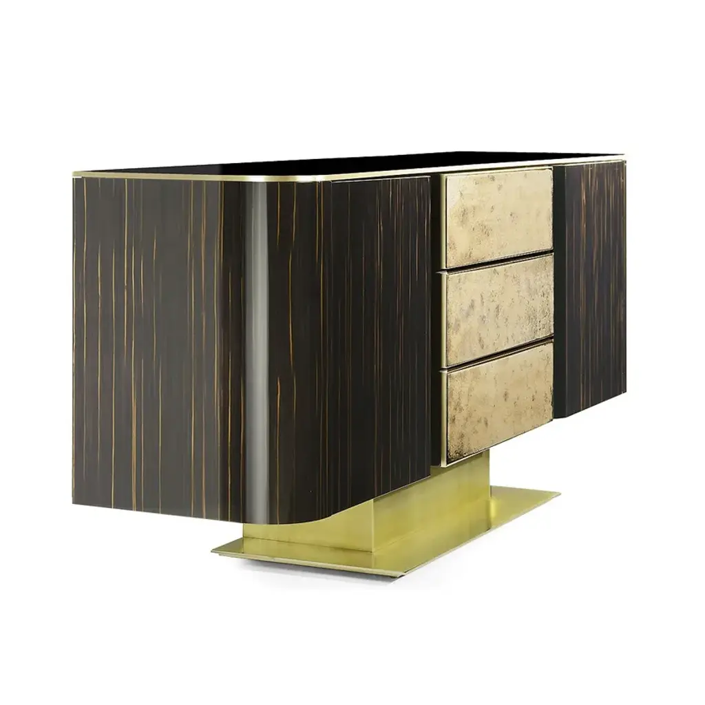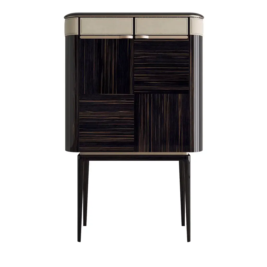 Two doors sideboard and three drawers with ceramic tiles and metal base. Lacquered interior with extra clear glass shelves. Available in different veneers and glazes combinations.Net Weight Kg150MaterialsWood/Glass/Ceramic/MetalPicture finish02728G N1 M2 EBANO BLACK LUCIDO+CERAMICA RAY PLATINUMThe Vincent line includes furniture that testify the highest quality standard of Marioni production. Every single detail is perfectly designed and reflects the commitment and professionalism of our masters. Furniture with finishes of great value in precious veneers and glossy lacquers. The handles can be customized with several ceramic finishes.
