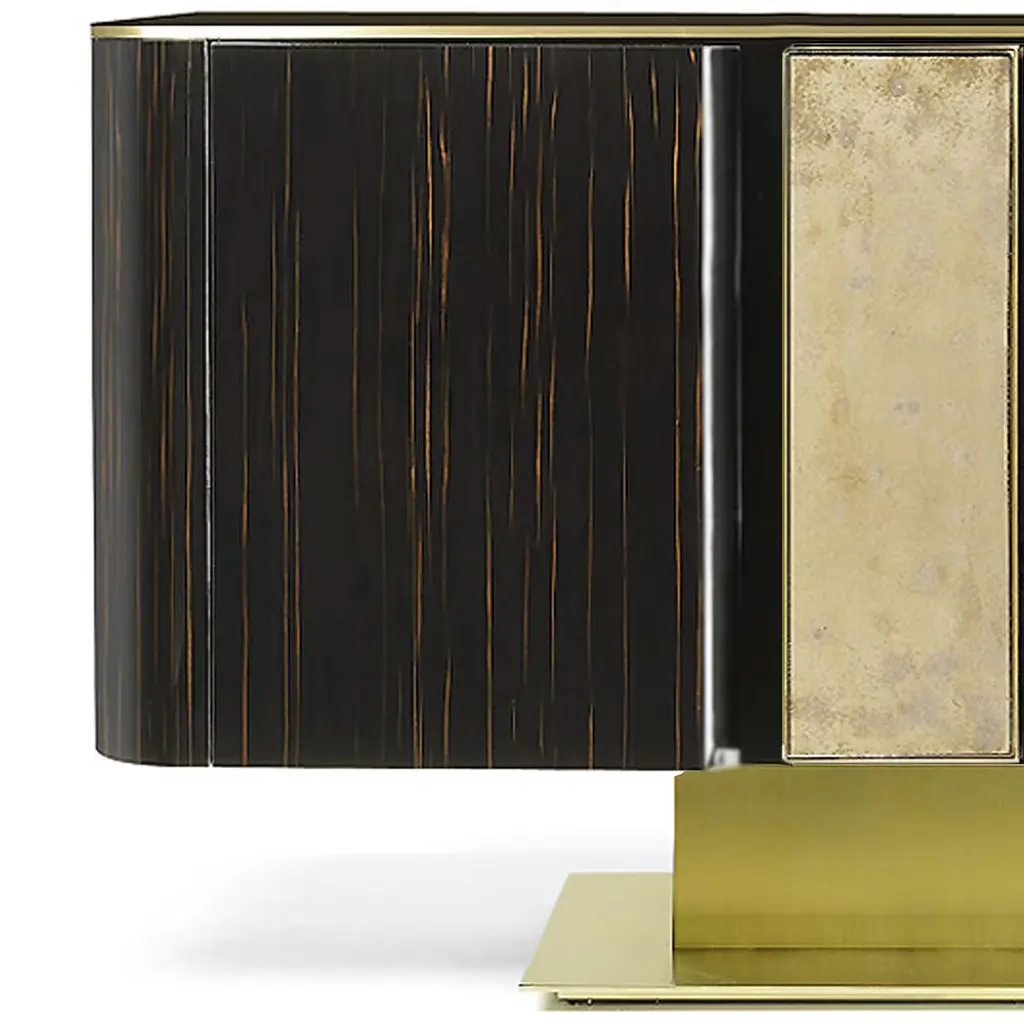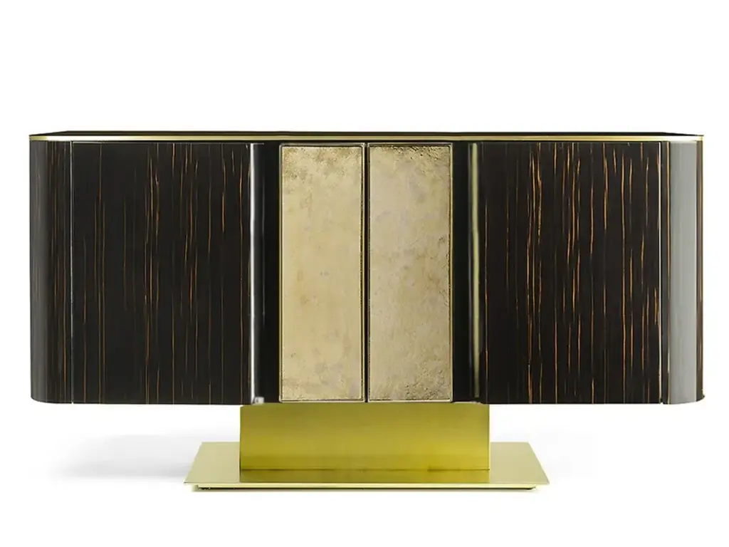 This sophisticated and lavish sideboard designed by Studio 63 for Marioni is primarily made of wood and features a metal base and double black doors with elements in ceramic. The interior features extra clear glass shelves. Upon request, the piece is available in different materials and colors.