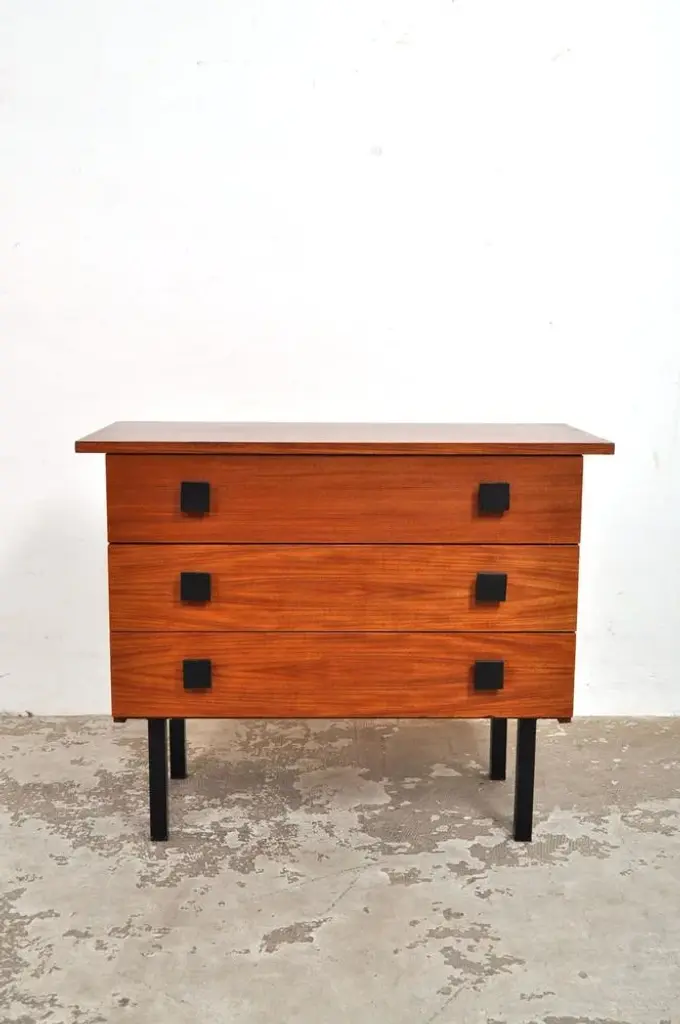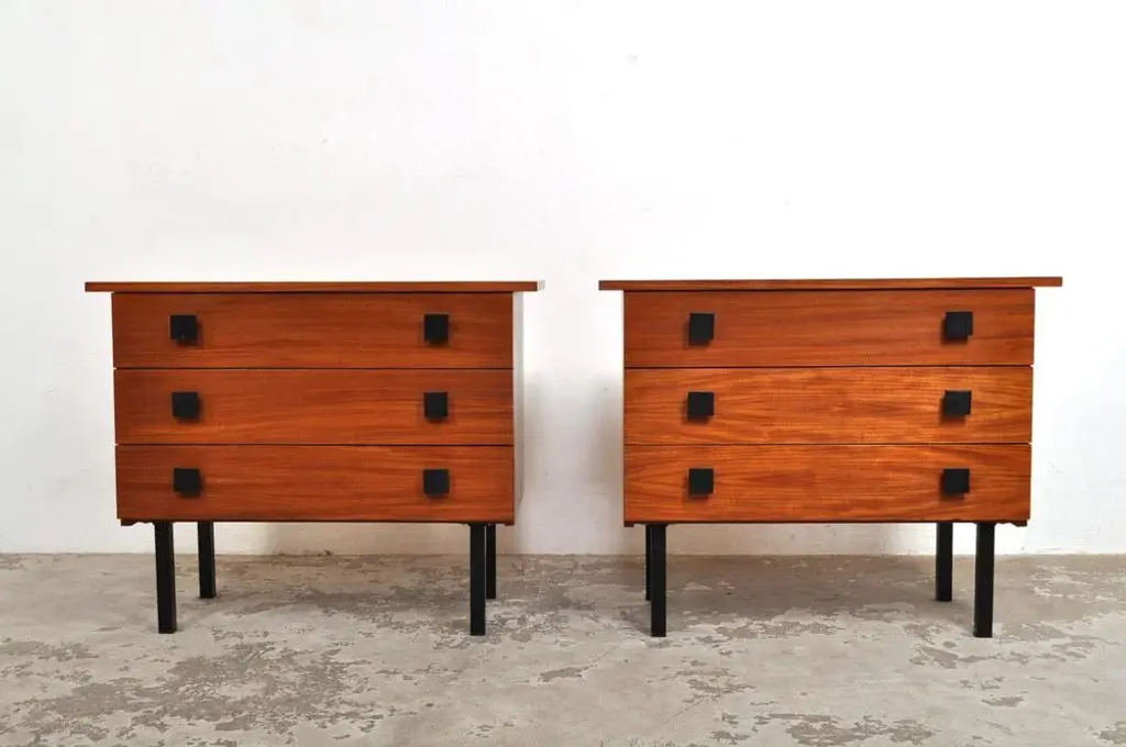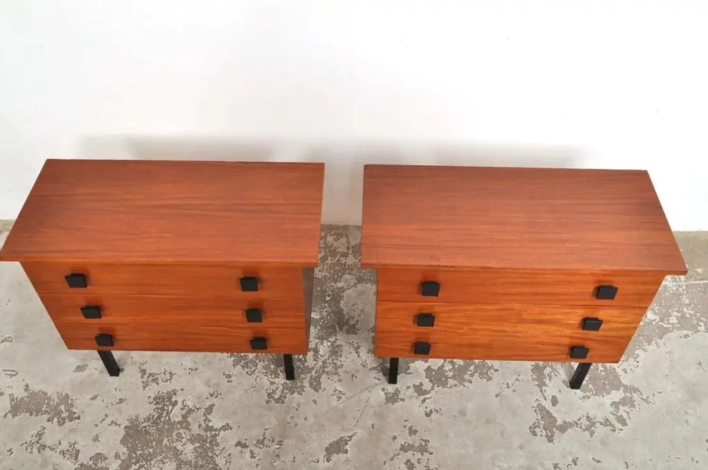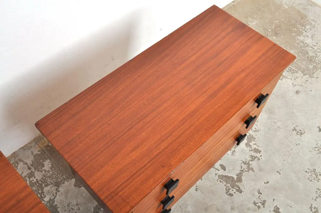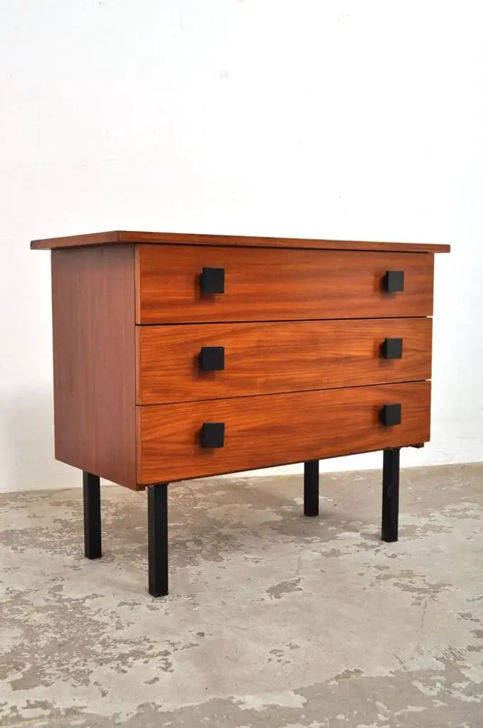 A charming set of 1950s teak cabinets. Beautiful, striking wooden handles and black steel legs. dimensions: w75 cm x d35 cm x h60 cm internal drawer dimensions: w60 cm x d30 cm x h10 cm (3x