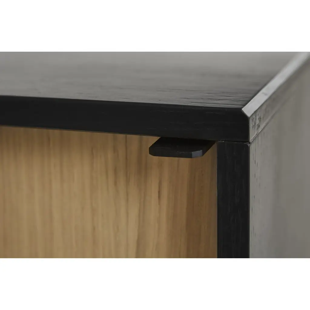 The Virka sideboard by Woud can be used as a side table and elegant storage cabinet for tableware, clothes, office supplies, etc. A collaboration of Danish design studios Røpke Design and MOAKK, the Virka sideboard consists of an airy metal frame and an oak veneer cabinet with black, horizontal stripes on one door. Behind the sliding doors, you’ll find adjustable shelves, and the backboard is equipped with holes to let cables in.