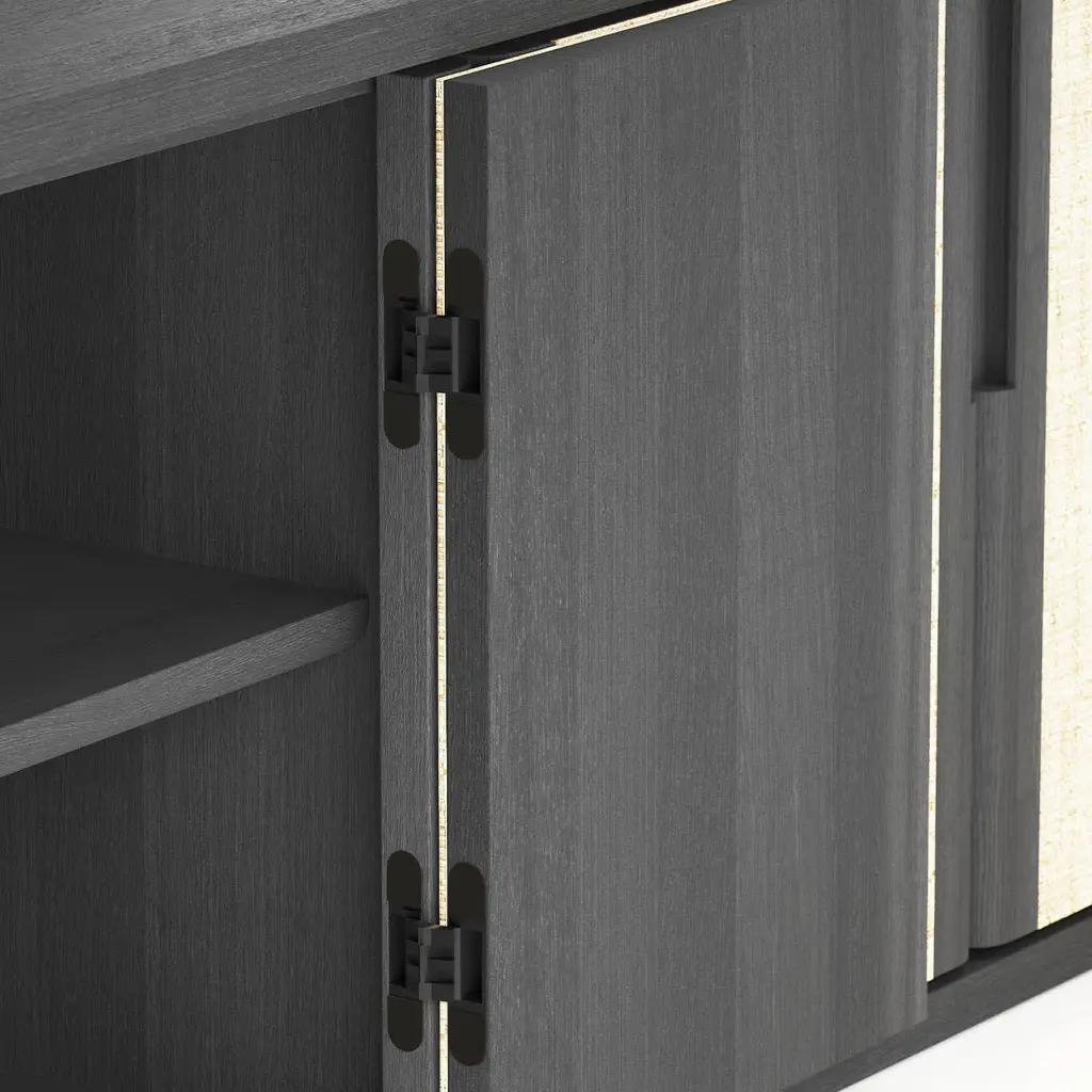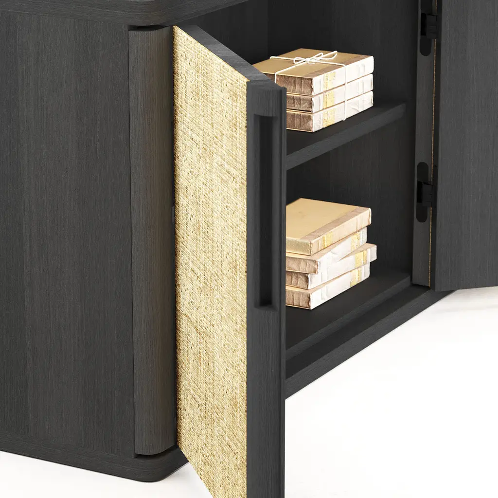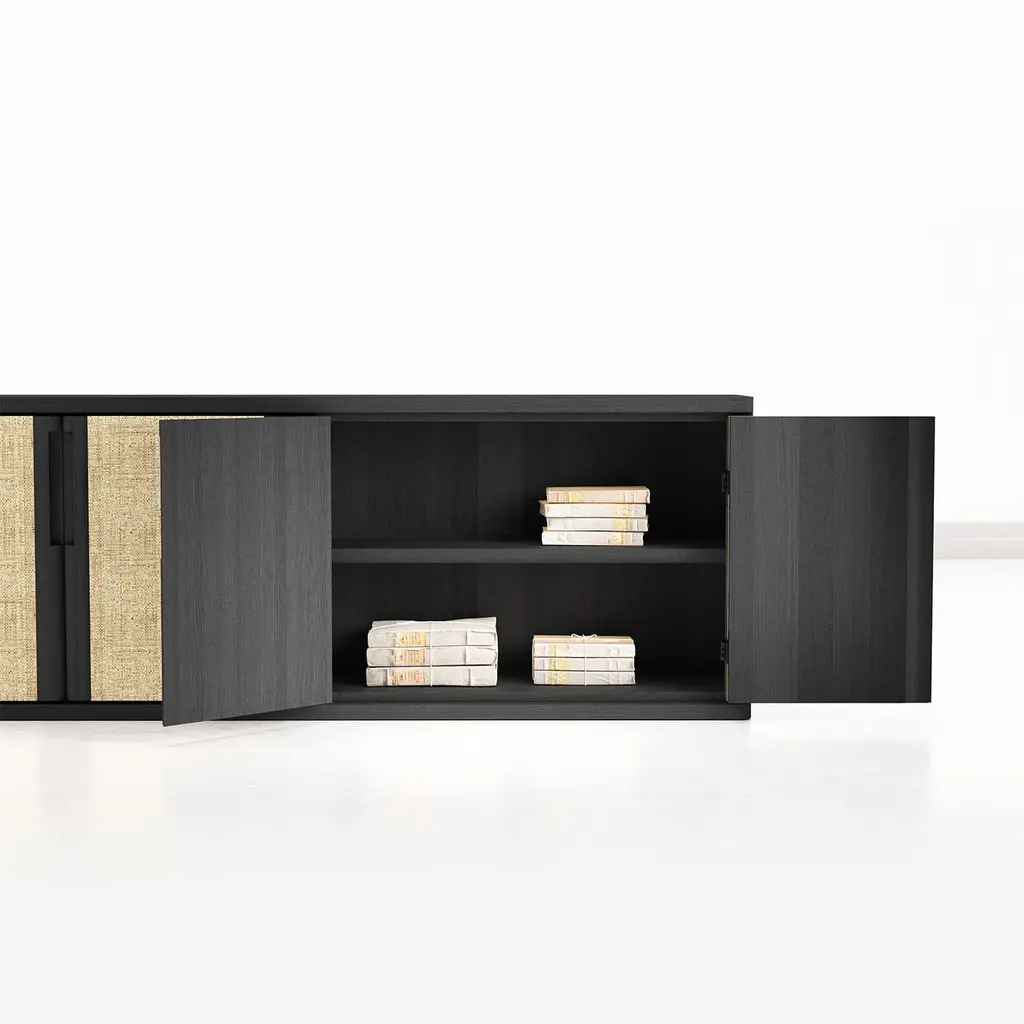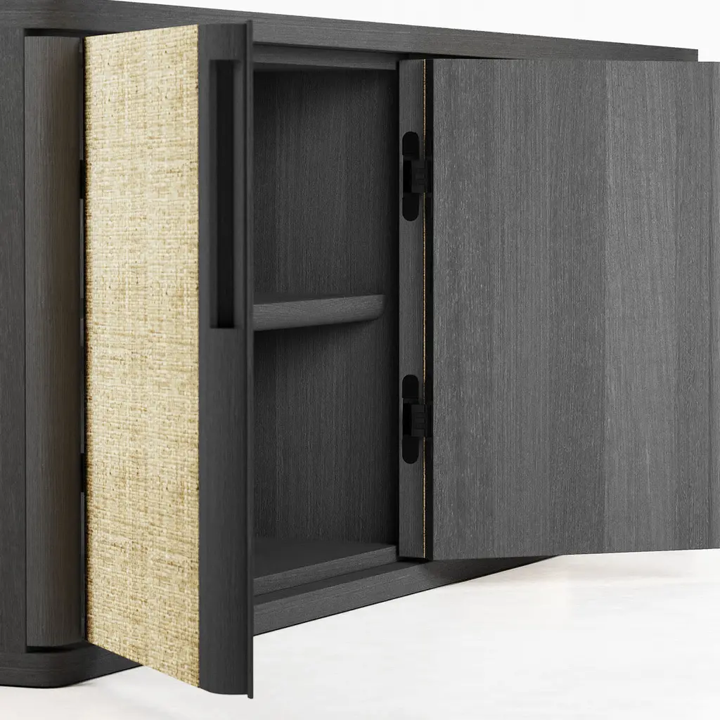 The Vittorio sideboard is crafted from black ash wood with an open pore sandblasted finish, highlighting the wood’s natural grain. Its doors are upholstered in textured natural Raphia in the color "pur miel," adding sophistication and tactile appeal. Handcrafted ash wood blocks with dovetail joints ensure durability, while millings accentuate its aesthetics. The piece blends rigorous design with the smoothness of solid wood, offering both style and ample storage.