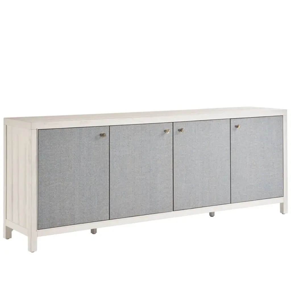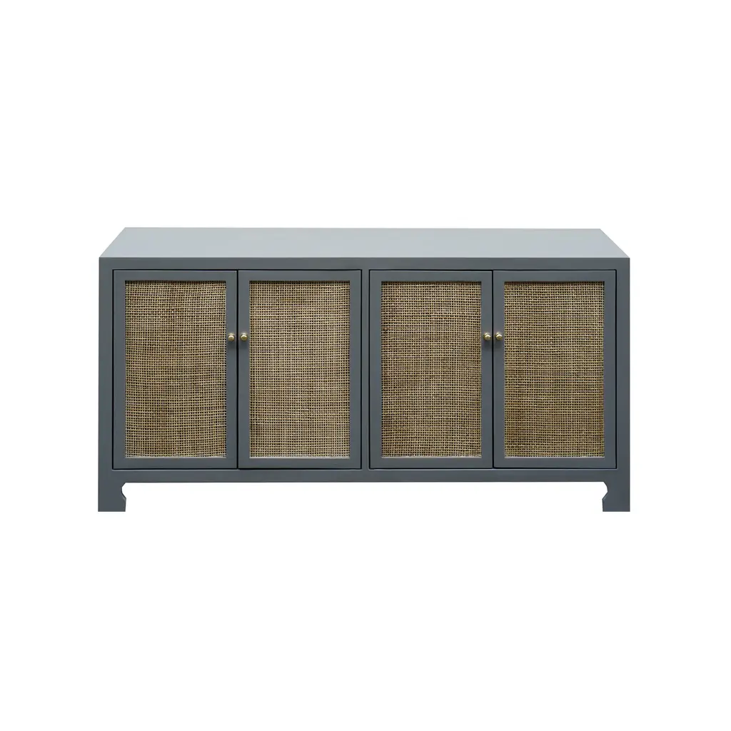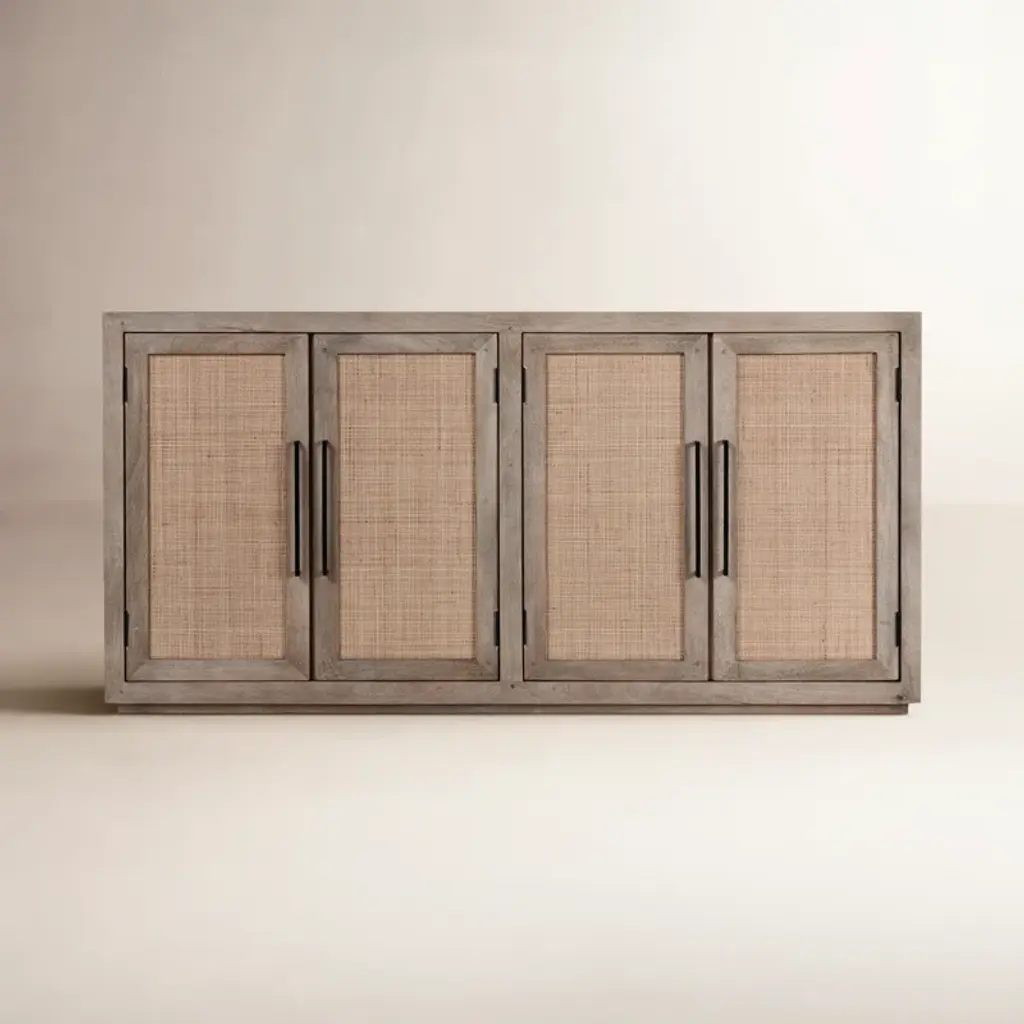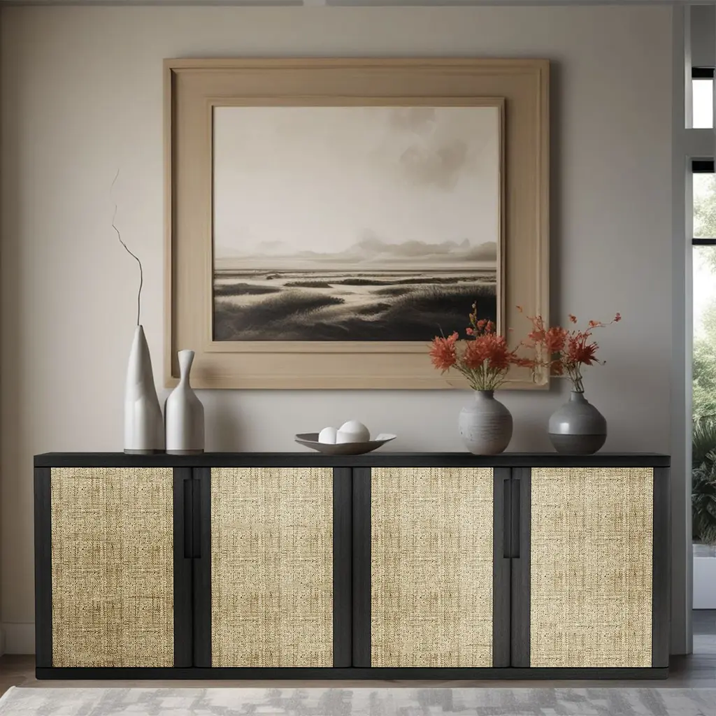 The Vittorio sideboard is crafted from black ash wood with an open pore sandblasted finish, highlighting the wood’s natural grain. Its doors are upholstered in textured natural Raphia in the color "pur miel," adding sophistication and tactile appeal. Handcrafted ash wood blocks with dovetail joints ensure durability, while millings accentuate its aesthetics. The piece blends rigorous design with the smoothness of solid wood, offering both style and ample storage.