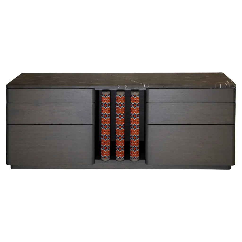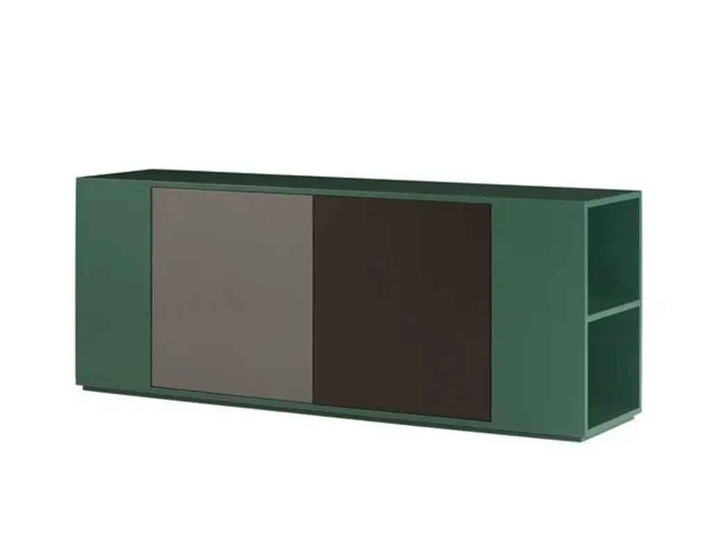 Credenza with 2 central storage spaces, equipped with lateral pieces that open up with shelves.Available finishes: Matt lacquered, Gloss lacquered, Oak solid coloured with carved lines and WalnutThe versatility of the Volterra credenza makes it easy to place in every room of the house.You can choose even 3 different colours of lacquer.Dimensions Credenza #901 and #901/P: 180x71X45