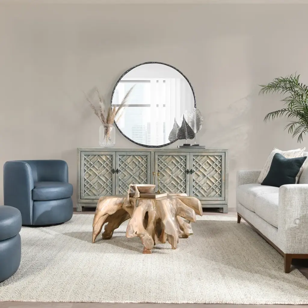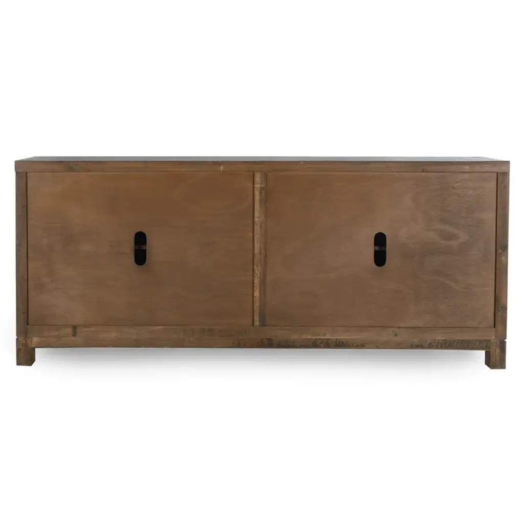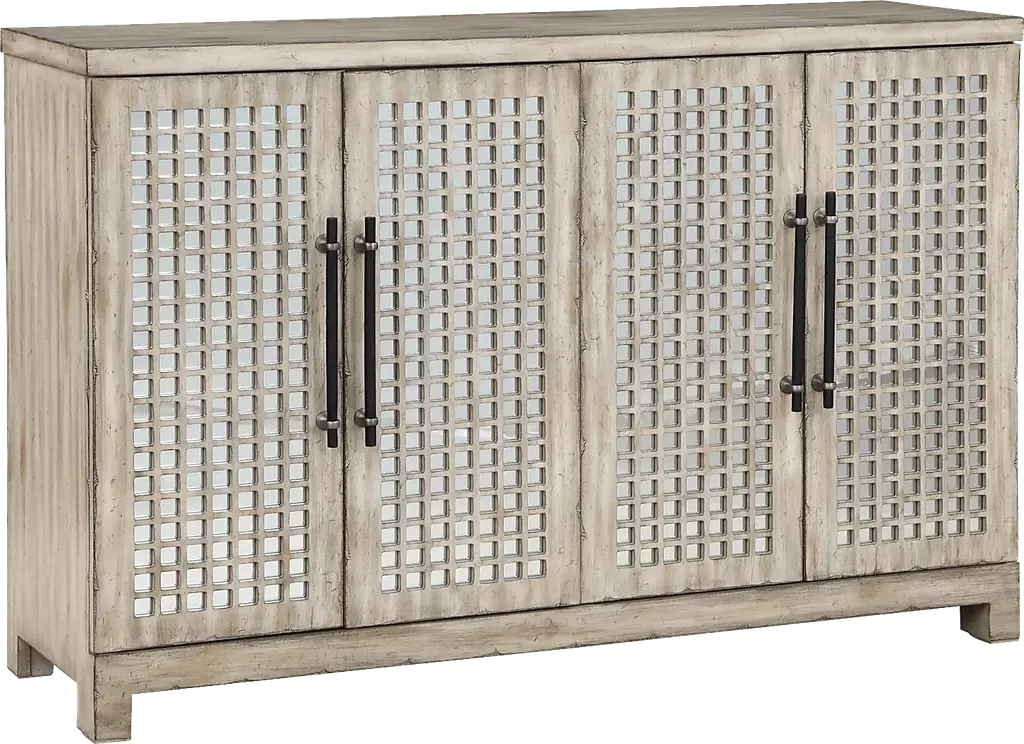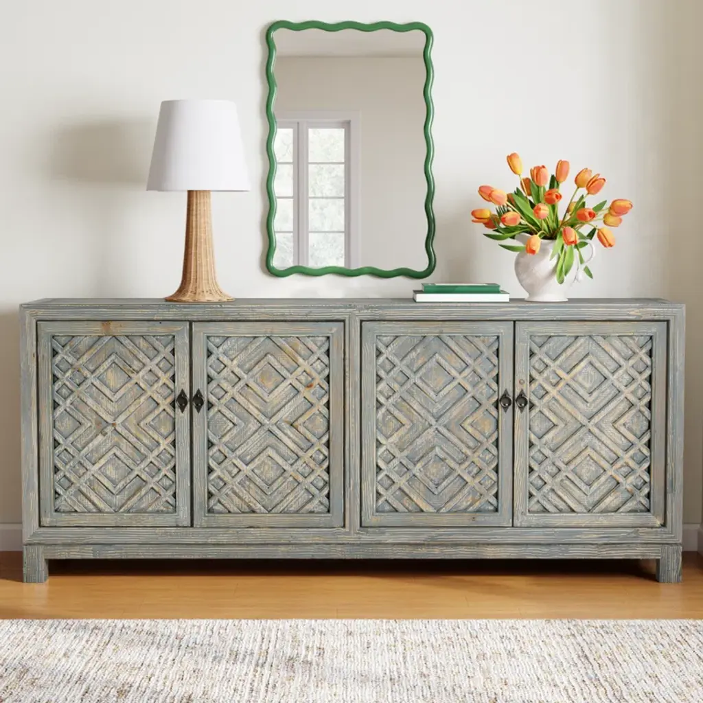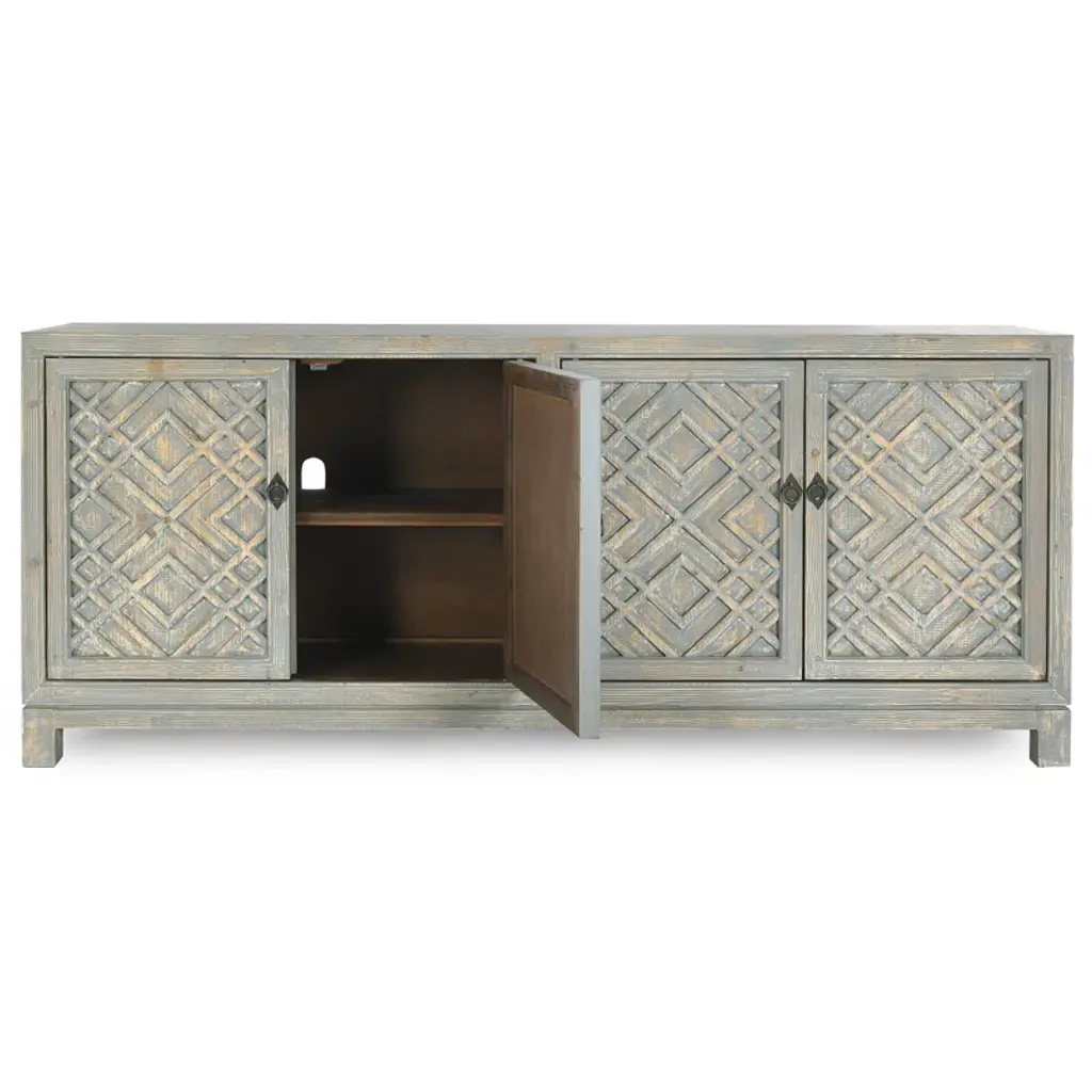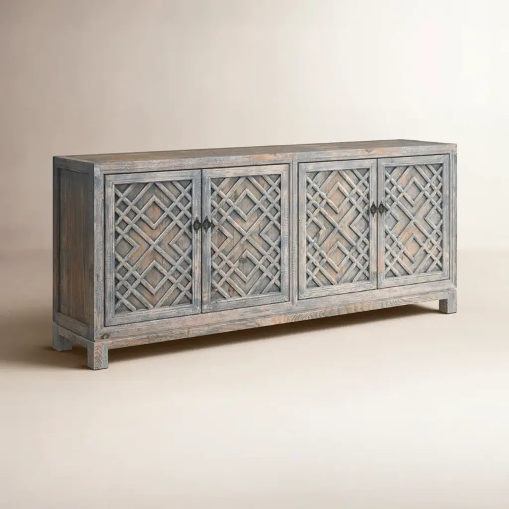 This 85'' sideboard makes a French country-inspired statement with its distressed finish, neutral hues, and timeless elegance. Crafted from a blend of solid and engineered wood, it showcases intricate geometric lattice motifs on the cabinet doors, and purposeful distressing for that rustic, well-loved look. Inside, you'll find four adjustable shelves for versatile storage, and cable management to keep things neat and tidy.