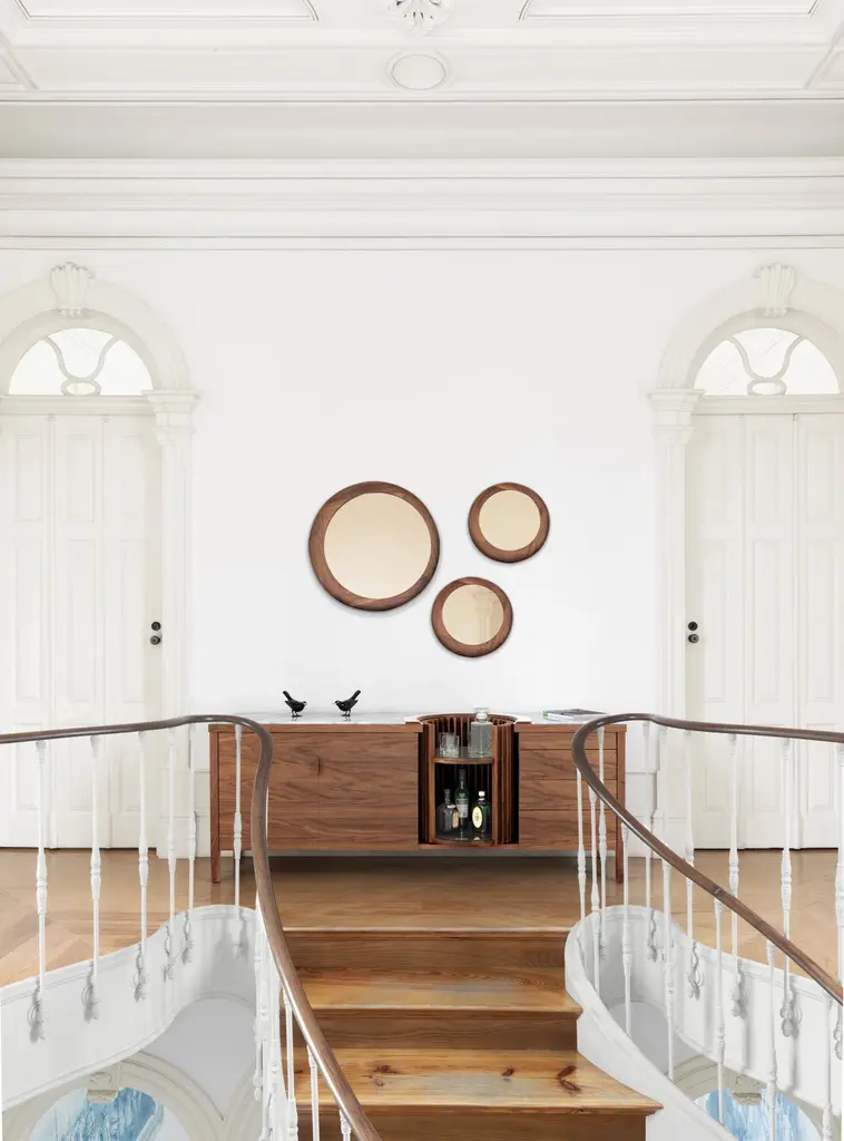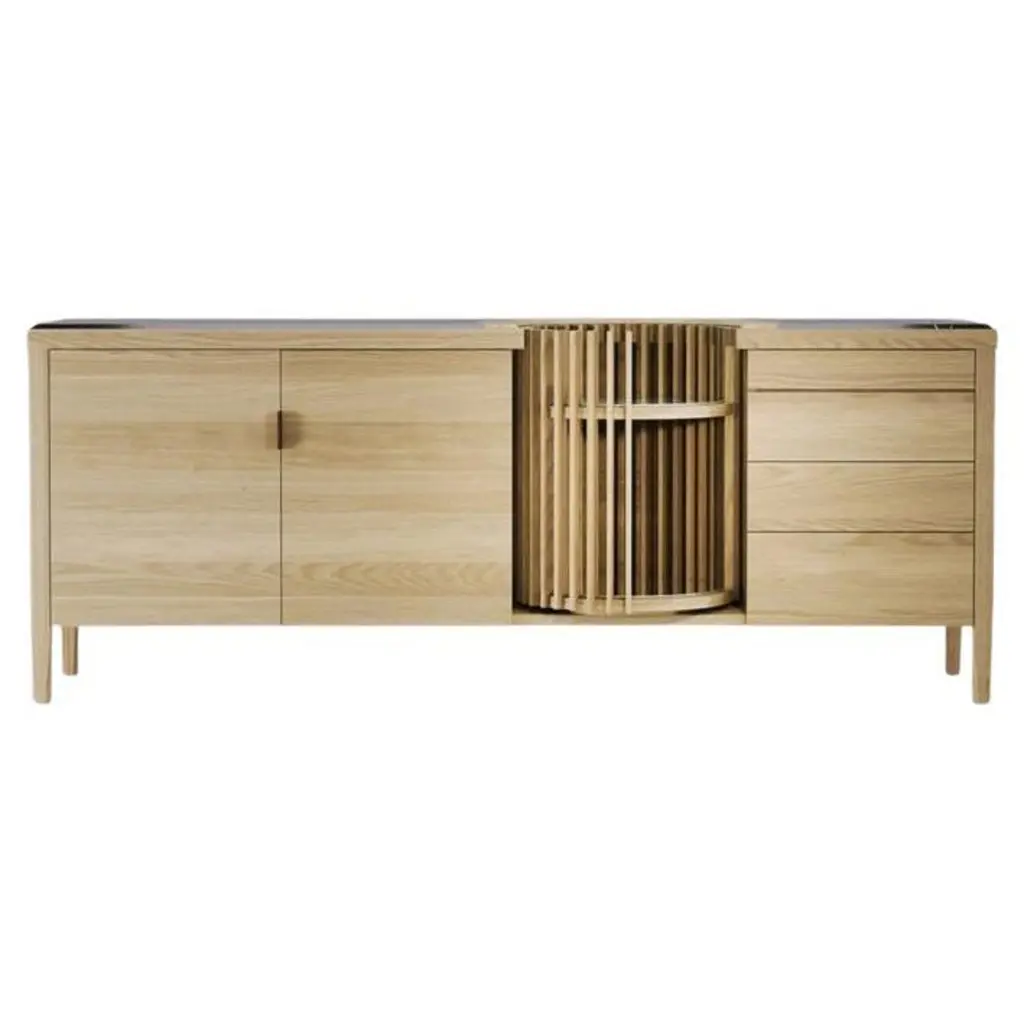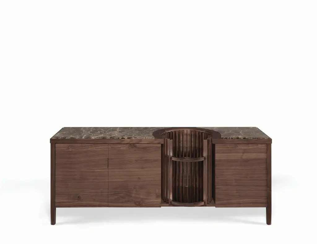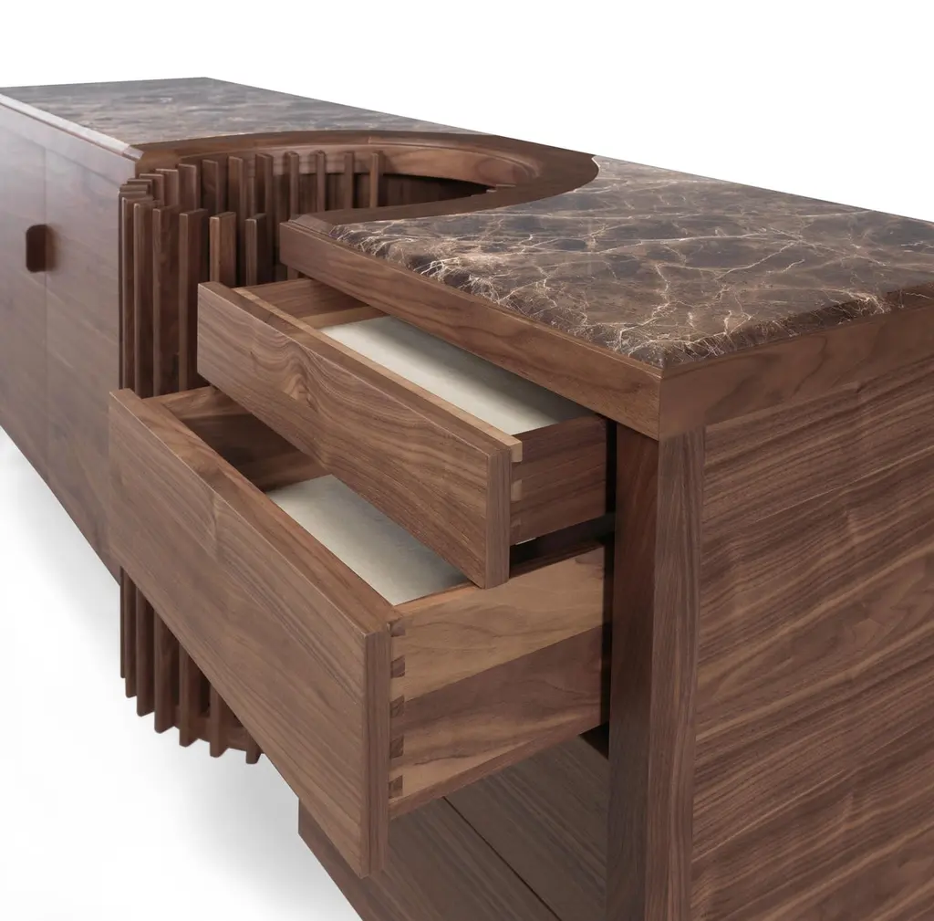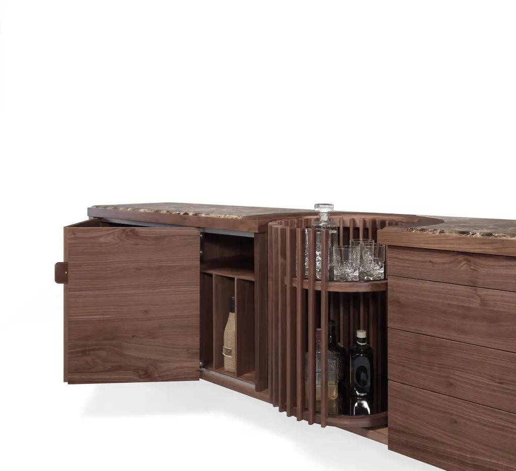 Very elegant and solid walnut frame sideboard with a beautiful marble top in Calacata or brown emperor option and a turntable bar in the middle.Packed in a plywood box.