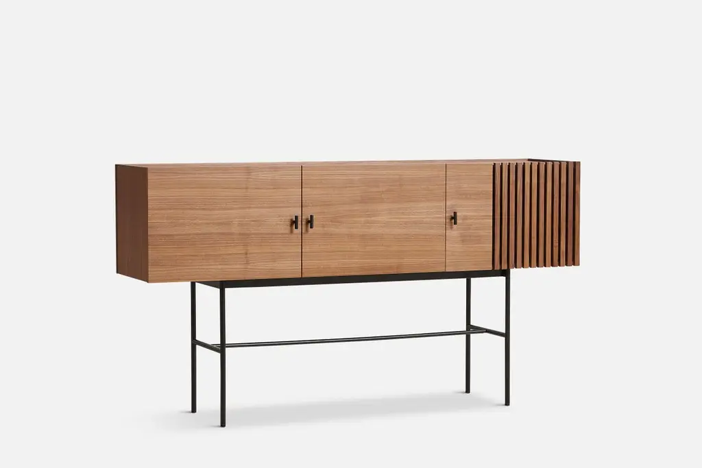 Walnut array sideboard 180 by Says WhoMaterials: walnut, metal.Dimensions: D 44 x W 180 x H 97 cm.Also available in different colours and materials. The founders, Mia and Torben Koed, decided to put their 30 years of experience into a new project. It was time for a change and a new challenge. The challenge was to build an ambitious design brand from the ground up with high-quality materials and great attention to the little details. With a drive to create new originals, the WOUD collection is founded upon the idea to look ahead instead of looking back and share the love for honest design. Therefore, we are eager to discover and develop new ideas whether it being in form, function or choice of material. Says Who is a Danish design studio founded by Kasper Meldgaard and Nikolaj Duve. Rooted in the traditions of Scandinavian design, Says Who combines Nordic minimalism with functionality to create furniture and design solutions. Sharing their love for simplicity, the duo has collaborated with various design brands. The studio is part of the movement of New Scandinavian Design with respect for the design heritage while reinventing it to fit the present time and environment. With curiosity and passion for discovering new ways forward, they create designs with clean lines and geometrical shapes. This dedication recurs in the Barn cabinet and their most recent design to the WOUD collection, the Array series, which beautifully communicates the characteristic lines found in modern architecture.