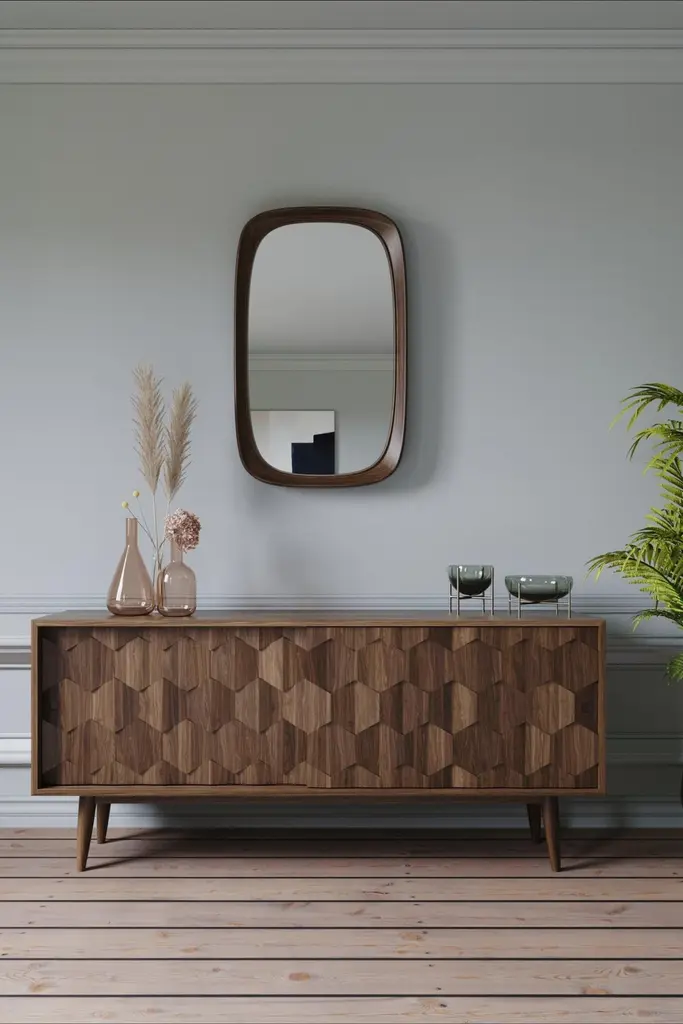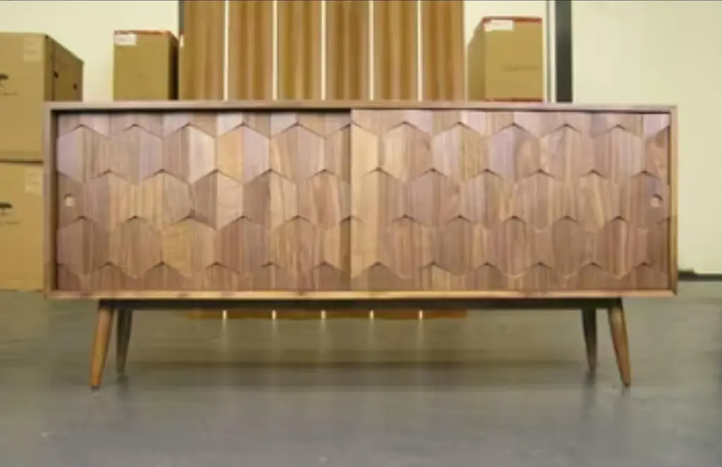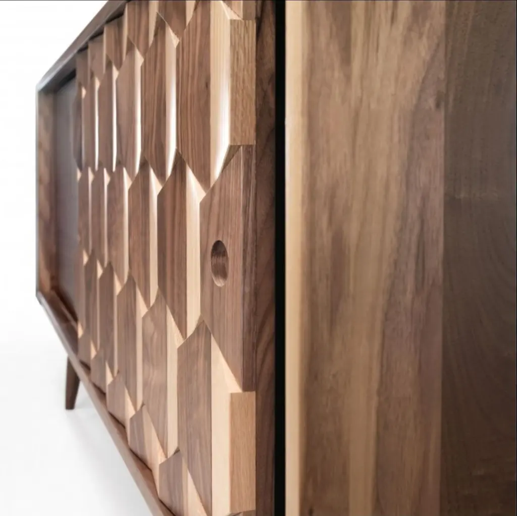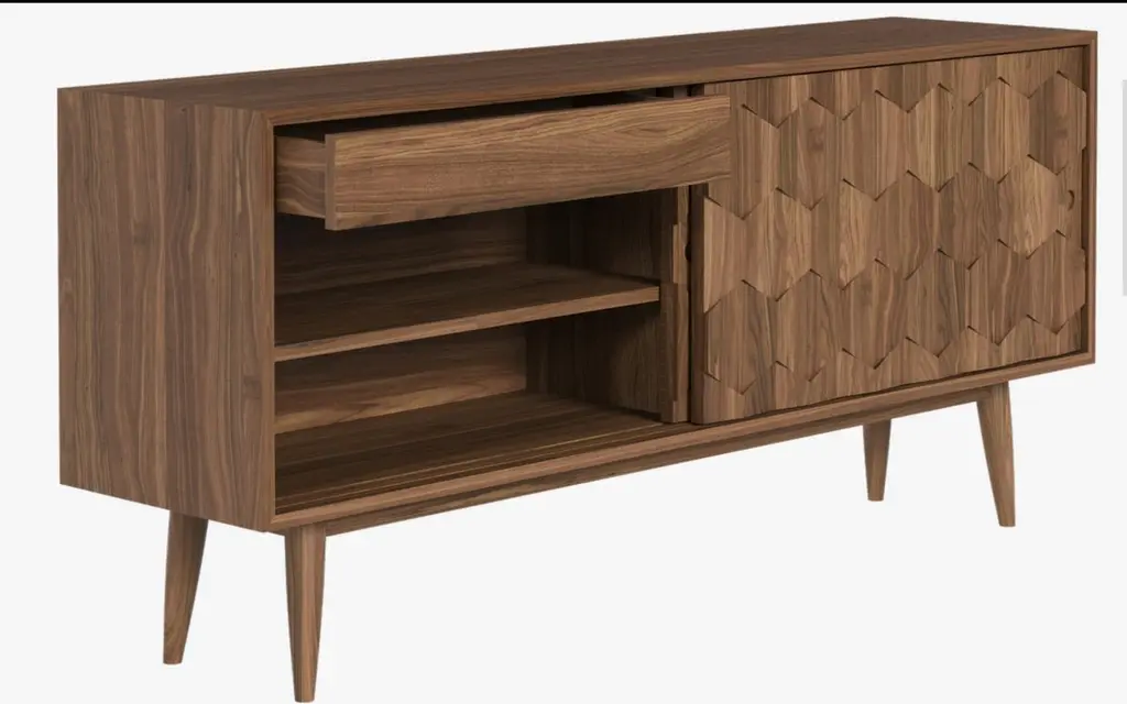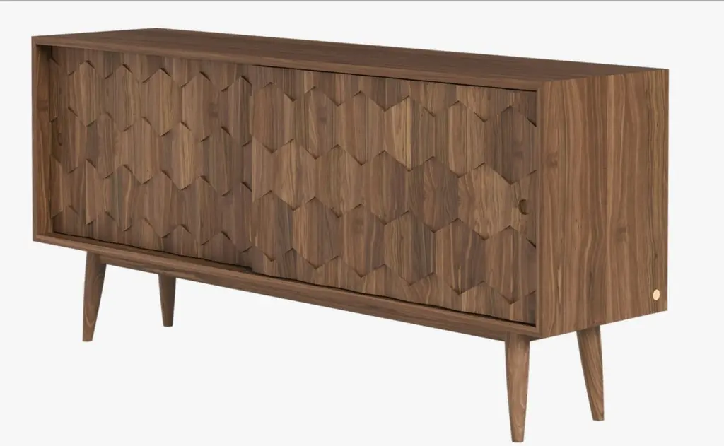 Crafted from high-quality and certified materials, his gorgeous sculptural solid Walnut sideboard emphasizes the traditional joinery techniques.With the structure and interiors in 100% solid wood, this is a rectangular sideboard with a unique design, offering two drawers and four divisions with a great and useful area, allowing to store any type of objects.The pieces of wood on the doors are joined by the experienced hands of artisans, creating a dynamic game of bright/ dark, resulting visually, in a three-dimensional pattern.DIMENSIONS W 1860mm H 840mm D 450mm Available in oak or walnut and the top in marble.Due to differences in monitors, colors of natural wood products may appear different to those shown on this page.