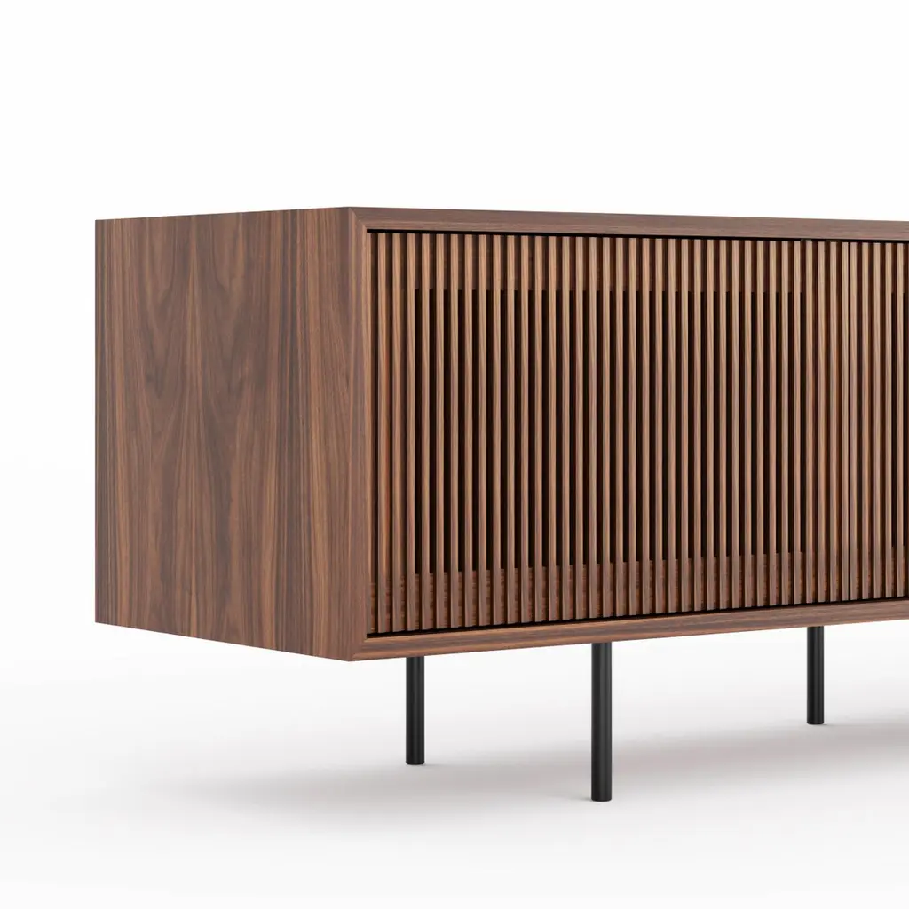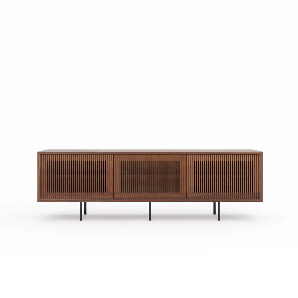 Walnut Sideboard Tv Stand With Three Slatted Doors In Mid Century Modern Style
