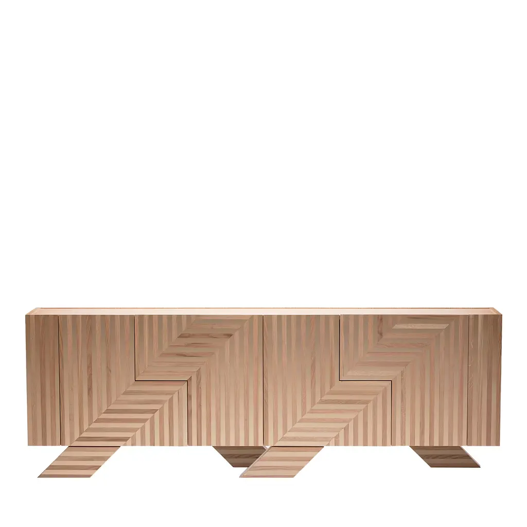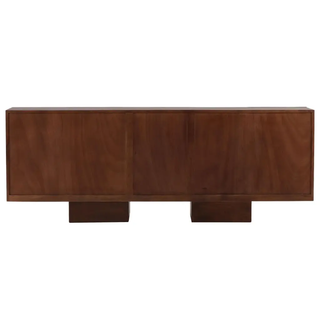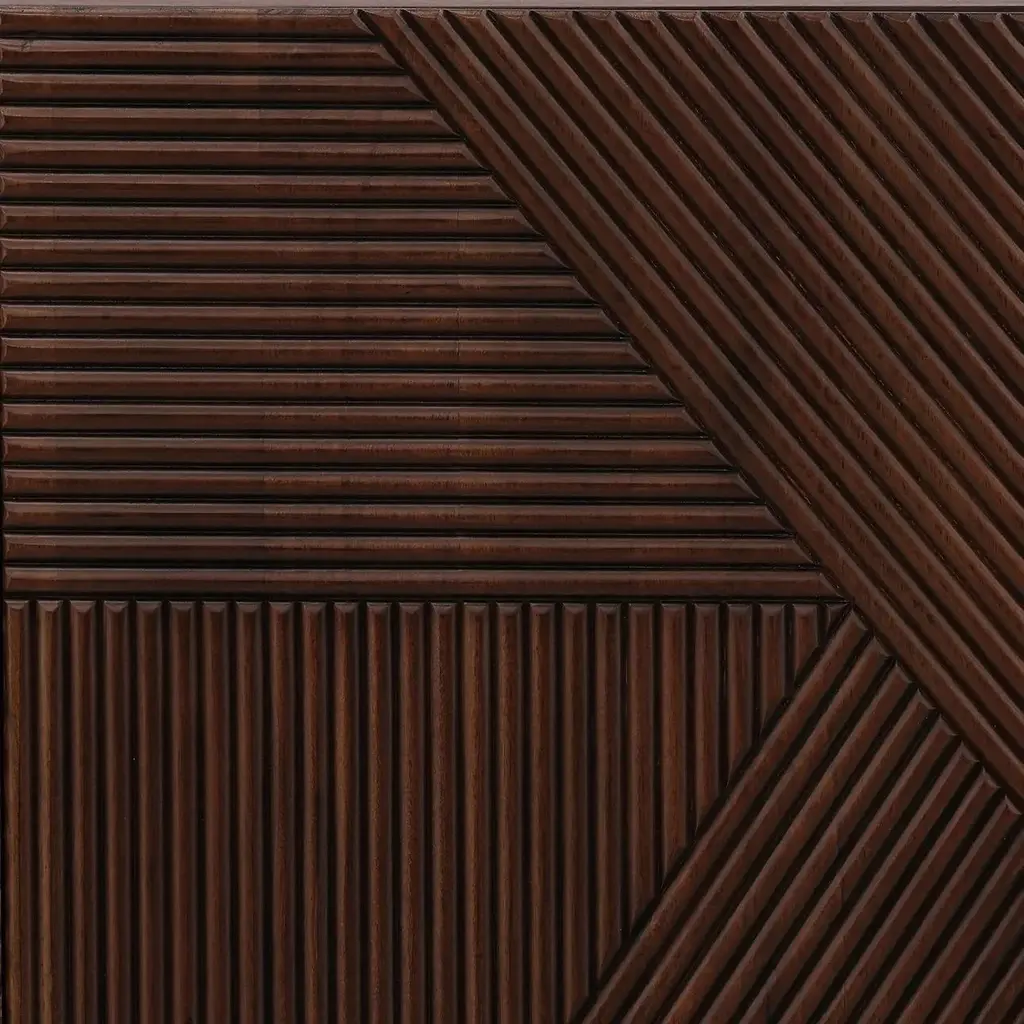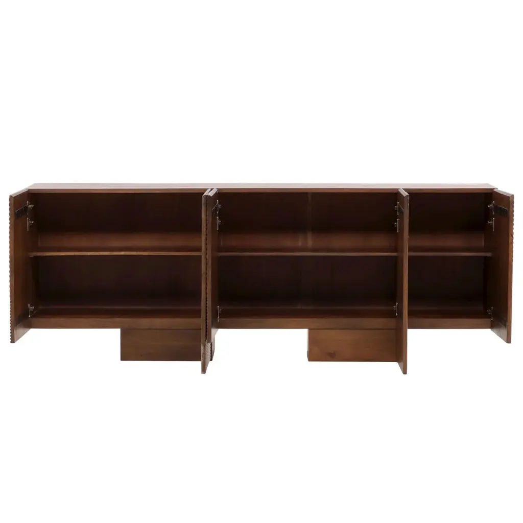 Modern solid acacia wood four door sideboard with beautiful dark walnut brown stain. Geometric carved lines create an attractive abstract design on front. Thick simple cube legs add to the modern style. Each may vary in coloring, wood grain, and natural imperfections. Weighs approx. 300 lbs.