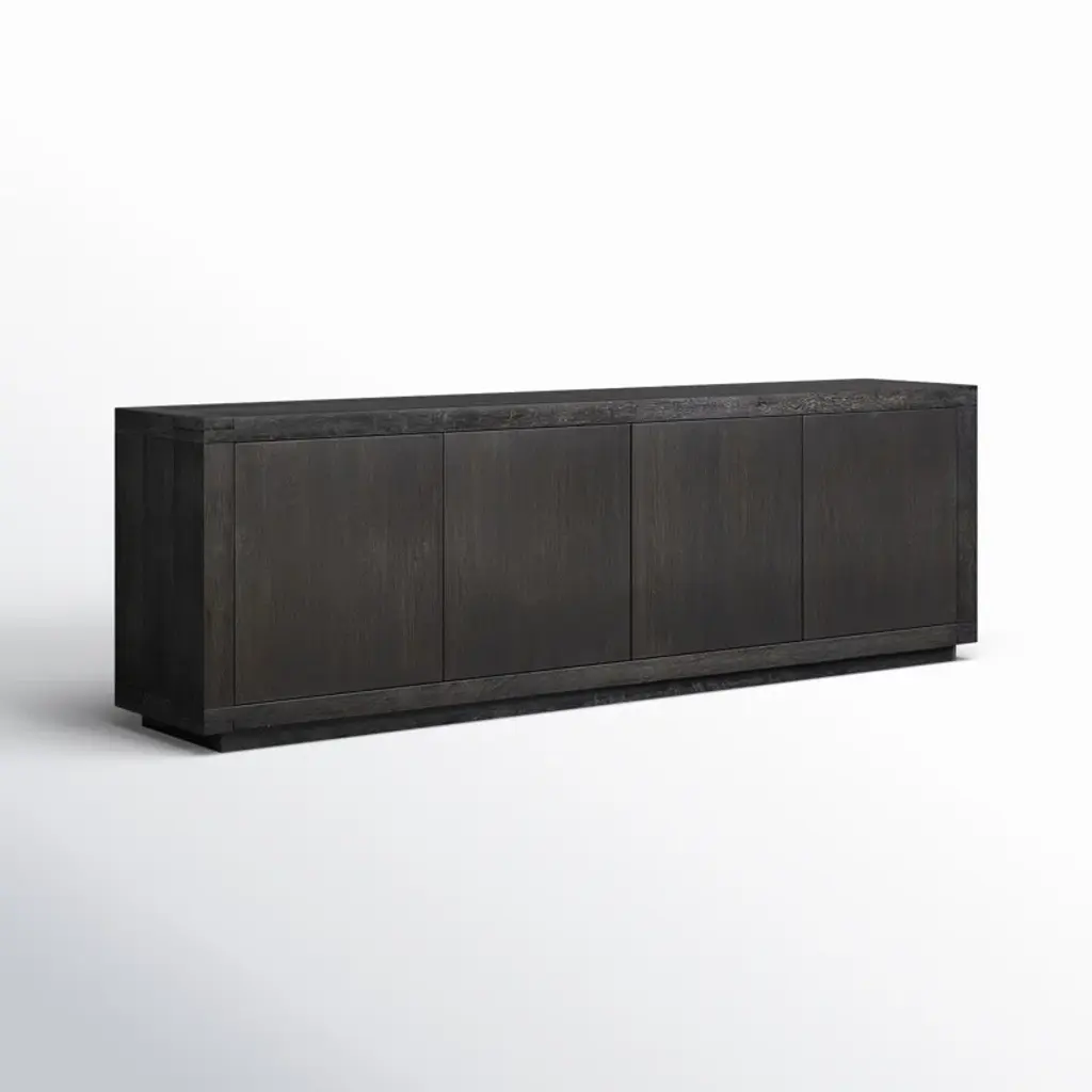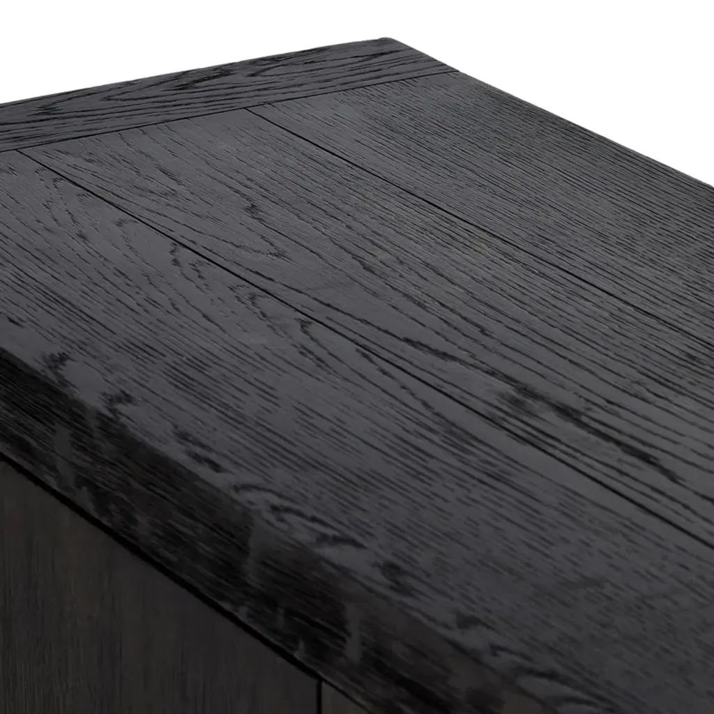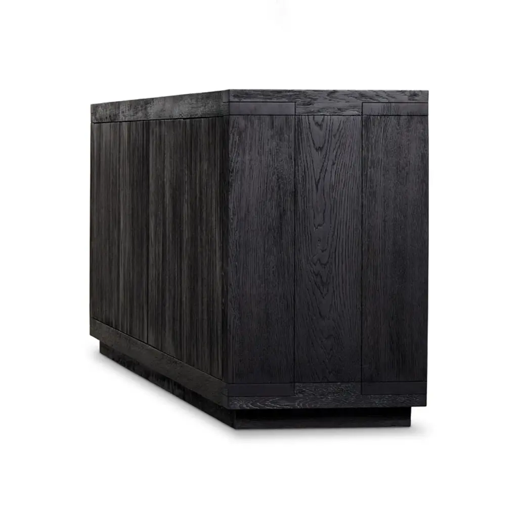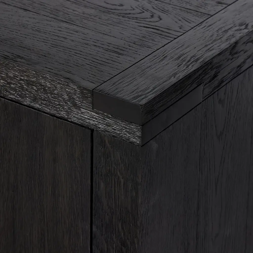 Worn oak shapes a streamlined box-style sideboard, with lap joint corners for a detail-driven touch.
