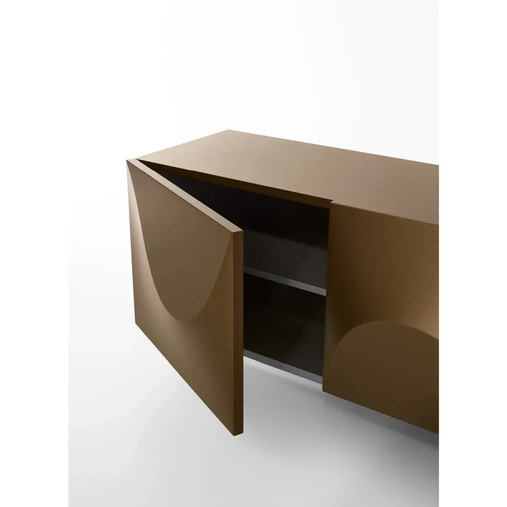 Inspired by the poster for Alfred Hitchcock's film of the same name, the Vertigo design sideboard is distinguished by the soft wave that characterizes the front doors, creating a flow of movement on the surface that softens the rigorous design of the unit. The metal base consists of four seemingly slender feet that give the entire unit a sense of lightness. The Vertigo sideboard is available in three different colour combinations: white lacquered wood outer frame, white lacquered structural polyurethane doors, white metal base or matt bronze lacquered wood outer frame, bronze lacquered structural polyurethane doors, bronze metal base or matt lead lacquered wood outer frame, lead lacquered structural polyurethane doors, lead metal base.