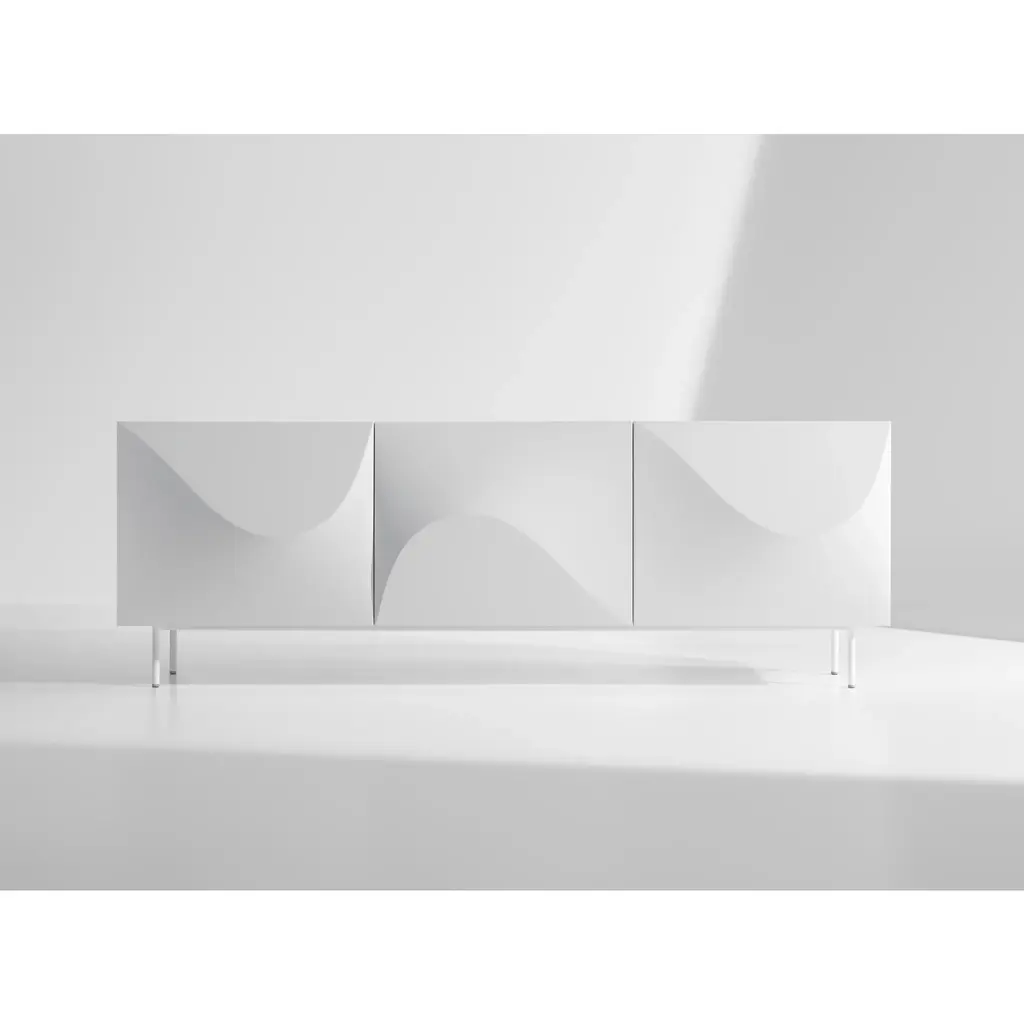 Inspired by the poster for Alfred Hitchcock's film of the same name, the Vertigo design sideboard is distinguished by the soft wave that characterizes the front doors, creating a flow of movement on the surface that softens the rigorous design of the unit. The metal base consists of four seemingly slender feet that give the entire unit a sense of lightness. The Vertigo sideboard is available in three different colour combinations: white lacquered wood outer frame, white lacquered structural polyurethane doors, white metal base or matt bronze lacquered wood outer frame, bronze lacquered structural polyurethane doors, bronze metal base or matt lead lacquered wood outer frame, lead lacquered structural polyurethane doors, lead metal base.