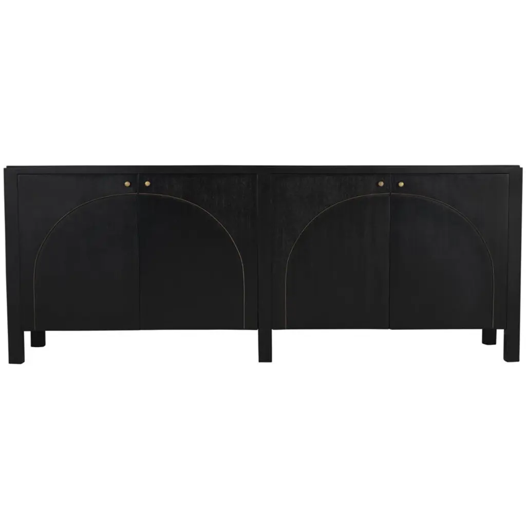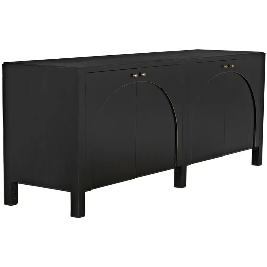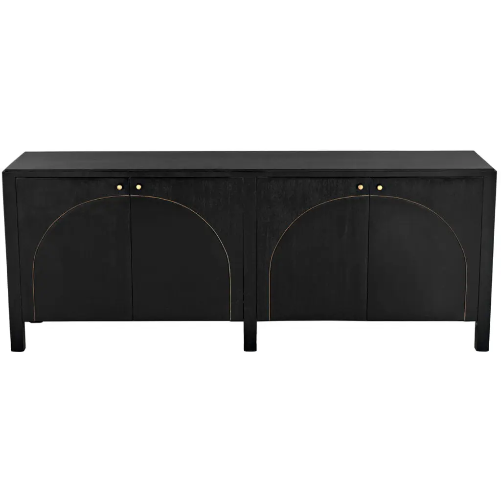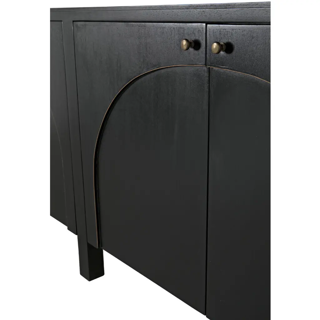 This classic yet contemporary design features four simply carved doors that open via brass pulls to reveal two large interior cupboards. Artisan crafted of mahogany, it is finished in a rich hand-rubbed black and a light brown trim that accents the arches on the front of the sideboard's doors. This is a superior choice for any distinguished home.