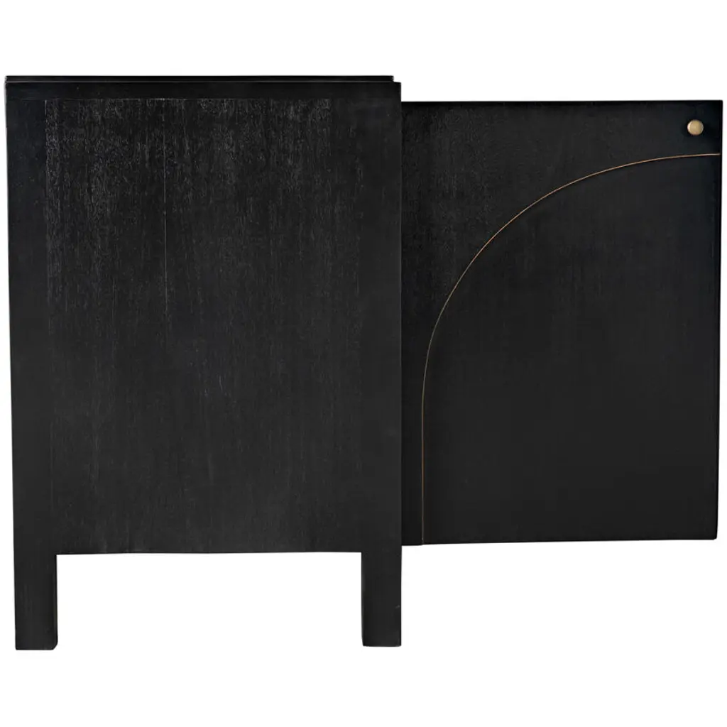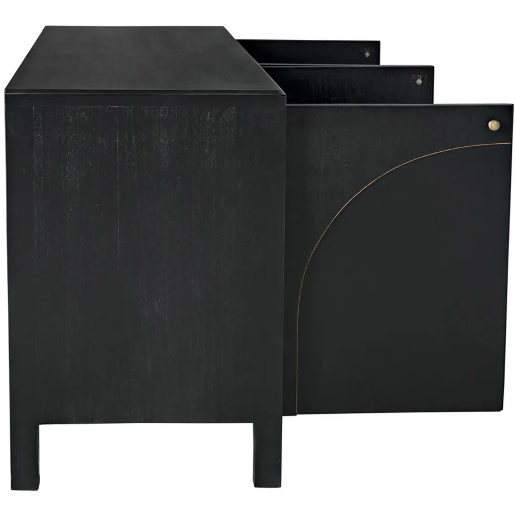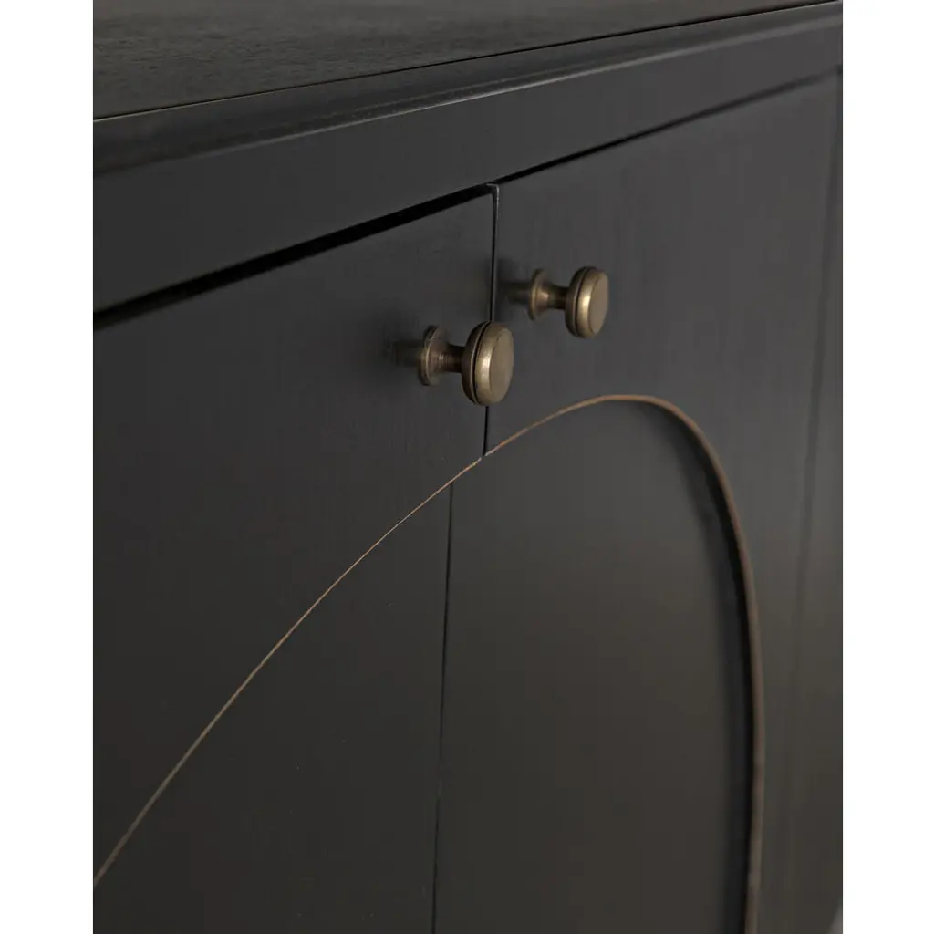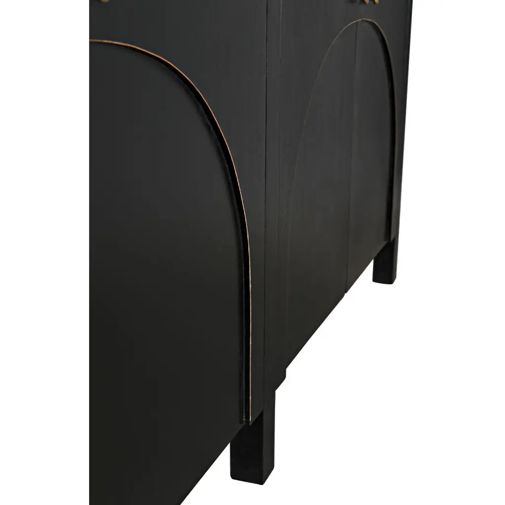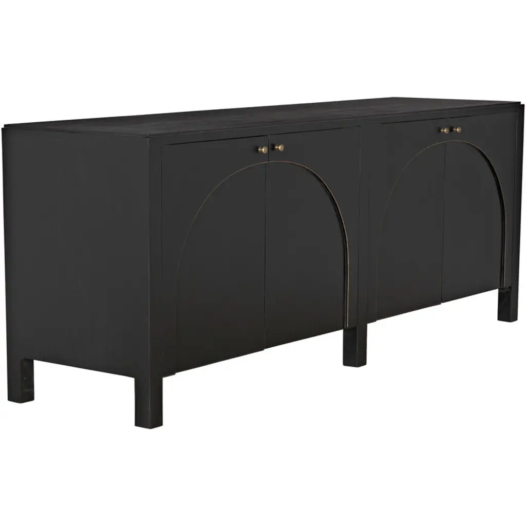 This classic yet contemporary design features four simply carved doors that open via brass pulls to reveal two large interior cupboards. Artisan crafted of mahogany, it is finished in a rich hand-rubbed black and a light brown trim that accents the arches on the front of the sideboard's doors. This is a superior choice for any distinguished home.