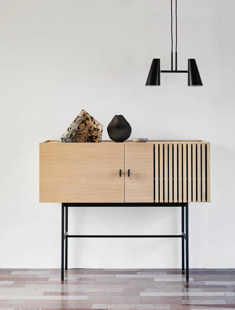 White Oak Array sideboard 120 by Says WhoMaterials: Oak, MetalDimensions: D 44 x W 120 x H 97 cmAlso available in different colors and materials. The founders, Mia and Torben Koed, decided to put their 30 years of experience into a new project. It was time for a change and a new challenge. The challenge was to build an ambitious design brand from the ground up with high-quality materials and great attention to the little details. With a drive to create new originals, the WOUD collection is founded upon the idea to look ahead instead of looking back and share the love for honest design. Therefore, we are eager to discover and develop new ideas whether it being in form, function or choice of material. Says Who is a Danish design studio founded by Kasper Meldgaard and Nikolaj Duve. Rooted in the traditions of Scandinavian design, Says Who combines Nordic minimalism with functionality to create furniture and design solutions. Sharing their love for simplicity, the duo has collaborated with various design brands. The studio is part of the movement of New Scandinavian Design with respect for the design heritage while reinventing it to fit the present time and environment. With curiosity and passion for discovering new ways forward, they create designs with clean lines and geometrical shapes. This dedication recurs in the Barn cabinet and their most recent design to the WOUD collection, the Array series, which beautifully communicates the characteristic lines found in modern architecture.
