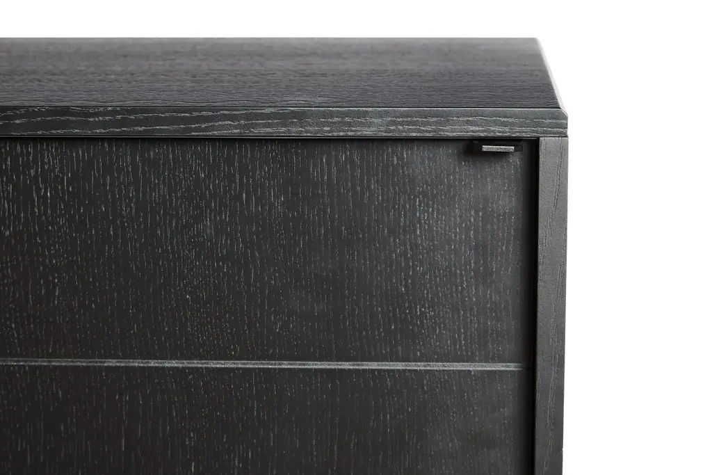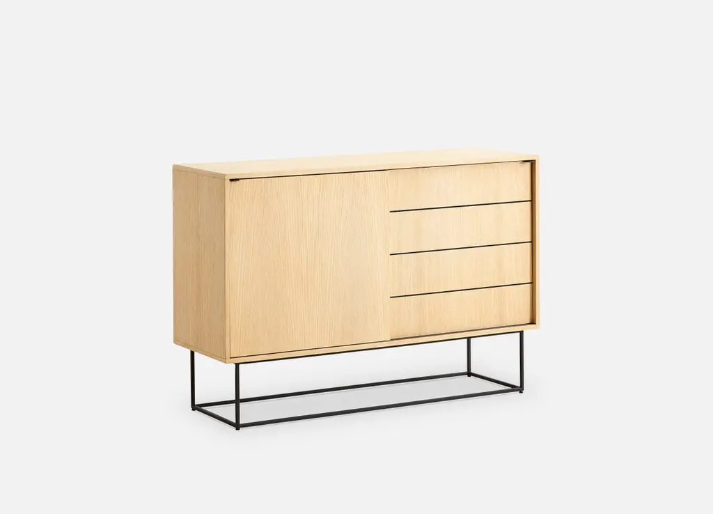 White oak virka high sideboard by Ropke Design and MoaakMaterials: oak, metal.Dimensions: D 40 x W 120 x H 82 cmAlso available in different colours and materials. The founders, Mia and Torben Koed, decided to put their 30 years of experience into a new project. It was time for a change and a new challenge. The challenge was to build an ambitious design brand from the ground up with high-quality materials and great attention to the little details. With a drive to create new originals, the WOUD collection is founded upon the idea to look ahead instead of looking back and share the love for honest design. Therefore, we are eager to discover and develop new ideas whether it being in form, function or choice of material. Mark Wedel & Rasmus Røpke are both Danish designers, having their own studios. Mark Wedel manages his own studio named MOAKK, and Rasmus Røpke runs his design office, Røpke Design. Together, the duo specialises in furniture design and combines their skills into functional and clean designs. Clean lines and functionality have always been drawing factors for the two designer friends, which also brought them together. The shared visual taste is complemented by their common aim to develop simple design that fulfils the consumer's needs - both functional and aesthetic.The stringent approach to design views in the Virka sideboard series. The horizontal lines and geometrical frame creates an elegant design and with sliding doors and an adjustable shelf with room to let cables pass through the holes in each backboard, the series beautifully combines simplicity and functionality