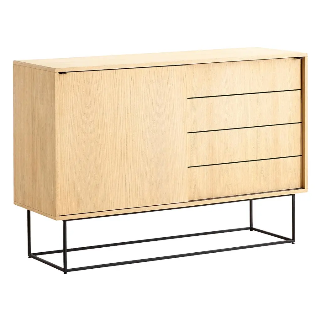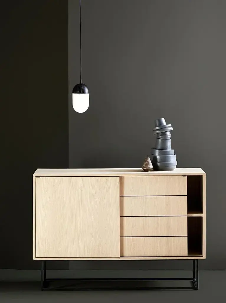 White oak virka high sideboard by ropke design and moaak materials: oak, metal. Dimensions: d 40 x w 120 x h 82 cm also available in different colours and materials. The founders, mia and torben koed, decided to put their 30 years of experience into a new project. It was time for a change and a new challenge. The challenge was to build an ambitious design brand from the ground up with high-quality materials and great attention to the little details. With a drive to create new originals, the woud collection is founded upon the idea to look ahead instead of looking back and share the love for honest design. Therefore, we are eager to discover and develop new ideas whether it being in form, function or choice of material. Mark wedel & rasmus røpke are both danish designers, having their own studios. Mark wedel manages his own studio named moakk, and rasmus røpke runs his design office, røpke design. Together, the duo specialises in furniture design and combines their skills into functional and clean designs. Clean lines and functionality have always been drawing factors for the two designer friends, which also brought them together. The shared visual taste is complemented by their common aim to develop simple design that fulfils the consumer's needs - both functional and aesthetic. The stringent approach to design views in the virka sideboard series. The horizontal lines and geometrical frame creates an elegant design and with sliding doors and an adjustable shelf with room to let cables pass through the holes in each backboard, the series beautifully combines simplicity and functionality