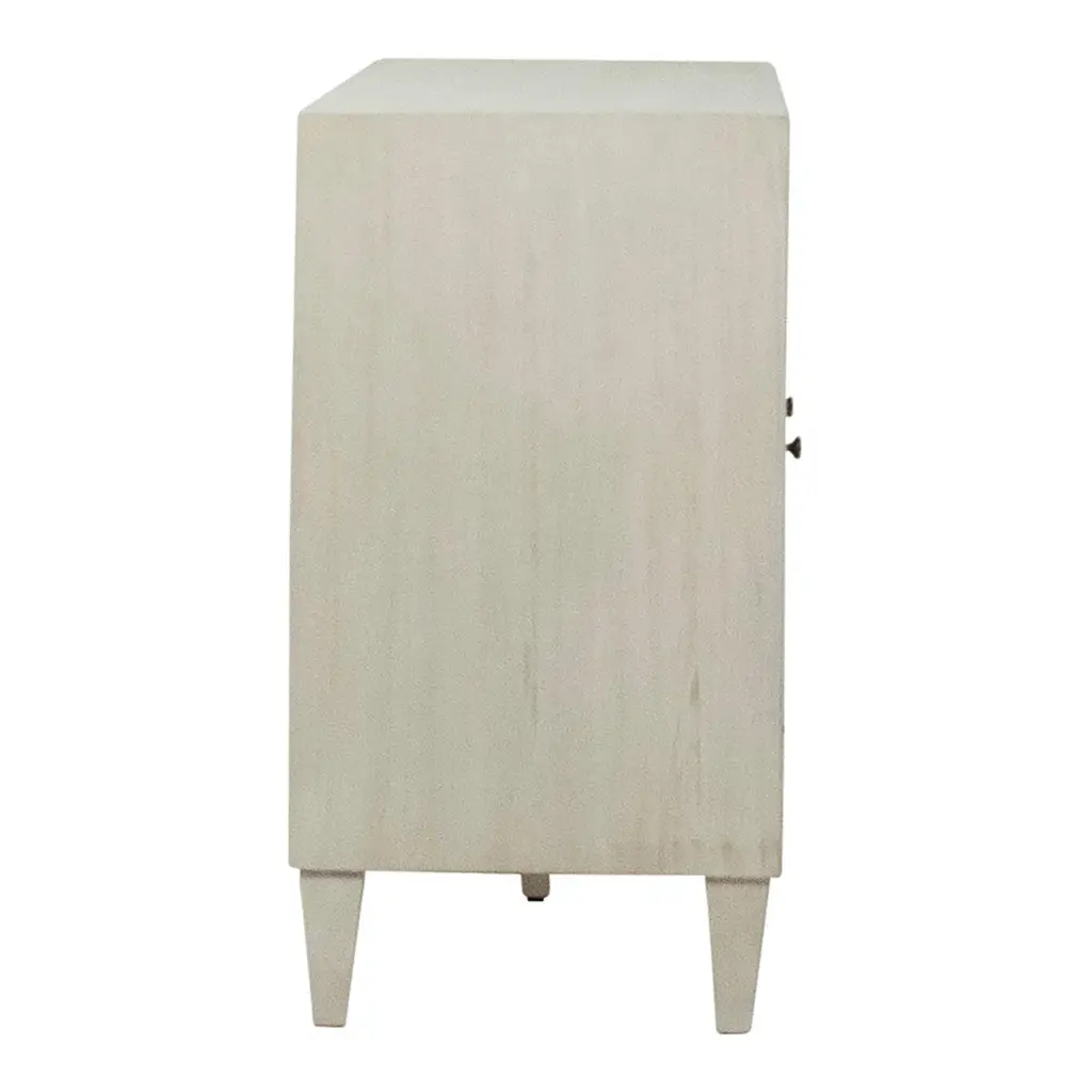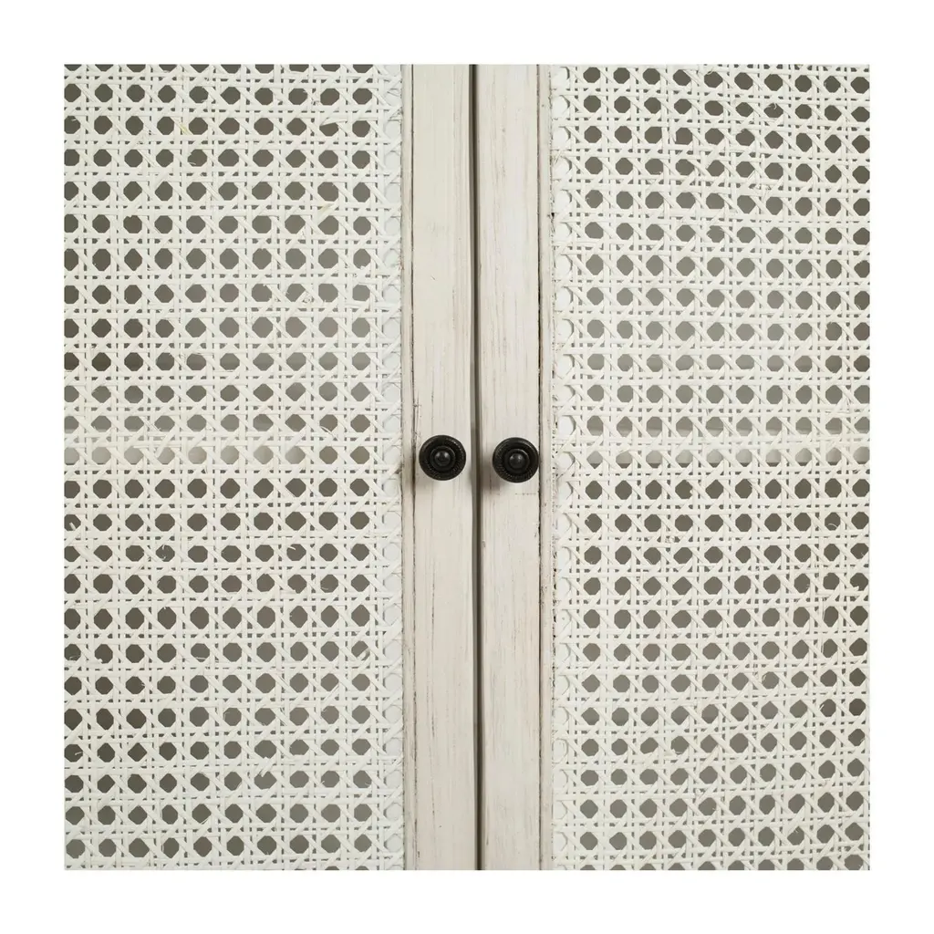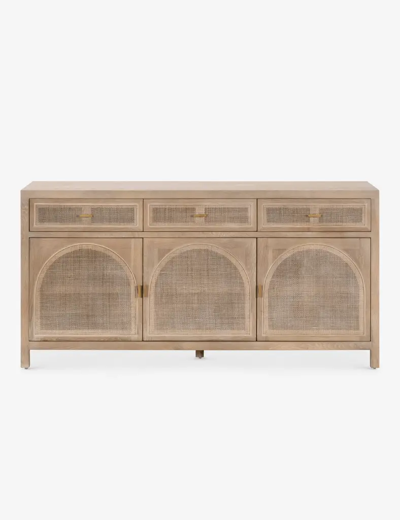 White wash finish acacia wood frame sideboard with rattan panels on three doors. Perfect for a coastal contemporary interior, and will work beautifully in many other styles as well. Weighs approx. 100 lbs..