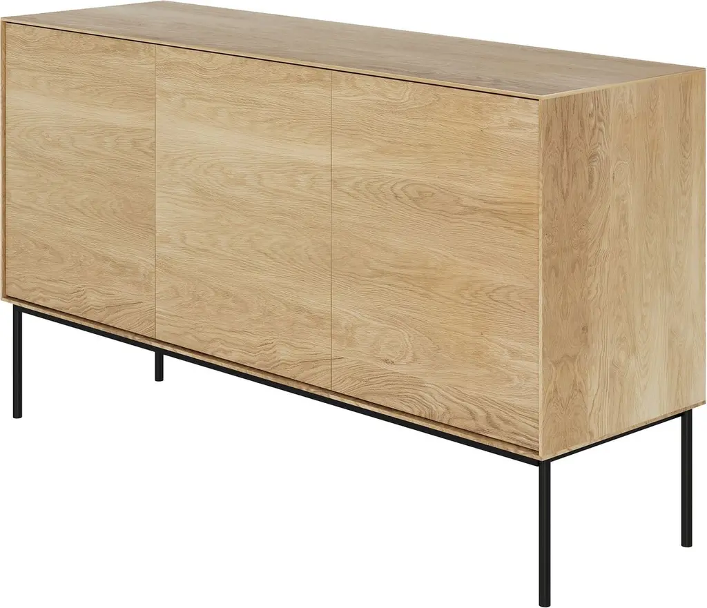 This sideboard's streamlined design allows the beauty of the richly figured oak to command attention. The minimalist metal legs add an inviting airiness. Behind the push-open doors is adjustable shelving.