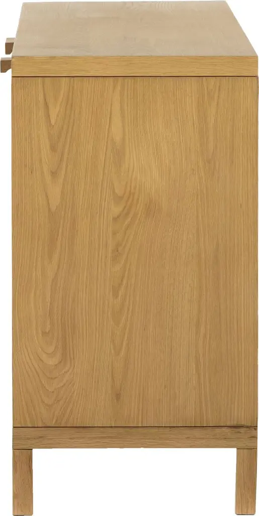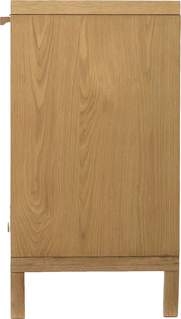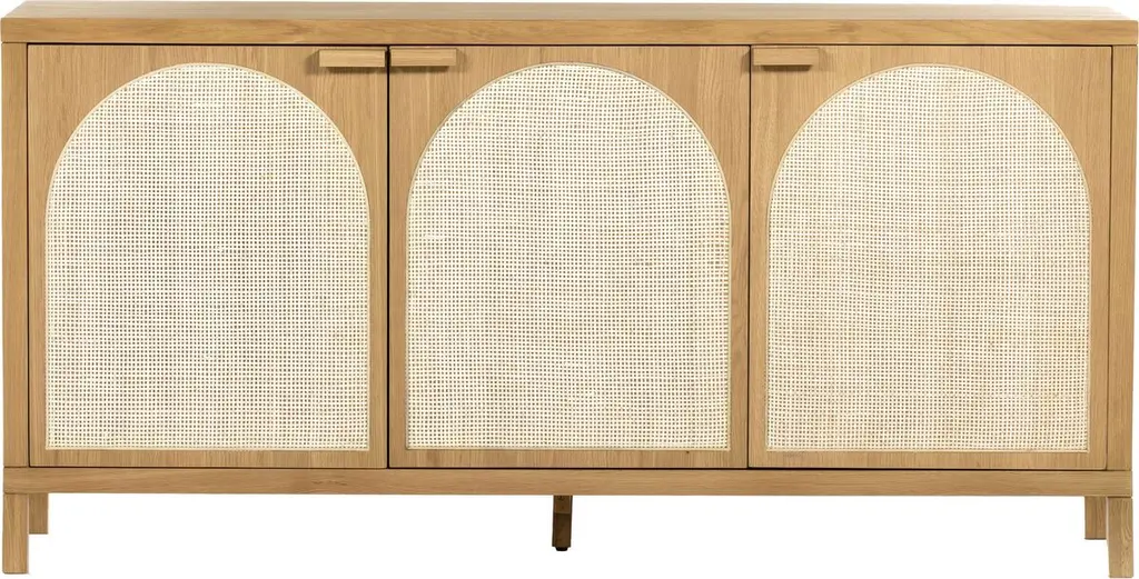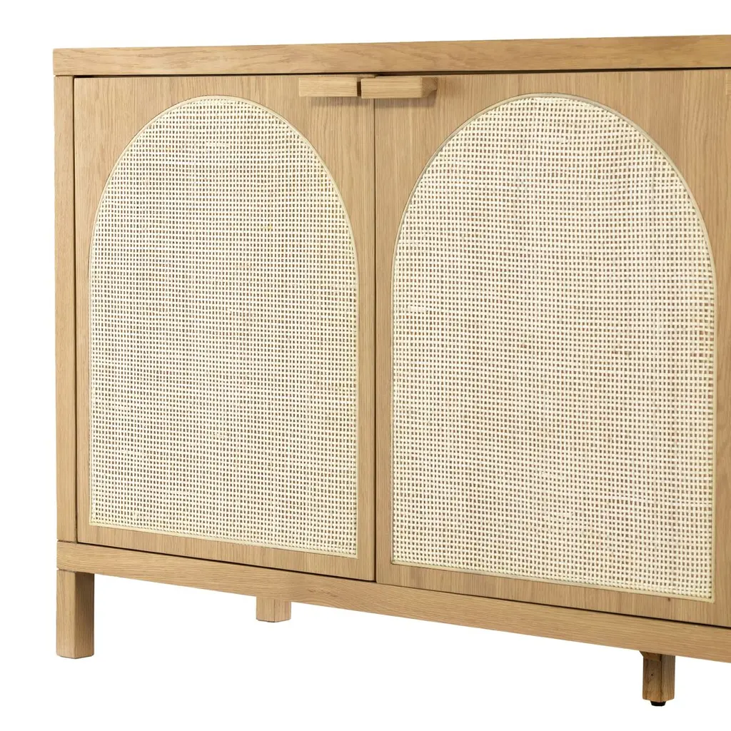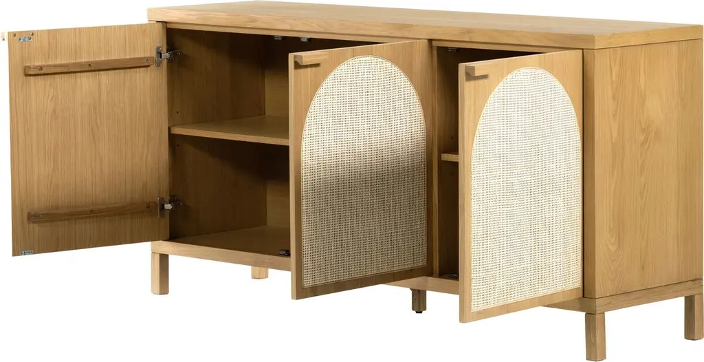 Oak is a favorite not only for its strength and resistance to scratching but also for its distinctive grain. Here it's paired with arched inserts of wood-backed woven cane for tonal and textural contrast. Behind the doors, adjustable shelving and cutouts for cord management make this piece ideal for use as a sideboard or a media console.