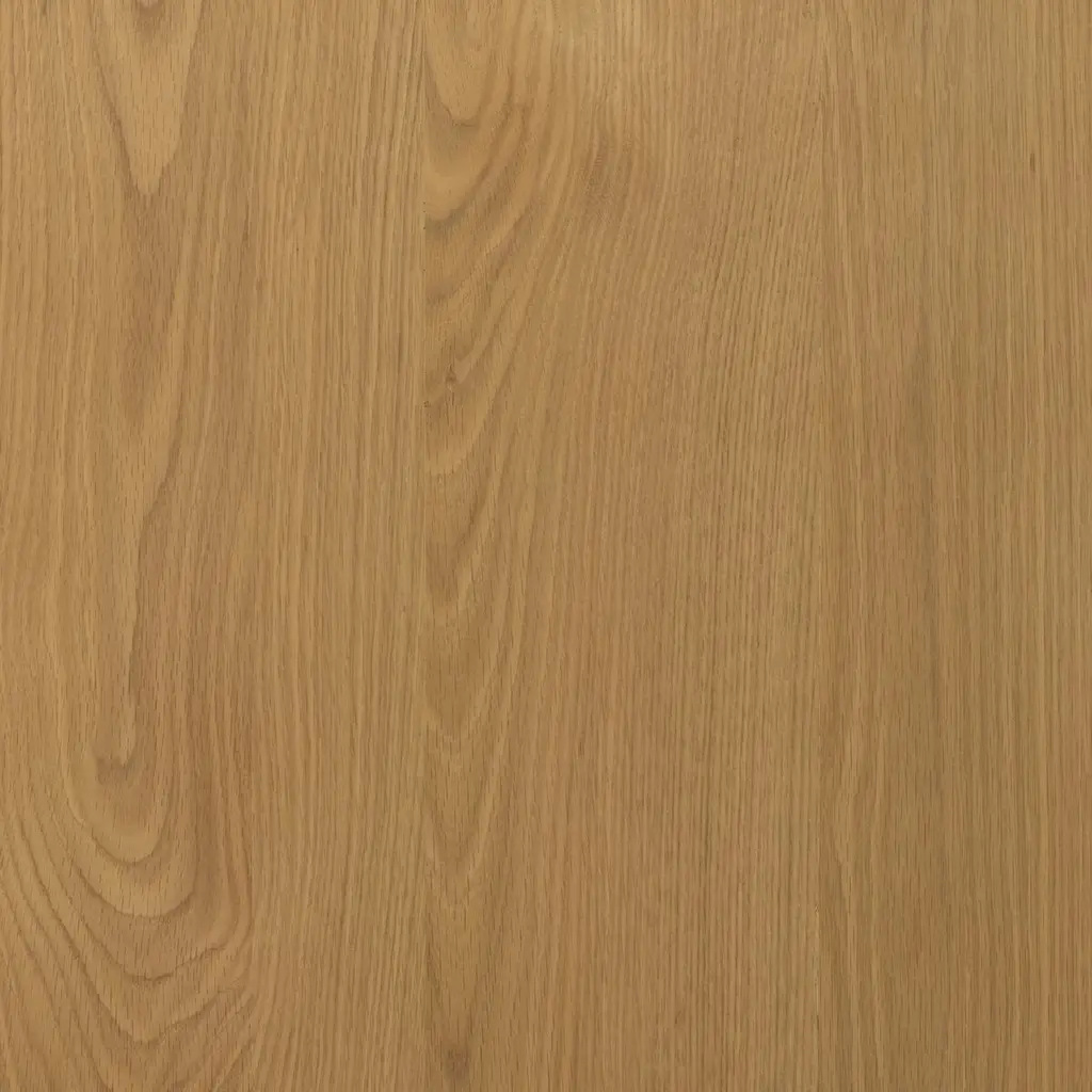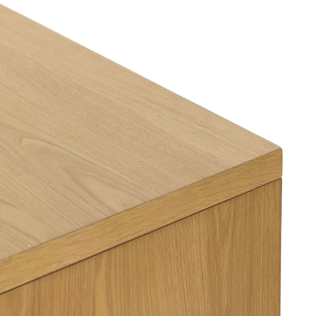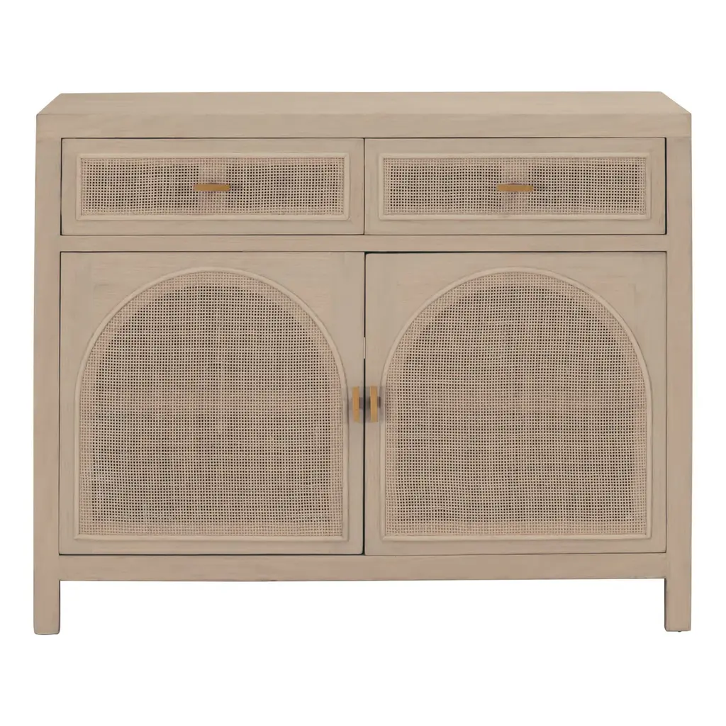 Oak is a favorite not only for its strength and resistance to scratching but also for its distinctive grain. Here it's paired with arched inserts of wood-backed woven cane for tonal and textural contrast. Behind the doors, adjustable shelving and cutouts for cord management make this piece ideal for use as a sideboard or a media console.