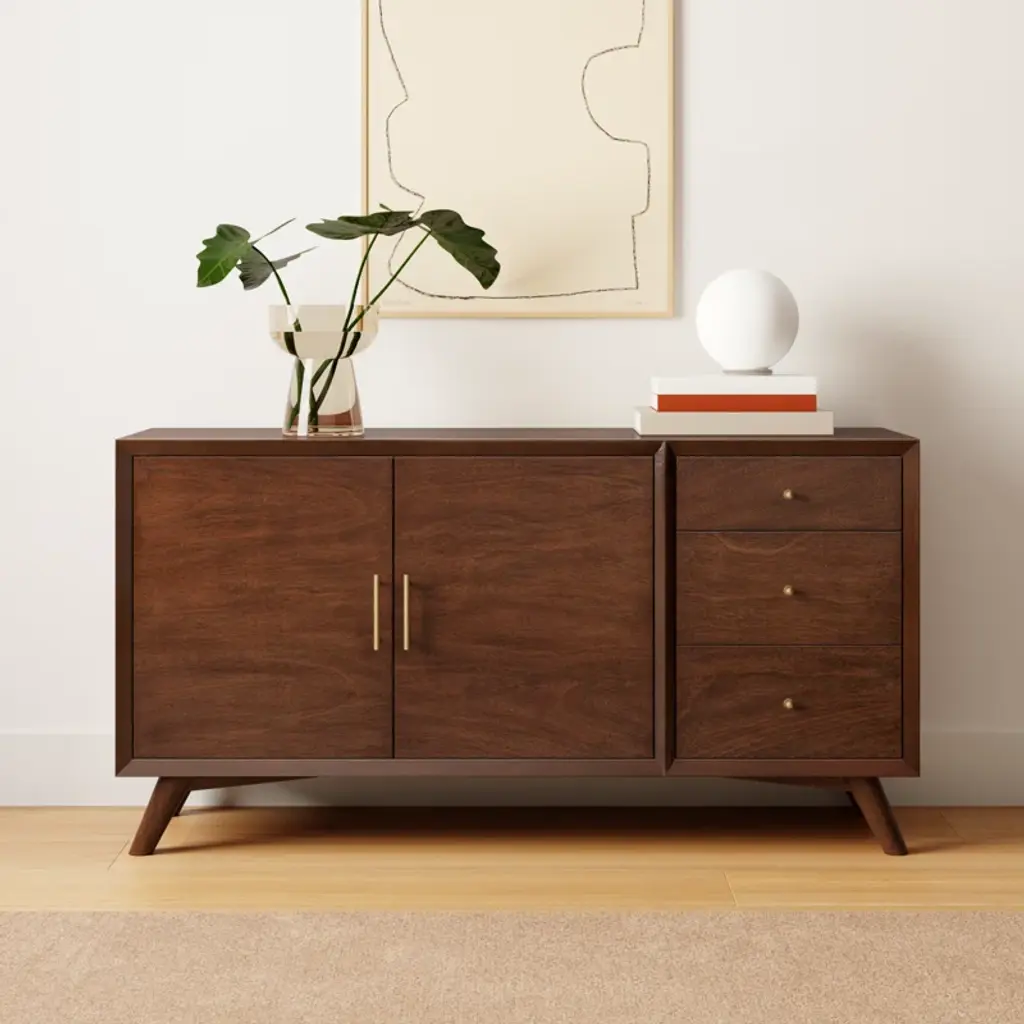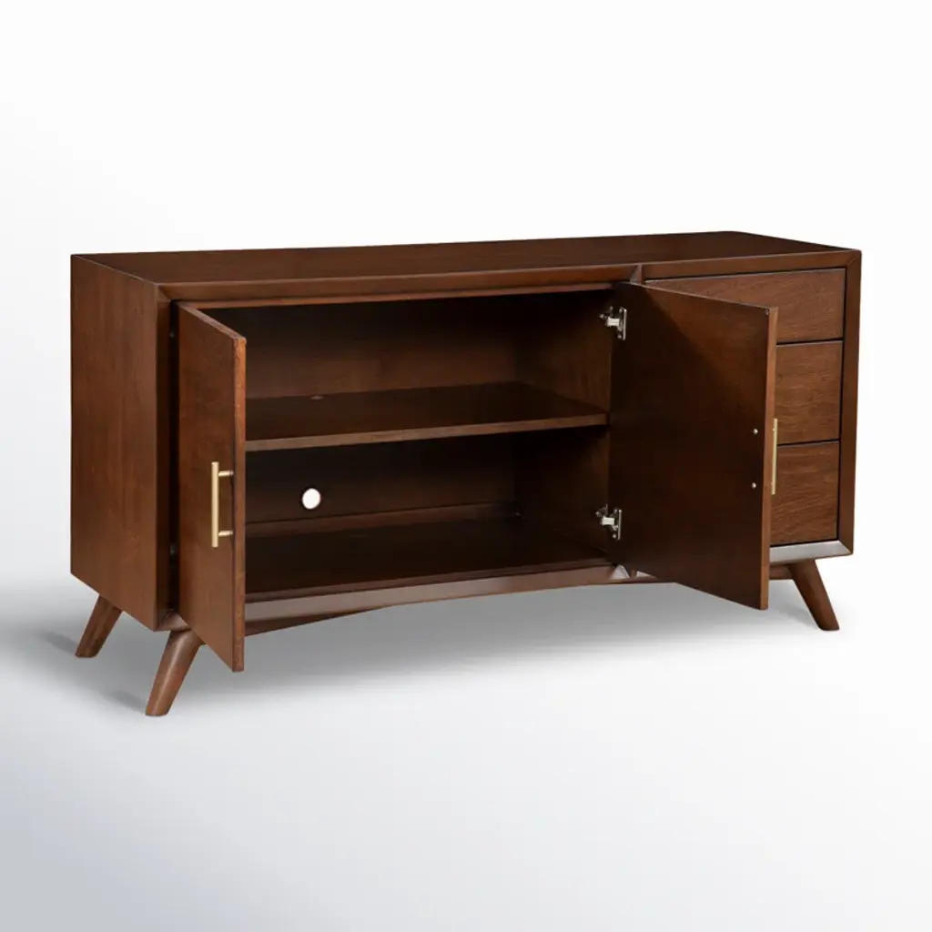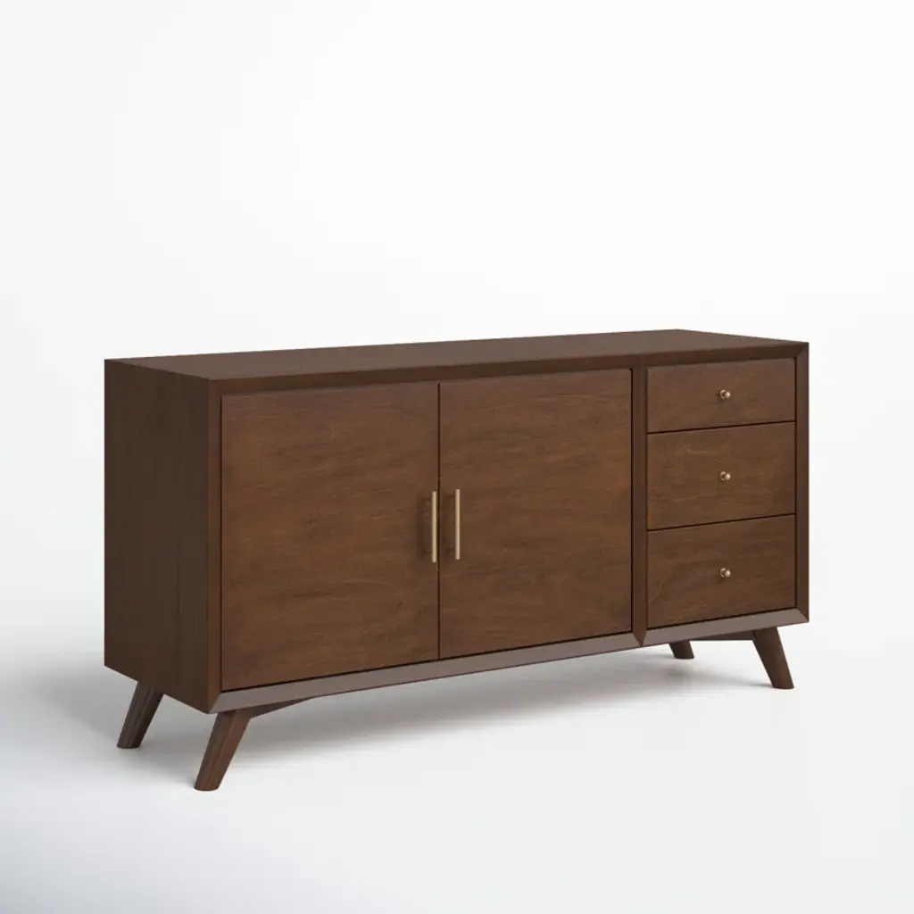 Clean lines, modern times. This sideboard features beveled front edges and tapered, flared legs that work together to create a silhouette straight from the '60s. Scratch- and water-resistant kiln-dried wood has a distinctive finish, and a two-door cabinet and drawers give you space for all your dining and living room essentials. A cable management system keeps cords tangle-free.