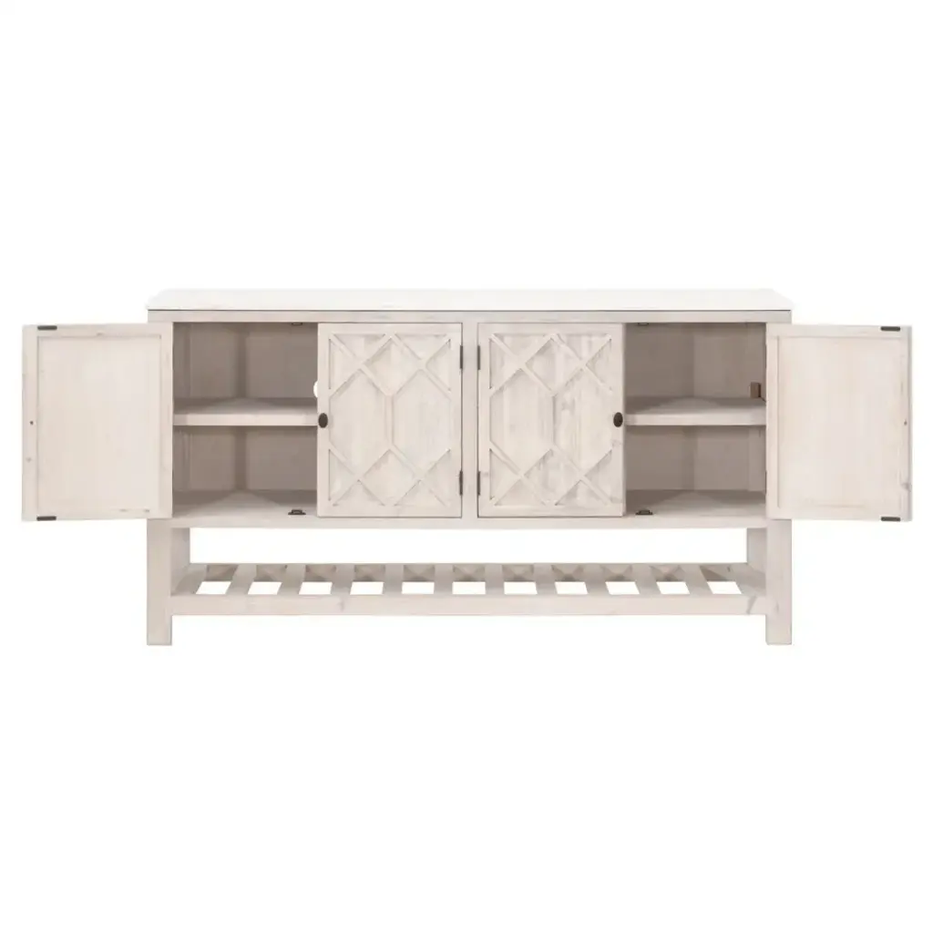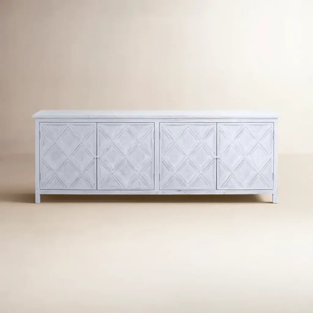 This exquisite quartz-topped media sideboard can also function as a dining sideboard or entryway cabinet. It is constructed with a solid quartz top designed to resemble white and gray marble and a solid wood base with a white-wash finish. It features two large storage cabinets with a diamond design on the doors. Each cabinet has a single shelf and a cord management hole, allowing ample storage space and a convenient way to hide unsightly wires and devices. The trestle base ties in a touch of farmhouse style as well. This would make a beautiful addition to any living room, bedroom or foyer.
