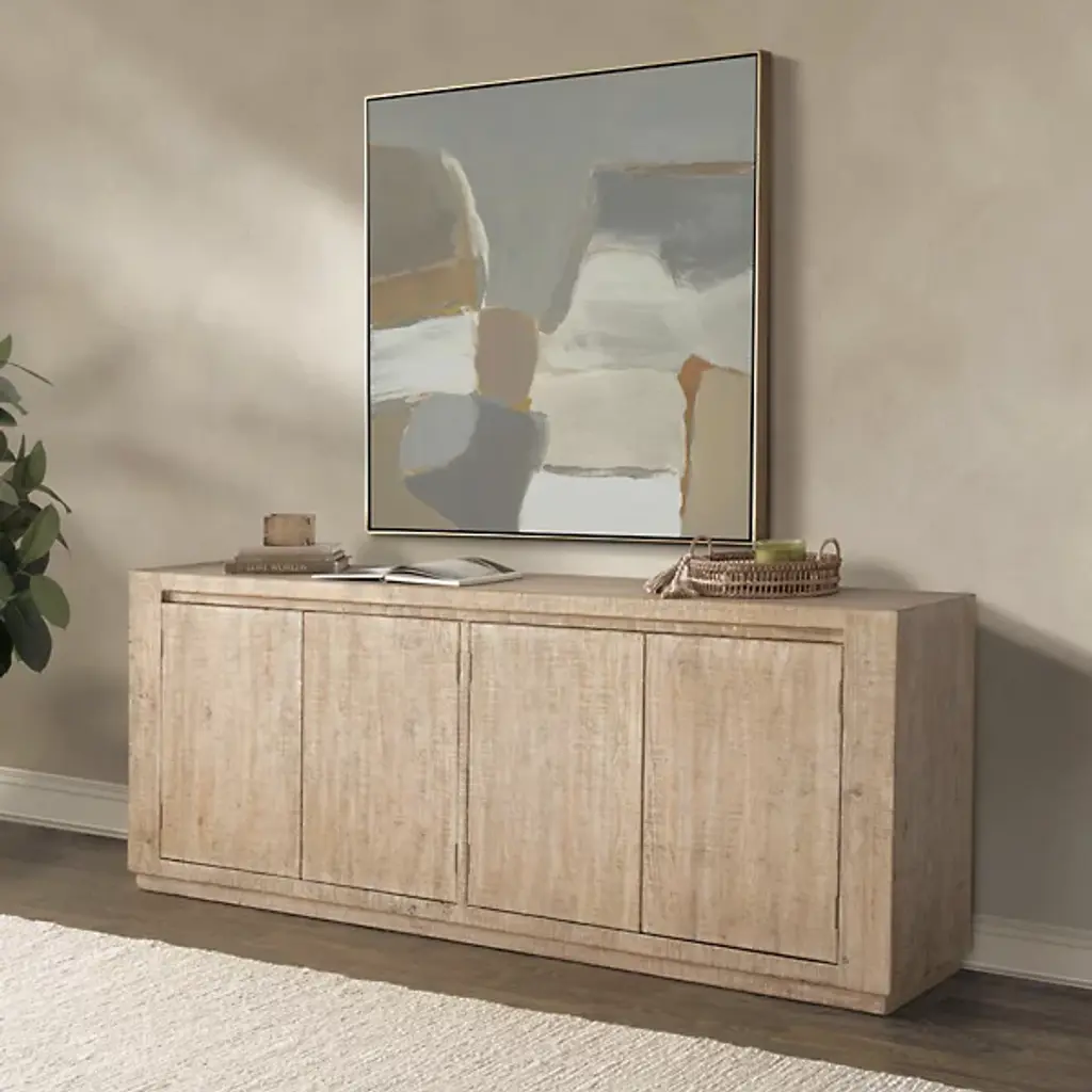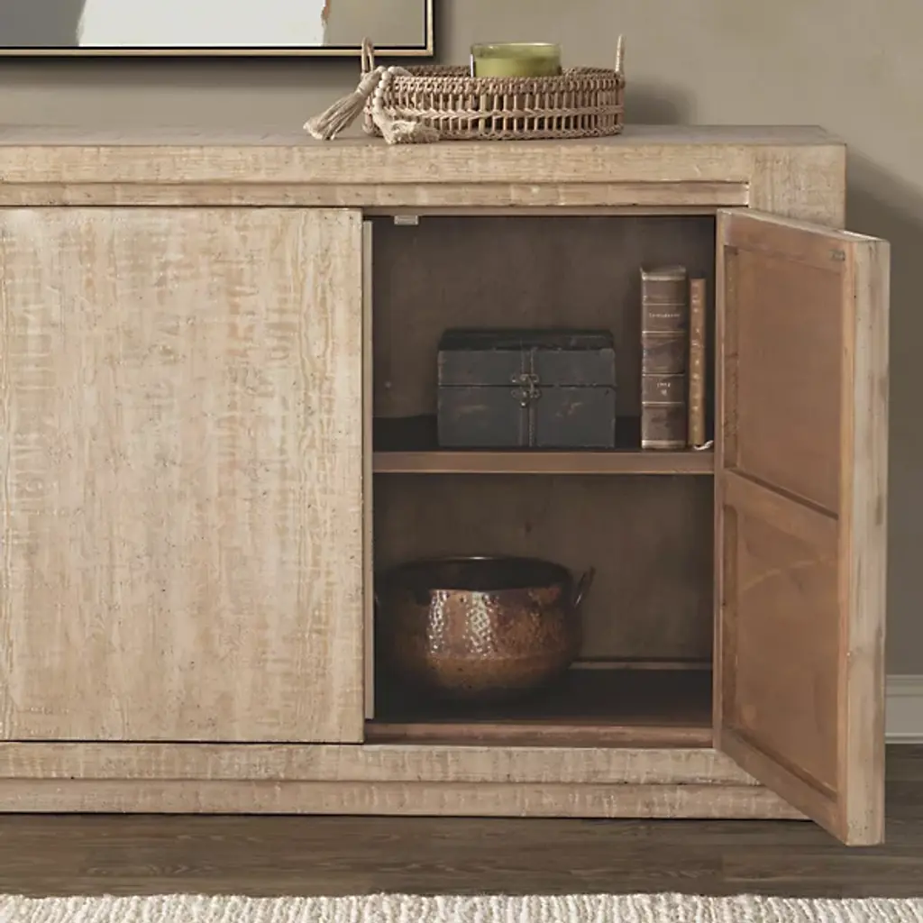 Crafted from reclaimed pine, the Wolden Sideboard from Classic Home brings rustic charm and modern functionality to any space. Its clean-lined design highlights the natural wood grain, creating a warm and timeless aesthetic. Hidden carved door scoops add elegance, blending seamlessly into the minimalist look. Inside, adjustable shelves offer flexible storage for dining essentials, tableware, or decorative pieces. Sustainable and stylish, it’s an ideal addition to contemporary, rustic, or modern farmhouse kitchens, dining rooms, or living spaces.