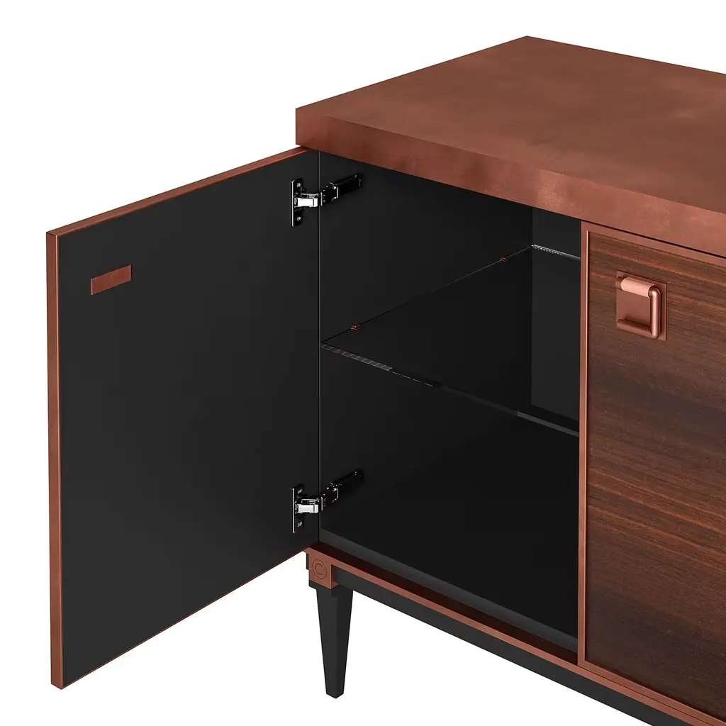 Inspired by mid-century, modern furniture design, this refined sideboard will be at home in modern and contemporary decors with its simple silhouette that exudes timeless elegance and formal balance. Adorned with a lacquer-finished eucalyptus veneer, the frame has four doors (three in wood and one with a black-lacquered panel) and a stunning top in metal with a brushed-copper finish, matching the details that outline the profile of the piece and the four knobs in the shape of the company logo. Supported by tapered legs, this sideboard will provide storage space in any living or dining room.