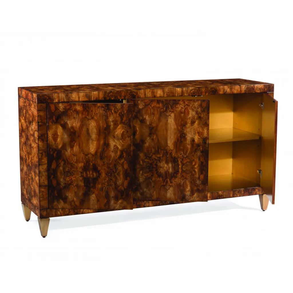 The natural beauty of the matched European walnut burrs are fully shown by this three-door sideboard with tapered Aztec gold legs. There is one adjustable shelf to each cupboard.