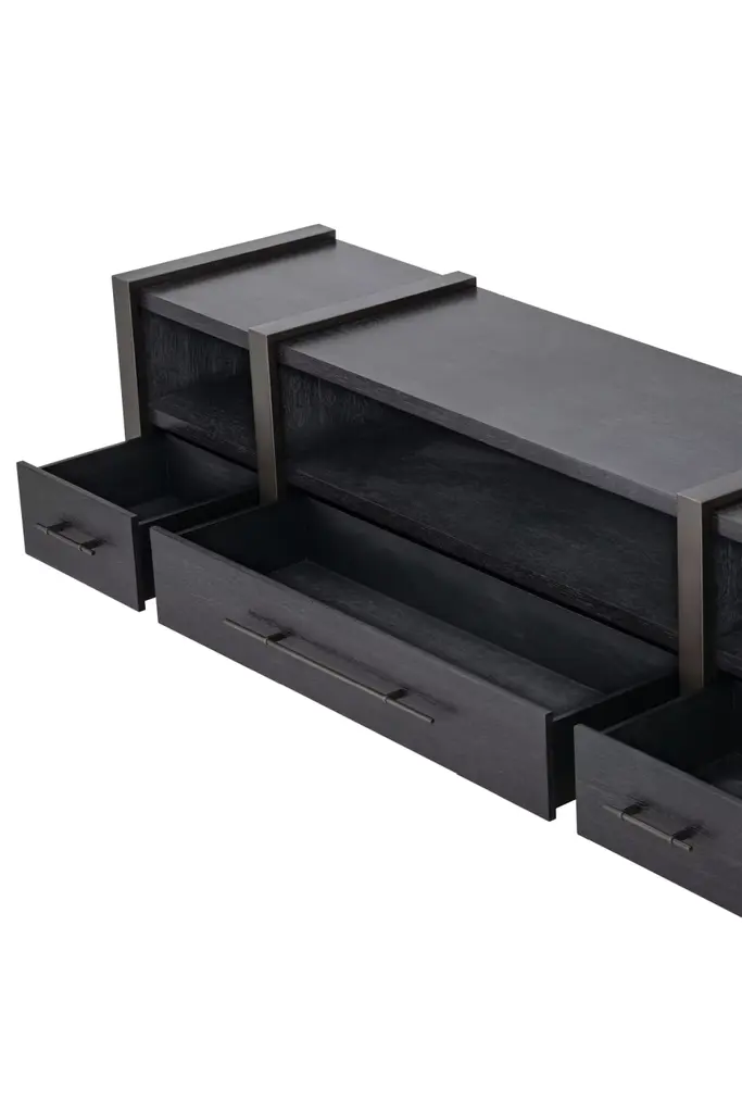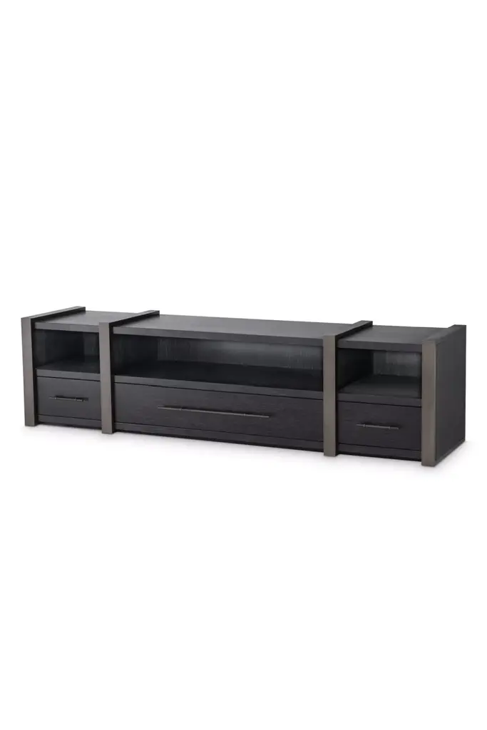 Practical and stylish, the contemporary Canova Cabinet offers plenty of storage space with an open part for displaying items, a large drawer in the middle and 2 smaller drawers on either side. The charcoal gray oak veneer of the case goes well with the medium bronze finish of the frame and handles.