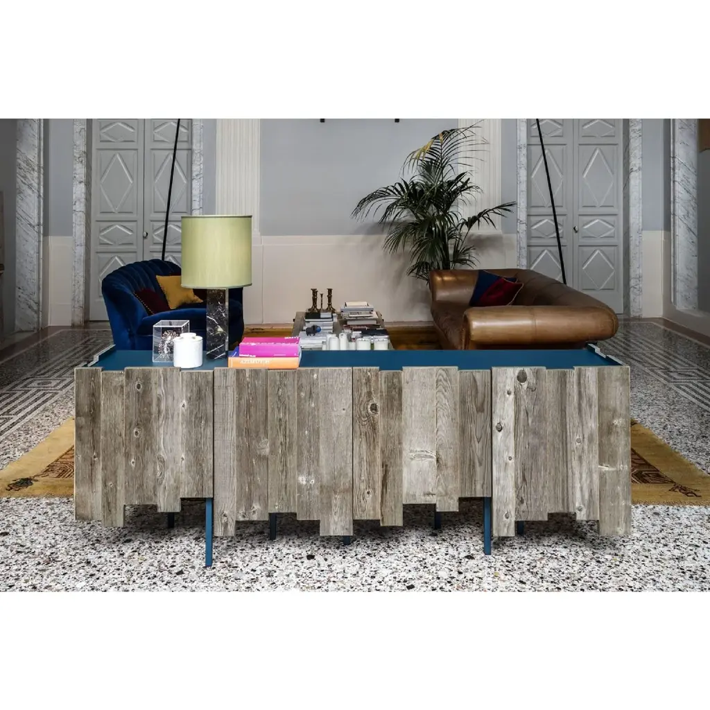The Wooden Plank Rustic Sideboard from Mogg Zio Tom is a minimalist yet visually striking piece that will add a touch of luxury to your home. Made from reclaimed antique larch wood, each door and side features unique irregularities that add to its charm. With four doors and two interior shelves, this sideboard offers ample storage space for all your belongings. The internal structure and top are lacquered in the color of your choice, making this a truly customizable and elegant piece of furniture.