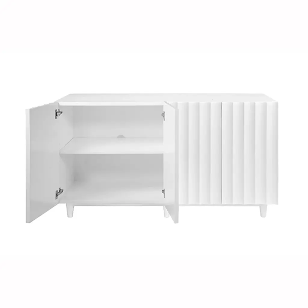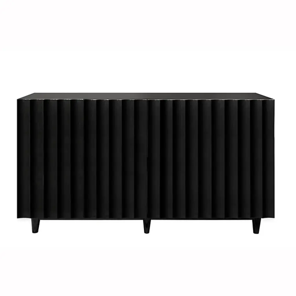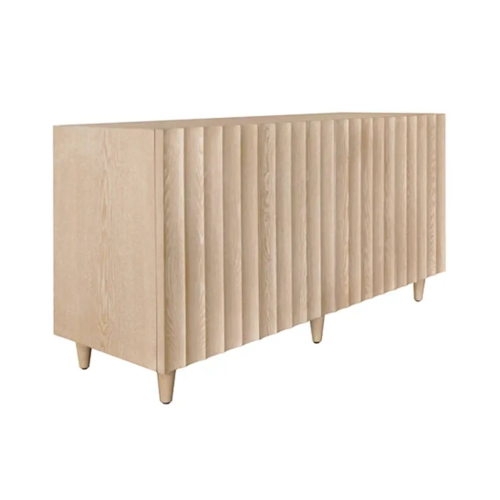 Make a bold yet minimalist statement with the Worlds Away Odette Cabinet. Its unique, flowing scalloped design conceals four cabinet doors, revealing a wealth of storage space within. This piece is as captivating as it is practical, offering both beauty and functionality.