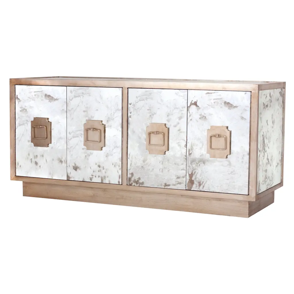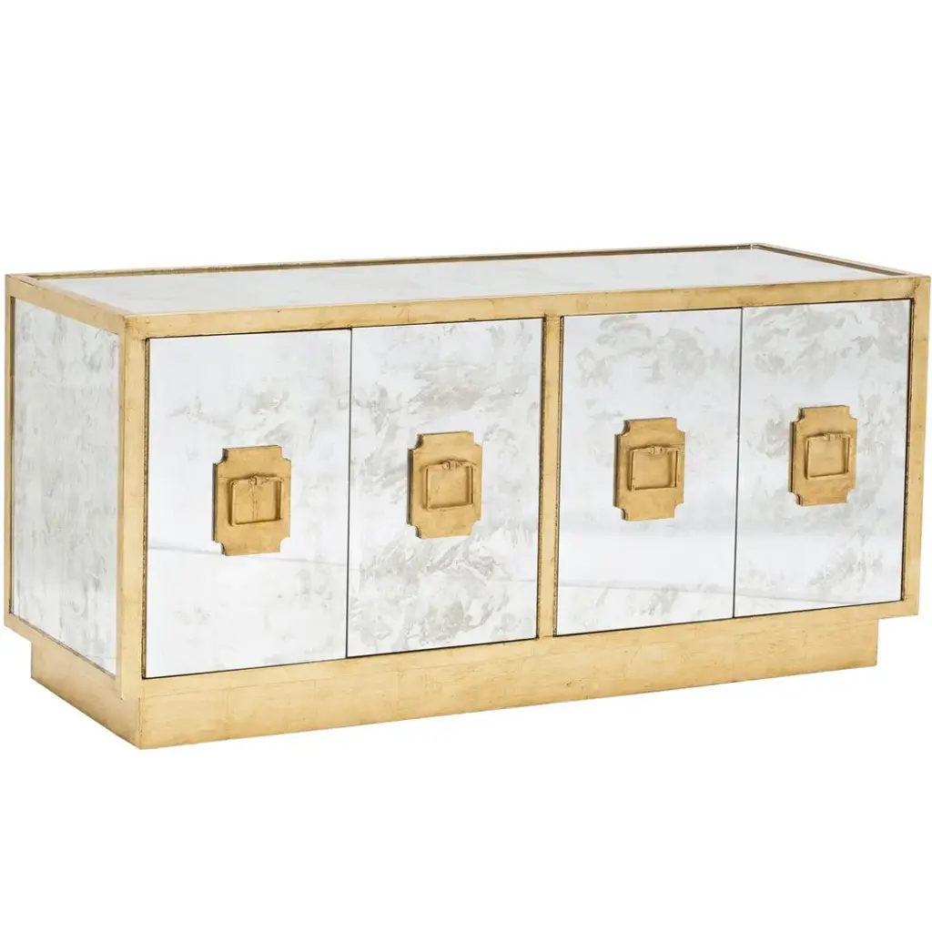 Worlds Away Ponti antique mirror four-door entertainment console or sideboard with gold or silver leaf detailing.