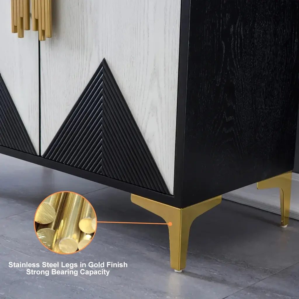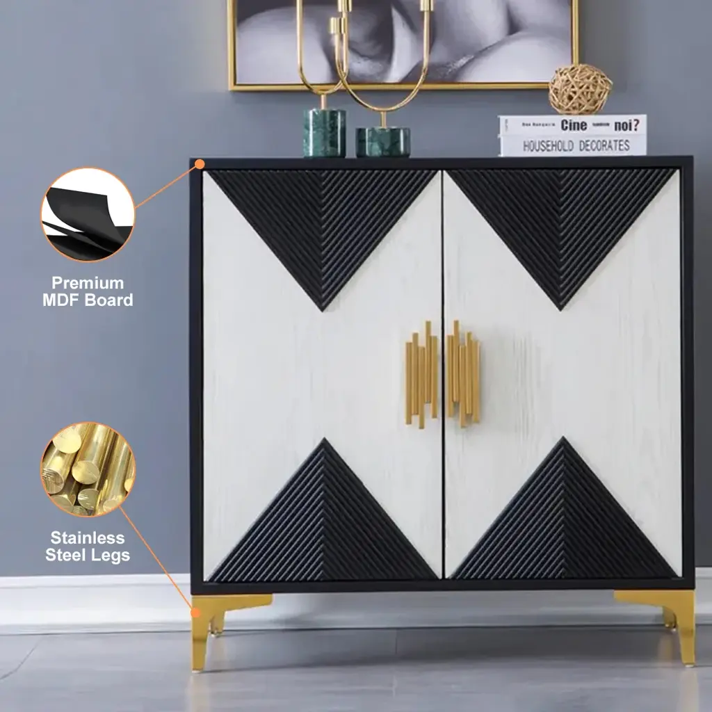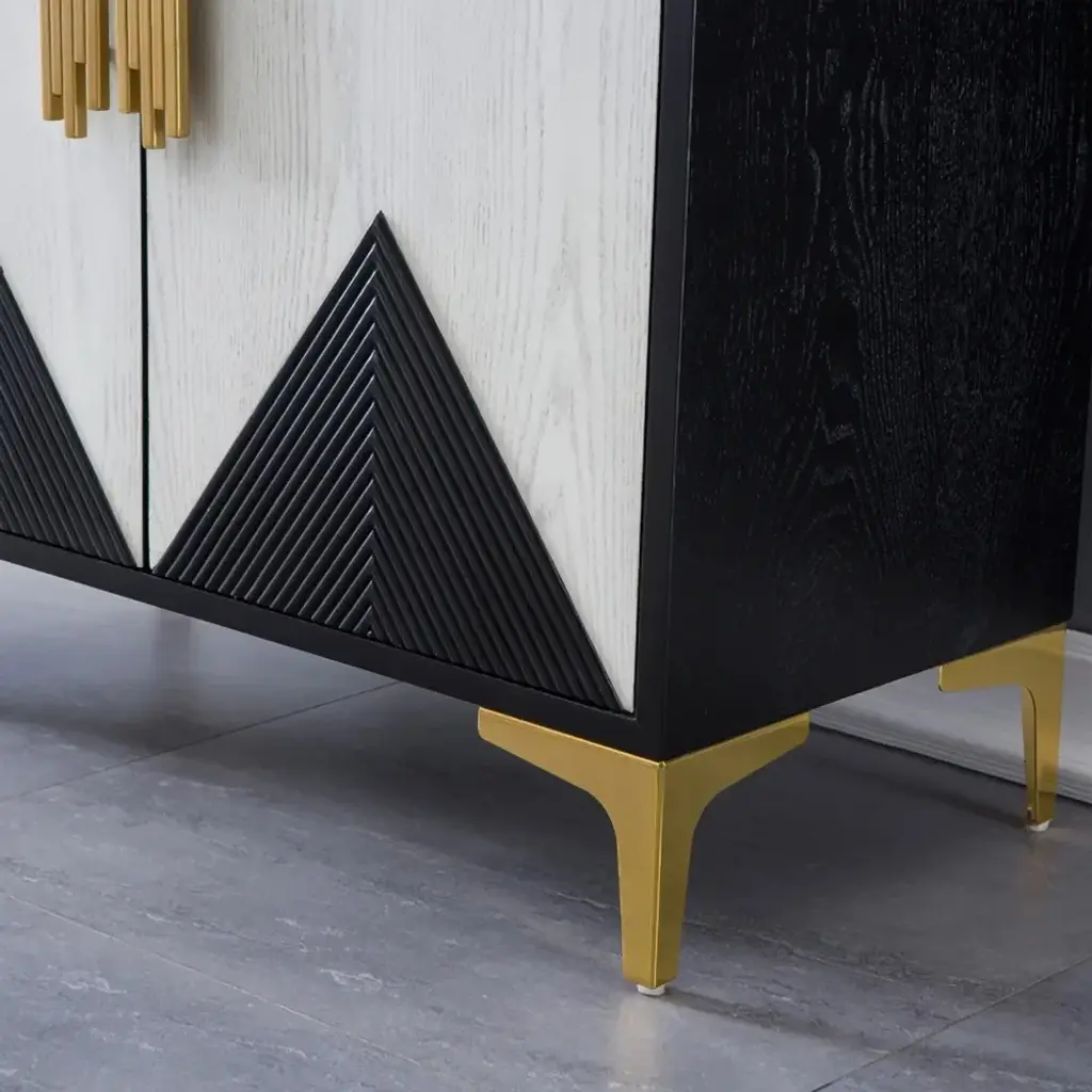 This striking black and white sideboard features a dynamic checkerboard door design with a black wood-grain top. Crafted from durable MDF with golden stainless steel handles and legs, it offers 2 doors with adjustable shelves. A perfect fusion of graphic modern style and practical storage functionality.