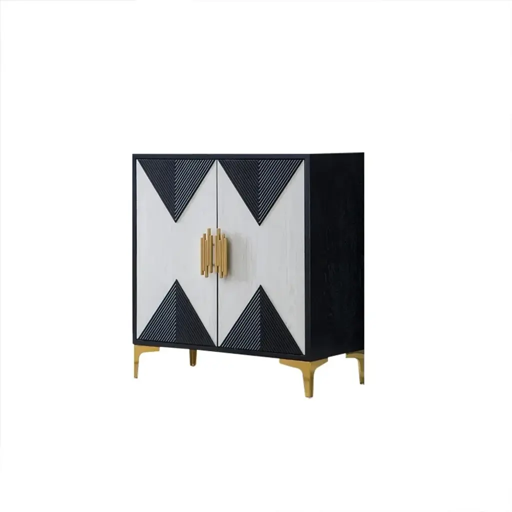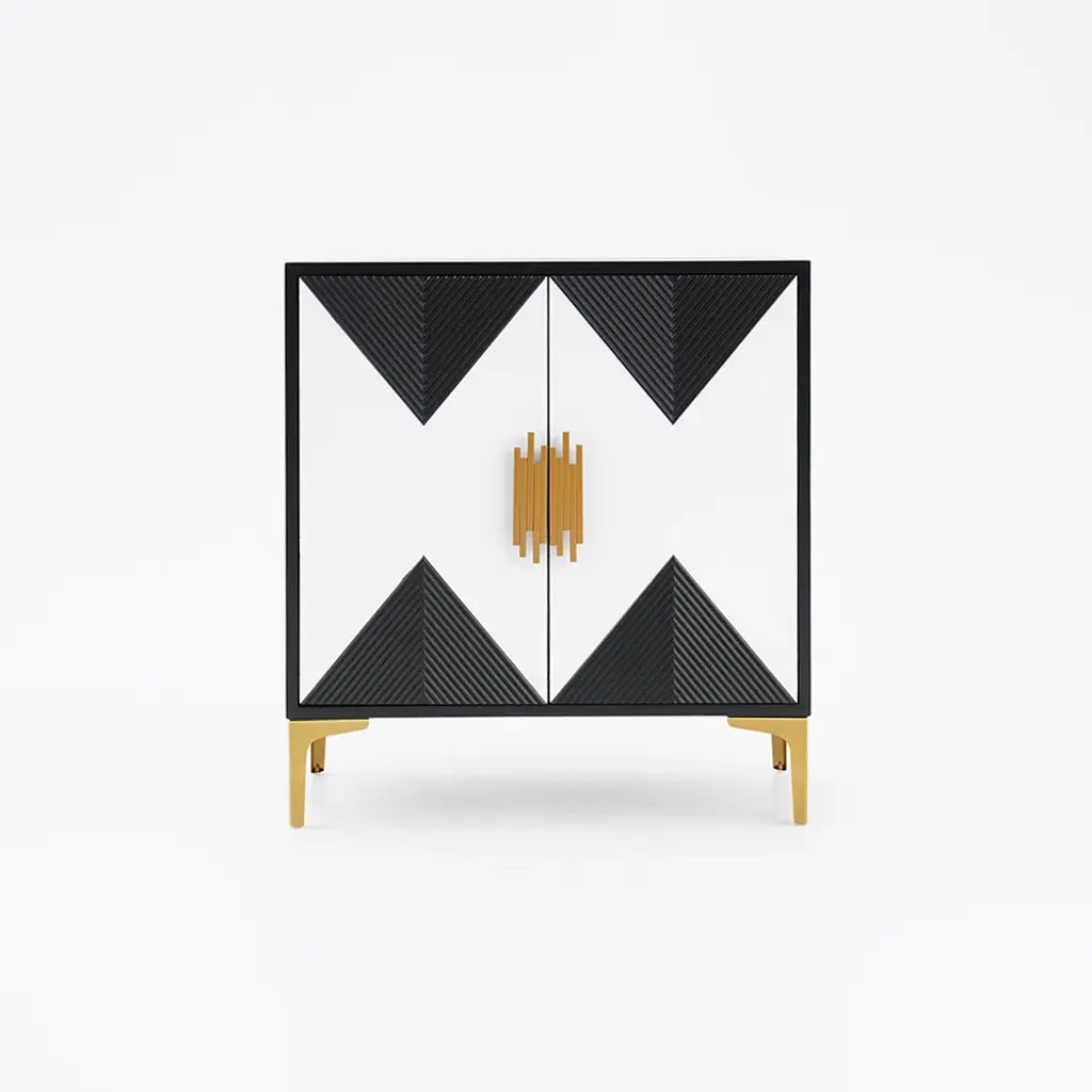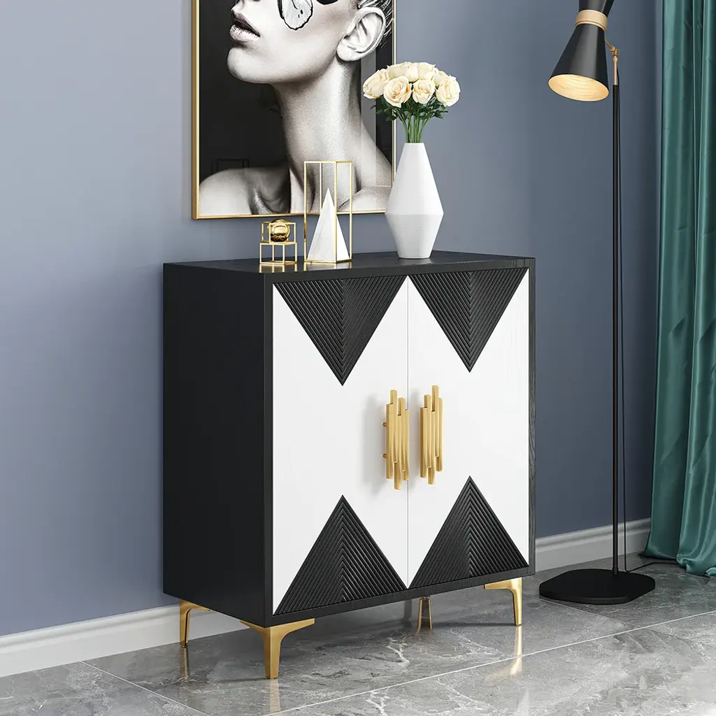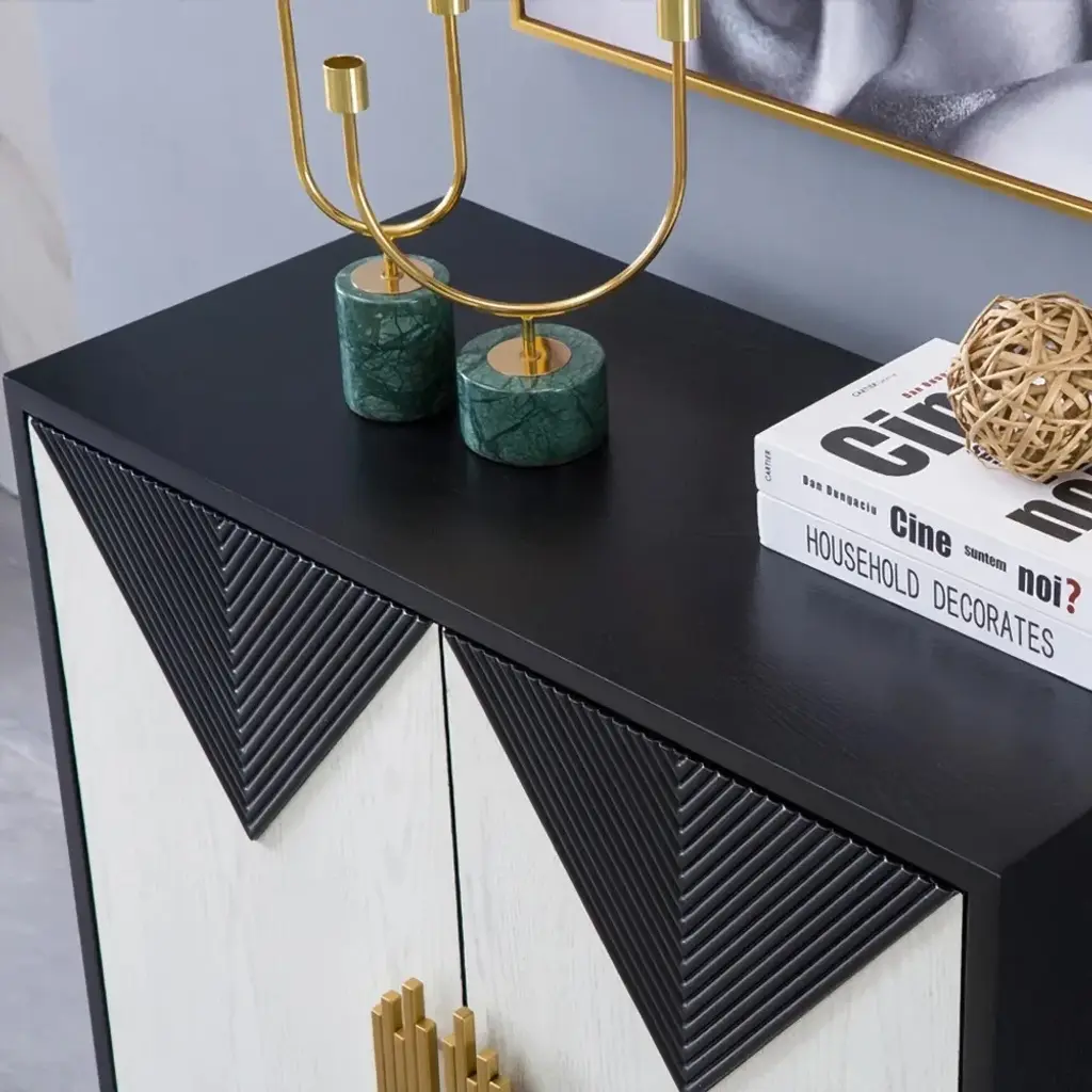 This striking black and white sideboard features a dynamic checkerboard door design with a black wood-grain top. Crafted from durable MDF with golden stainless steel handles and legs, it offers 2 doors with adjustable shelves. A perfect fusion of graphic modern style and practical storage functionality.