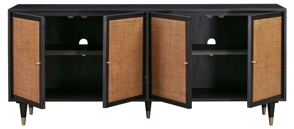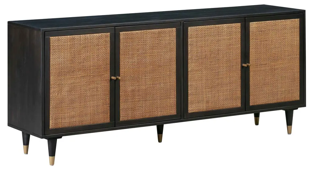 The silhouette is classically simply, but this handcrafted sideboard nonetheless makes a major style statement. That's thanks to the juxtaposition of the black wood frame and the rattan panels. The brass caps on the tapered legs add subtle glimmer. Each pair of soft-close doors opens to reveal a roomy cabinet.