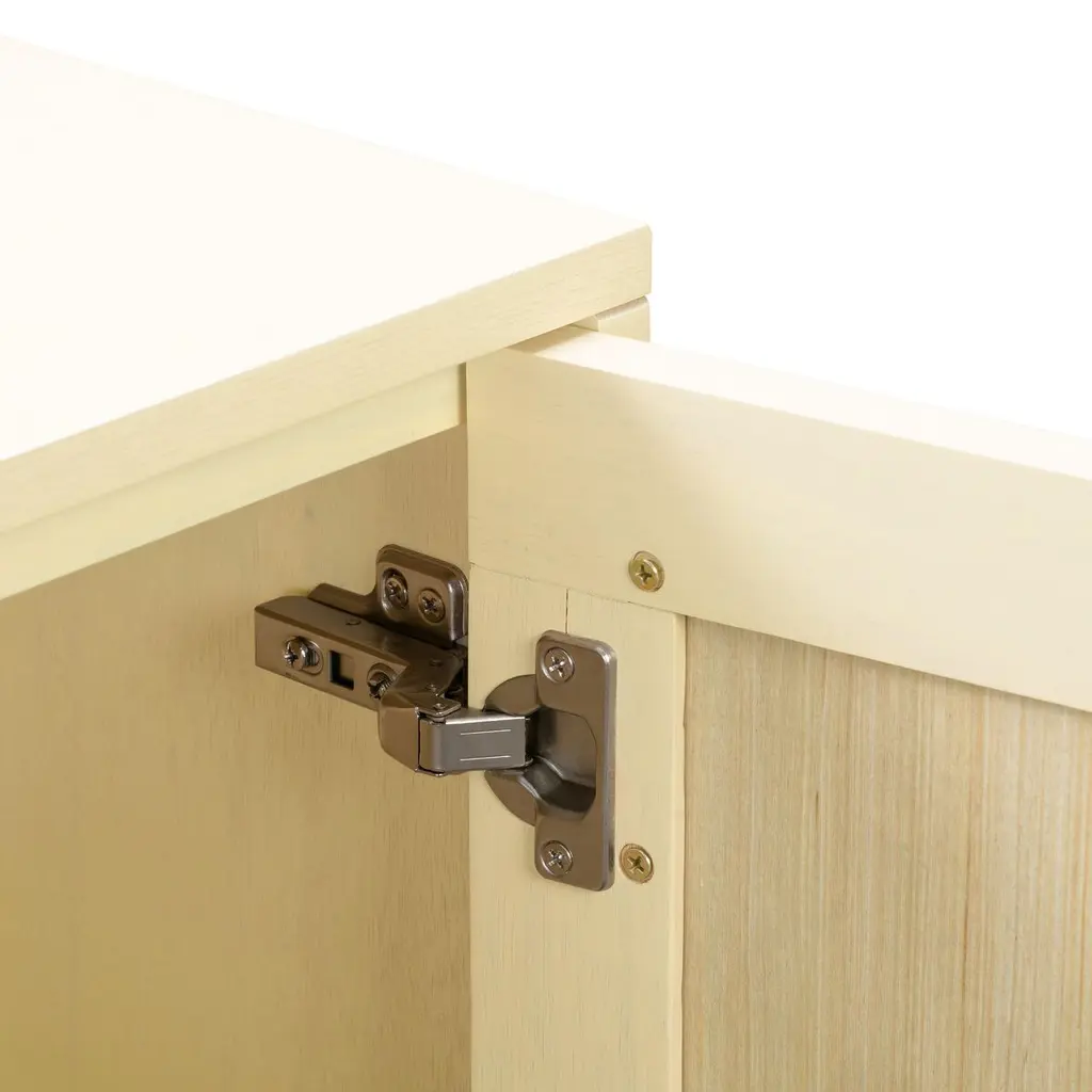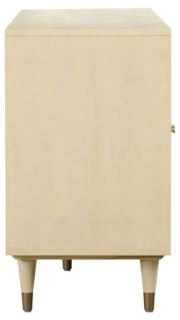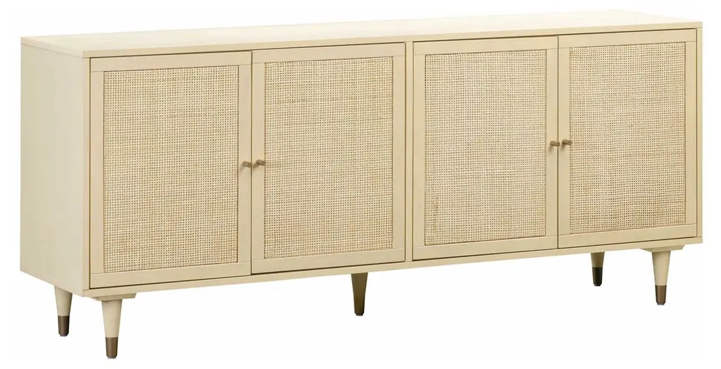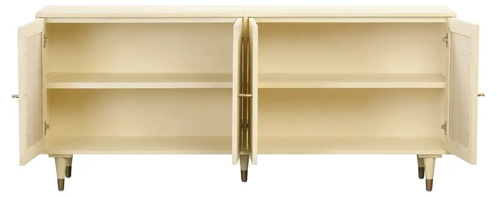 The silhouette is classically simply, but this handcrafted sideboard nonetheless makes a major style statement. That's thanks to the juxtaposition of the wood frame and the rattan panels. The brass door pulls and caps on the tapered legs add subtle glimmer. Each pair of soft-close doors opens to reveal a roomy cabinet.