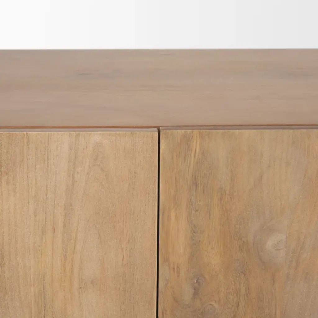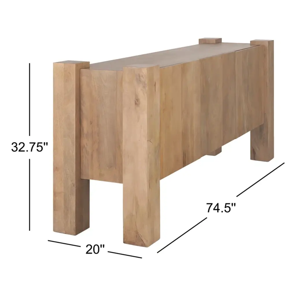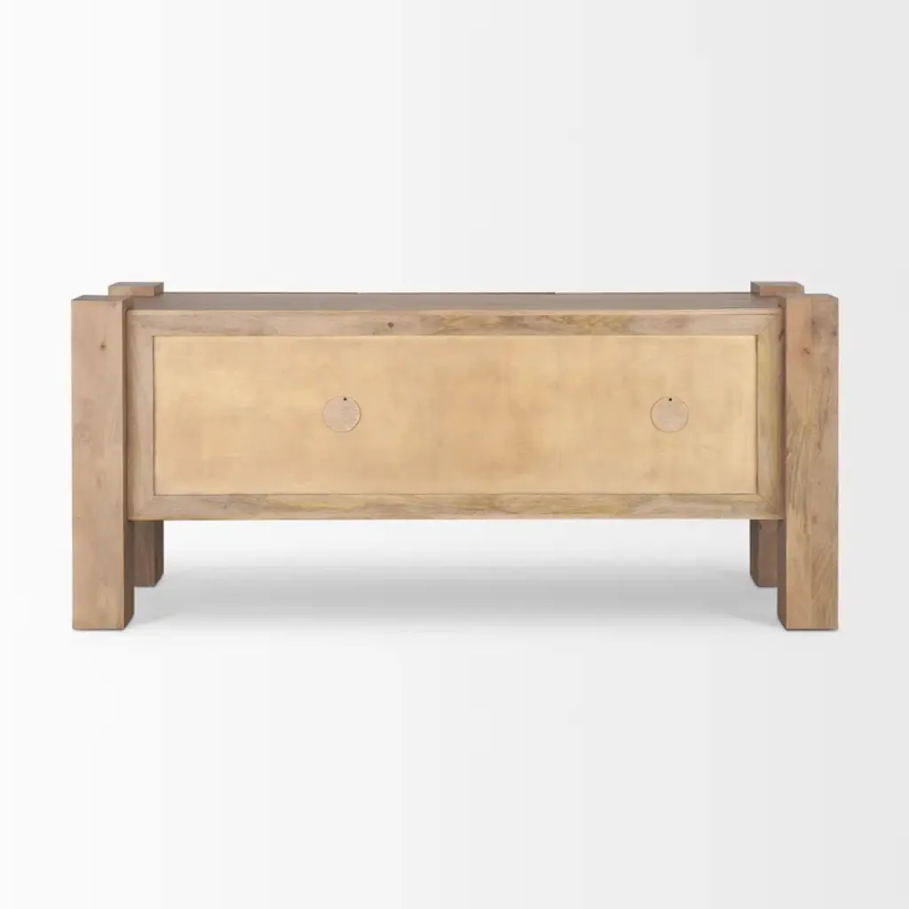 The Wynda sideboard is skillfully constructed from durable mango wood and features a rectangular form, supported by four square post-like legs, subtly elevated for a distinctive presence. Enriched with a light brown stain and complemented by nuanced white pickling, Wynda exudes a harmonious blend of durability and sophistication. The sideboard features three seamless cabinet doors that open to two shelves that span the body, one of which is removable, with thoughtful cable cutouts at each end for seamless cable management. A distinguished piece within the Wynda collection